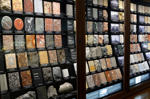 In einer großen Glasvitrine ist eine spektakuläre Halitstufe des Vorkommens von Wieliczka (Polen) von etwa 1.000 Kilogramm