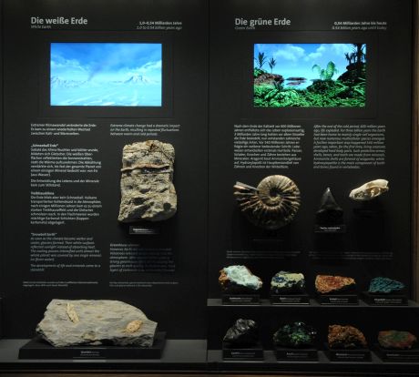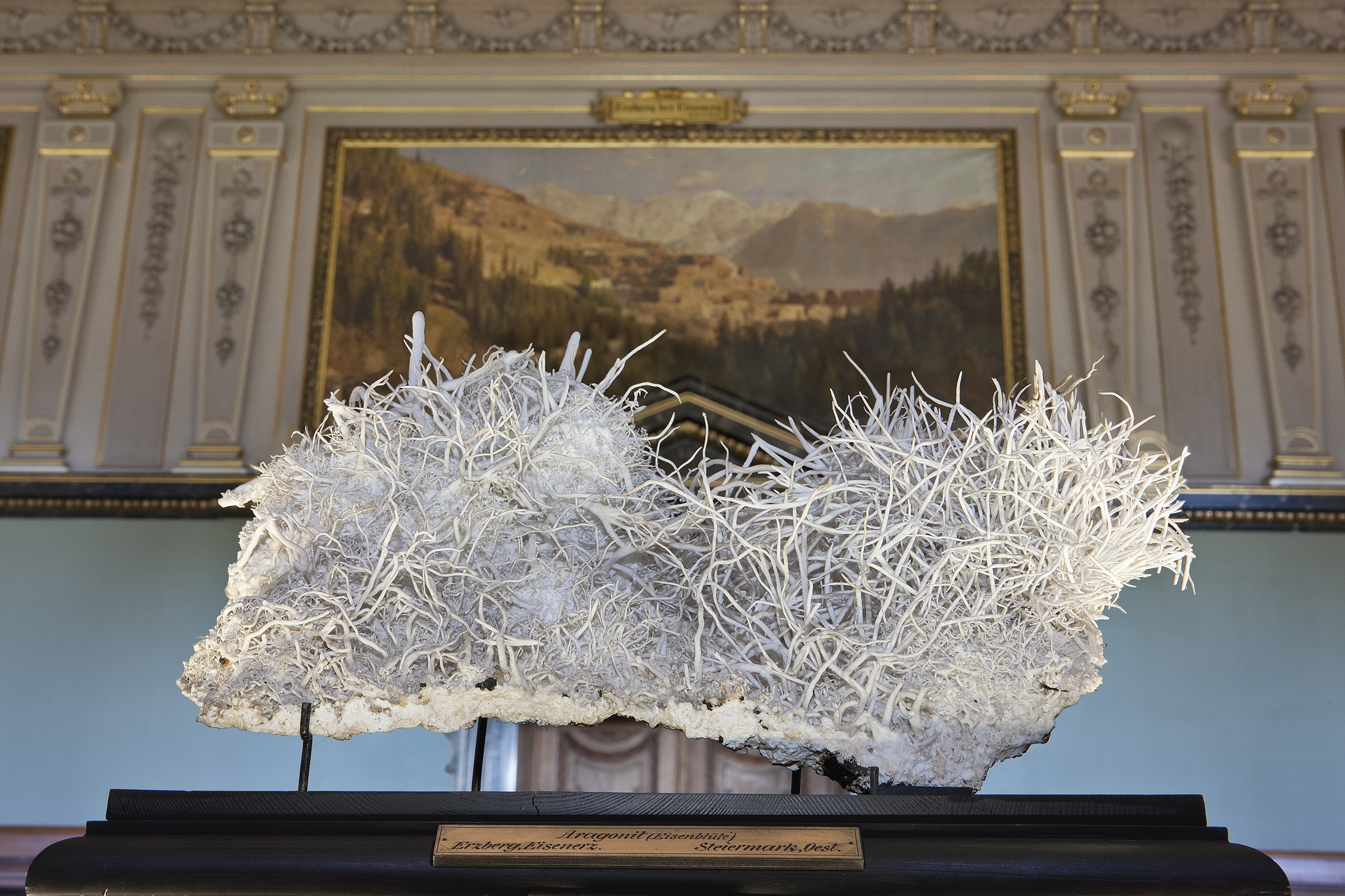 Der Saal 3 führt die Mineralsystematik fort. An der Längswand die Gemälde vom Hohen Goldberg in der Rauris (Leopold Munsch),