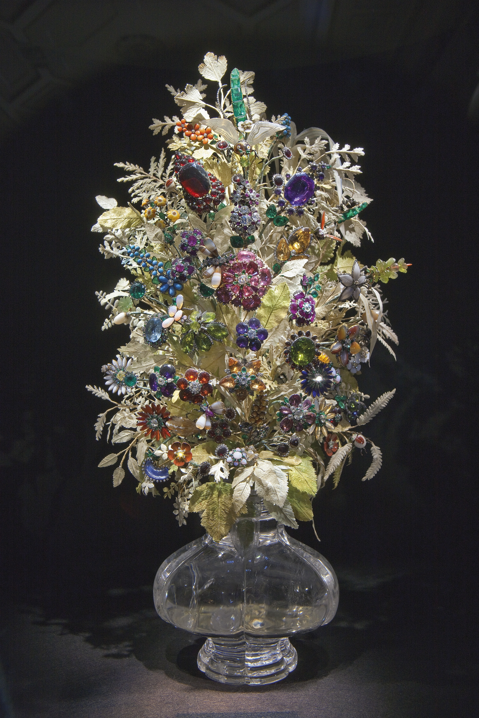 Maria Theresia, Mitregentin in den Habsburgischen Erblanden, teilte die Interessen ihres Gemahls für die Wissenschaften. Sie schenkte Franz Stephan jenen herrlichen Blumenstrauß aus Edelsteinen, der heute mit Recht als Gründungsobjekt der Edelsteinsammlung des Wiener Museums angesehen werden kann. 761 Farbsteine und organische Substanzen und ca. 2.102 Diamanten sind zur Anfertigung dieses Juwelenbouquets - einen Blumenstrauß darstellend, mit verschiedenen kunstvoll nachgebildeten Insekten, Seidenblättern, in einer Vase aus Bergkristall gestellt - verwendet worden.