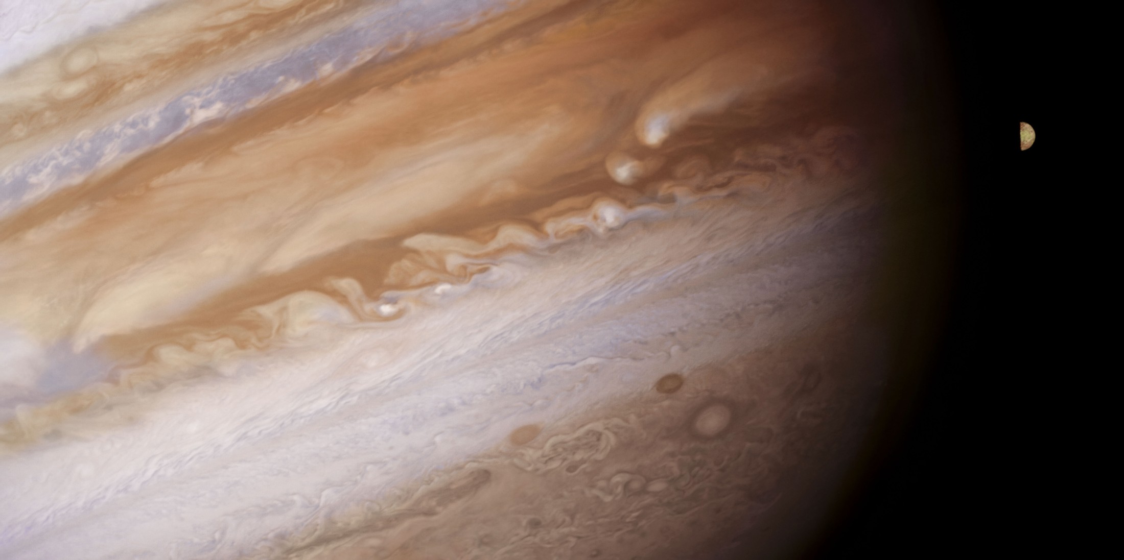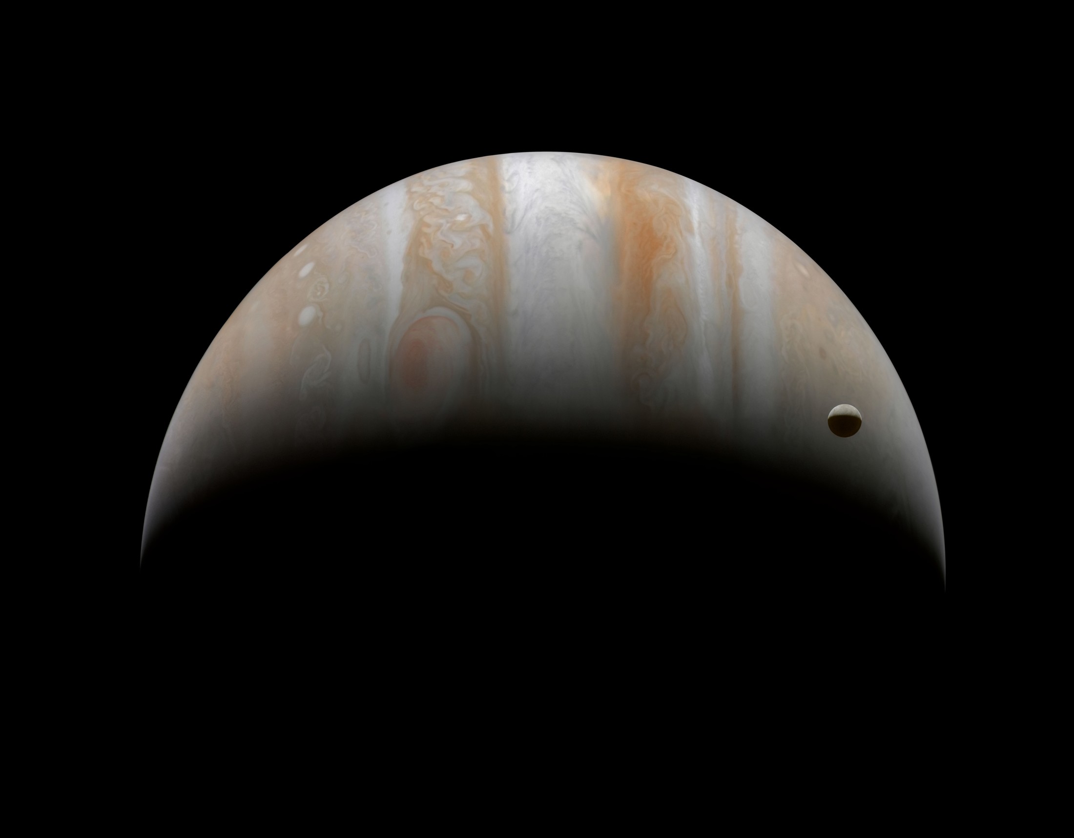 Ganymed, der größte Jupitermond, ist rechts im Bild zu sehen. Er ist der neuntgrößte Himmelskörper im Sonnensystem und