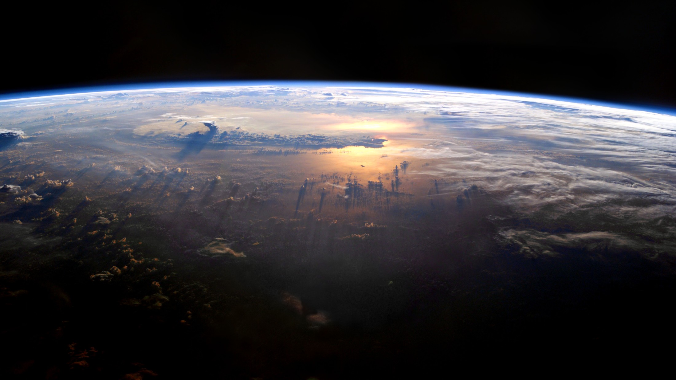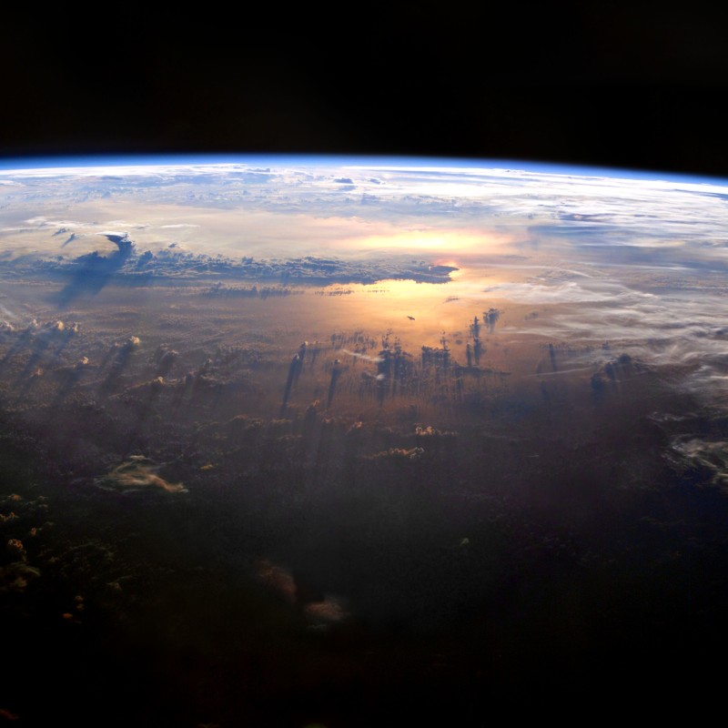 Die Sonne schimmert auf dem Pazifischen Ozean– aufgenommen von der Internationalen Raumstation (ISS) aus einer Höhe von über 400 Kilometern. Die sich auftürmende Cumulonimbus-Wolke auf der linken Seite ist durch Wasserdampf entstanden, der durch die Luftströmung in große Höhen getragen wurde. An ihrem oberen Ende stößt sie an die Grenze zur Stratosphäre und ist daher abgeflacht.