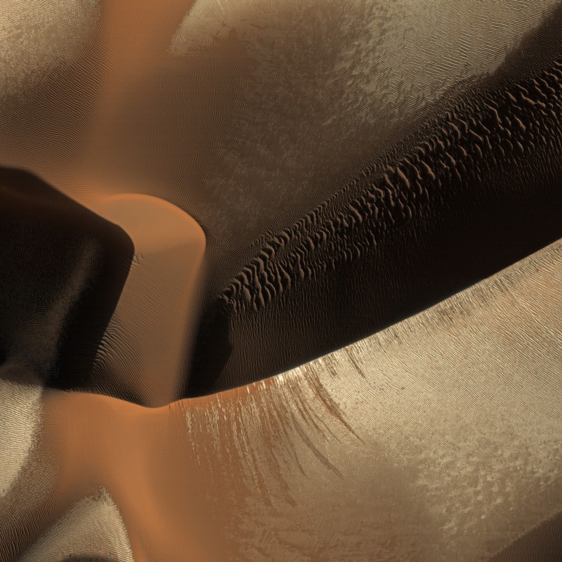 Im Winter sind die Dünen der südlichen Mars-Hemisphäre mit Kohlenstoffdioxid-Eis bedeckt, das gemeinhin auch als Trockeneis bezeichnet wird.