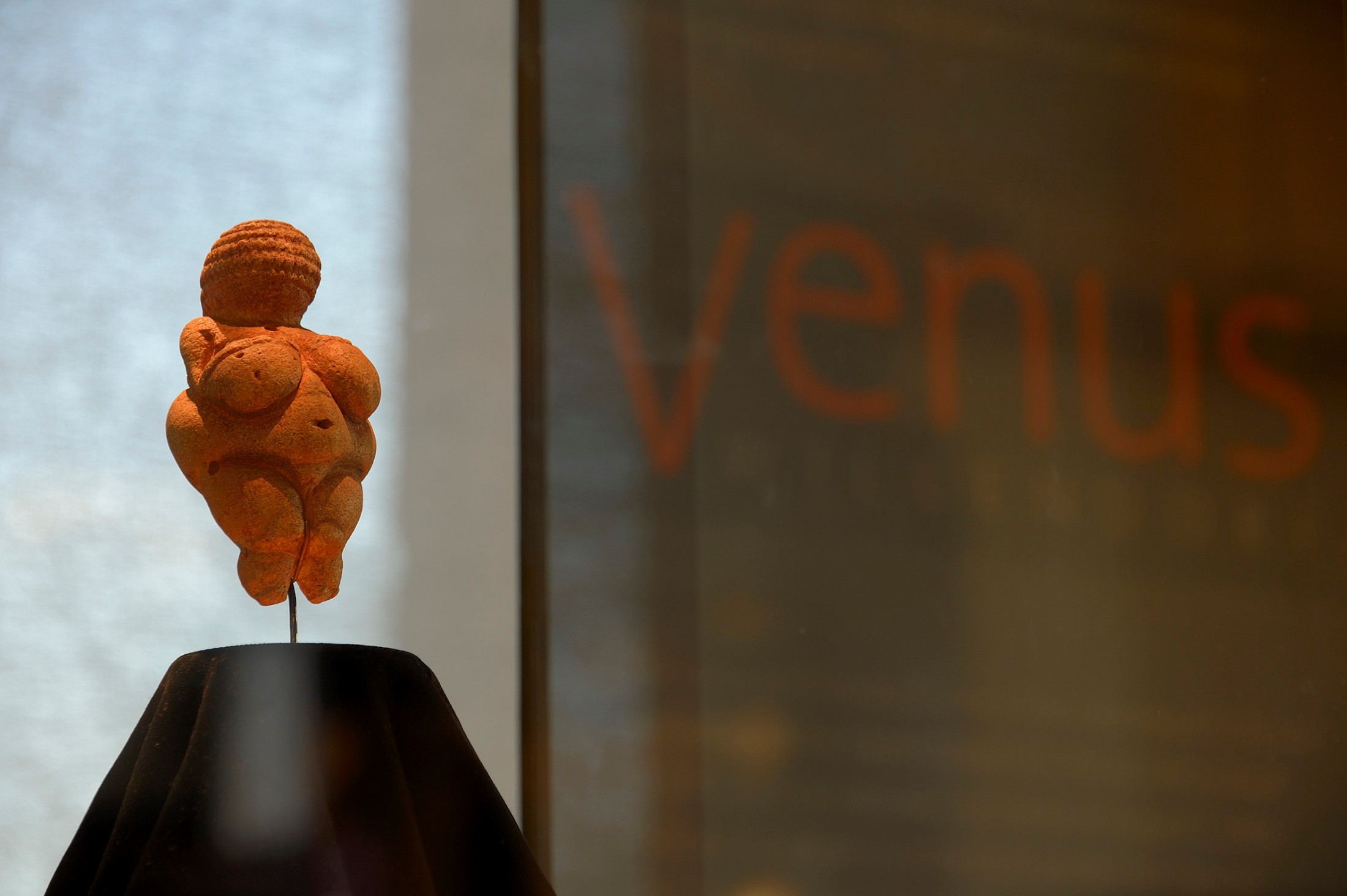 Die Venus von Willendorf an ihrem neuen Standort in Saal 4, an dem sie bis zur Fertigstellung der Schausäle der Prähistorischen Abteilung zu sehen ist.