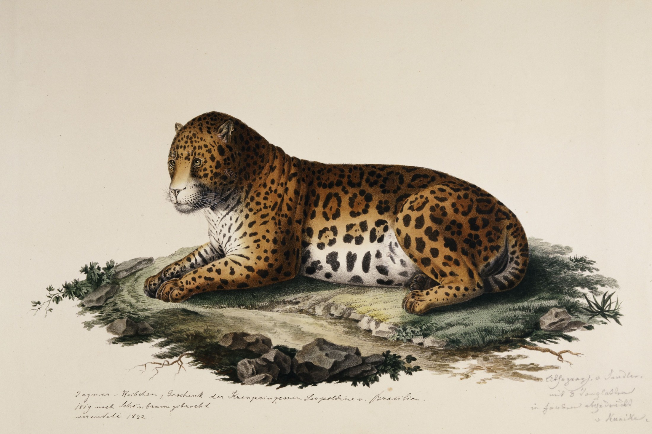 „3-ton Lithografie“ Druck von Adolph Friedrich Kunike, H 31 x B 45 cm, um 1819. Das Jaguarweibchen war ein Geschenk der Kaiserin