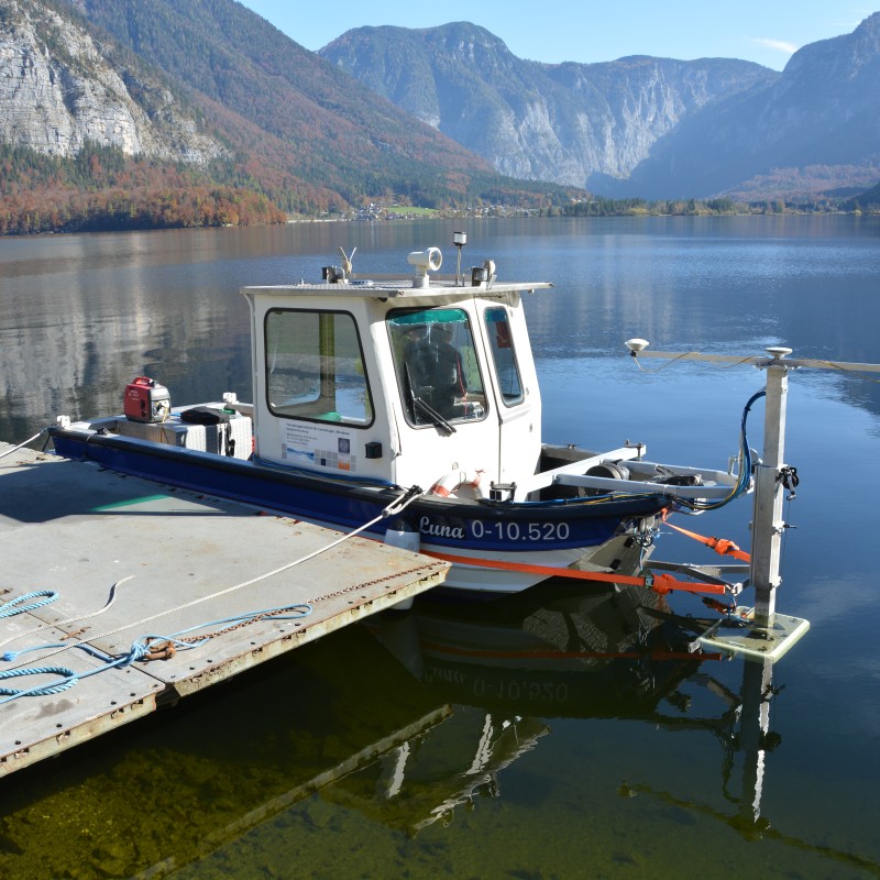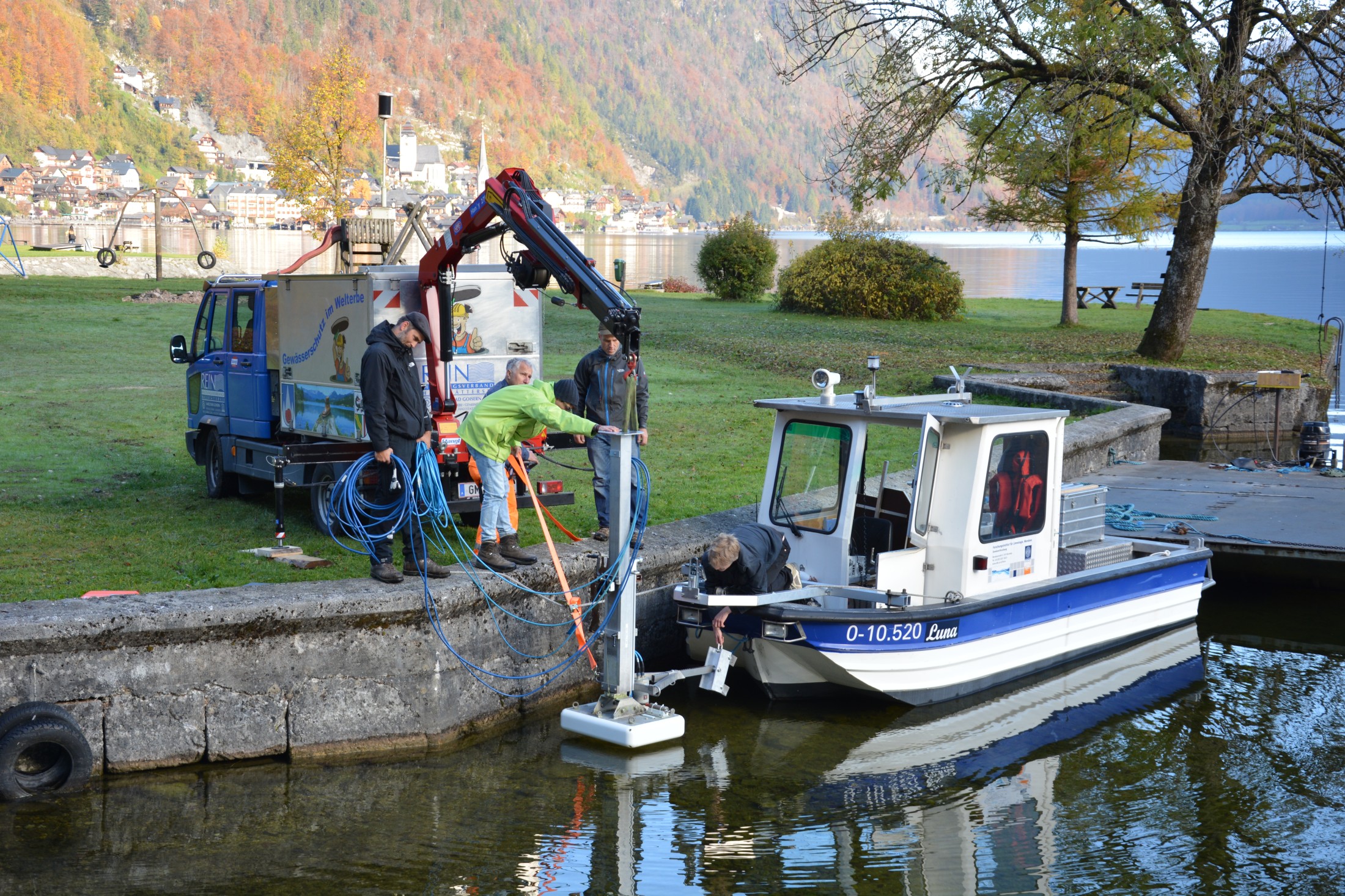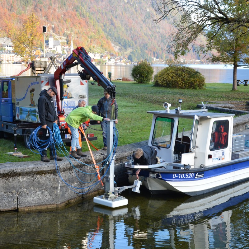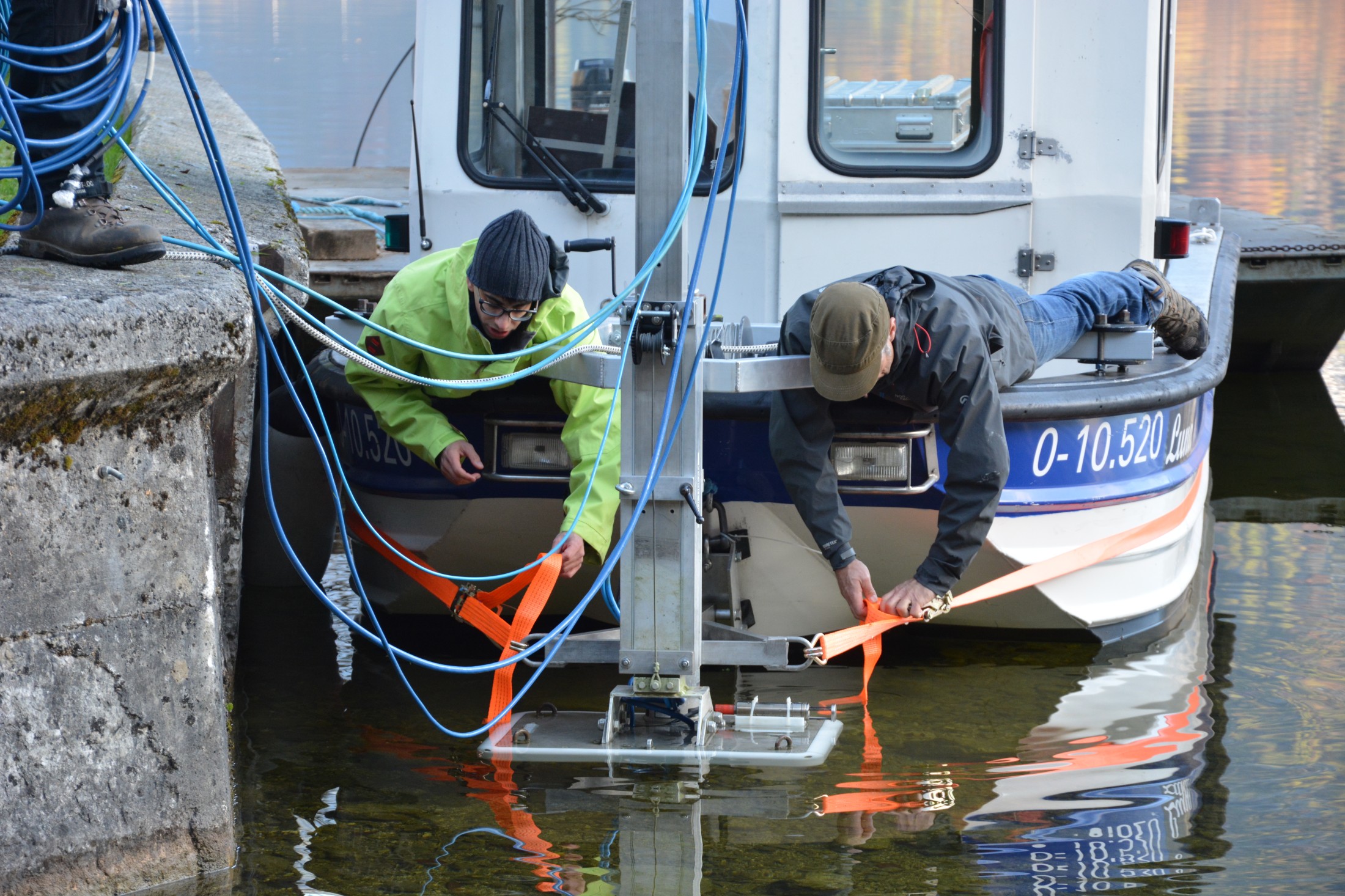 Das hochpräzise Fächerecholot der Universität Bern wird mit Unterstützung des Reinhalteverbands Hallstatt an die Luna montiert.