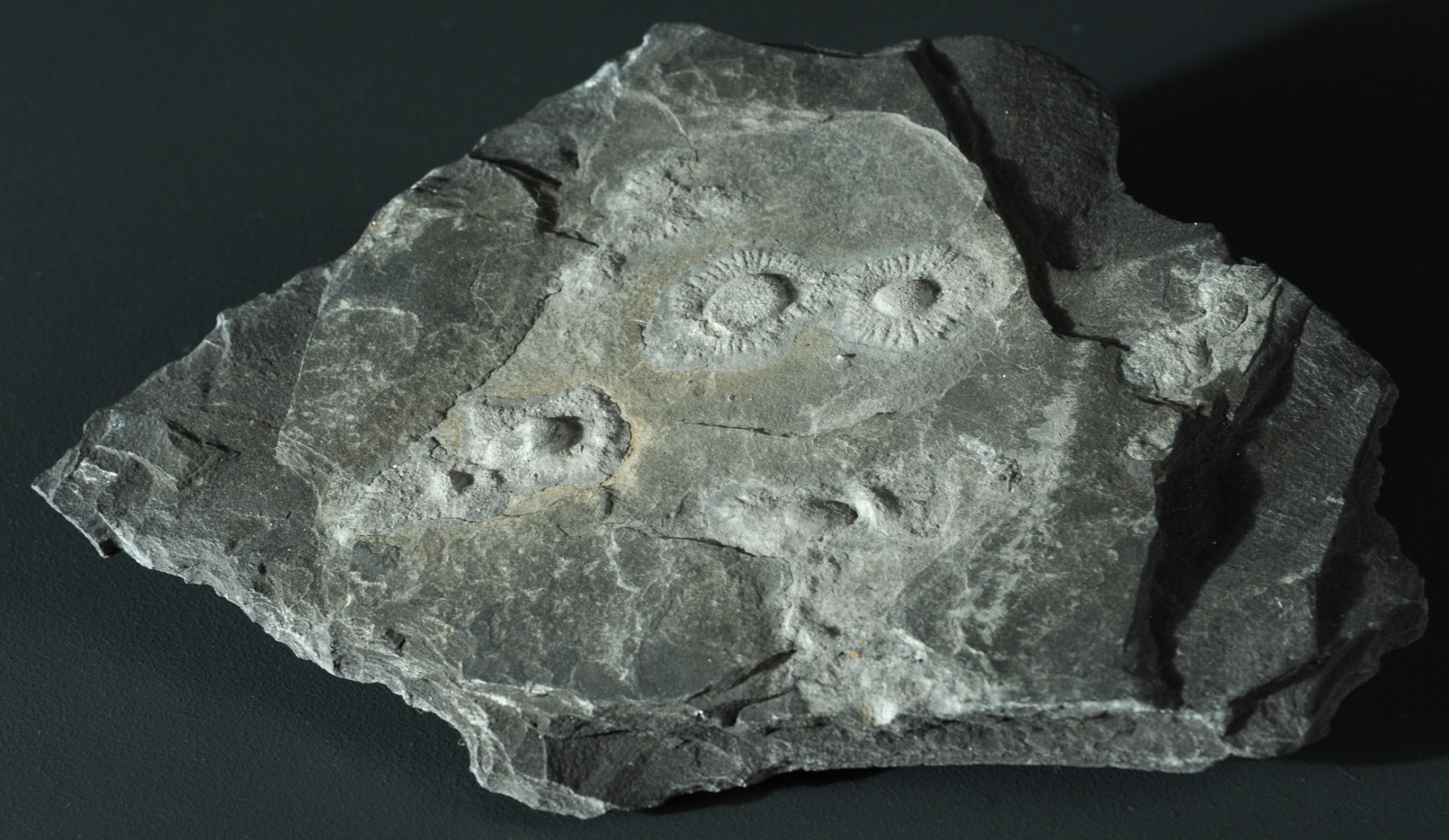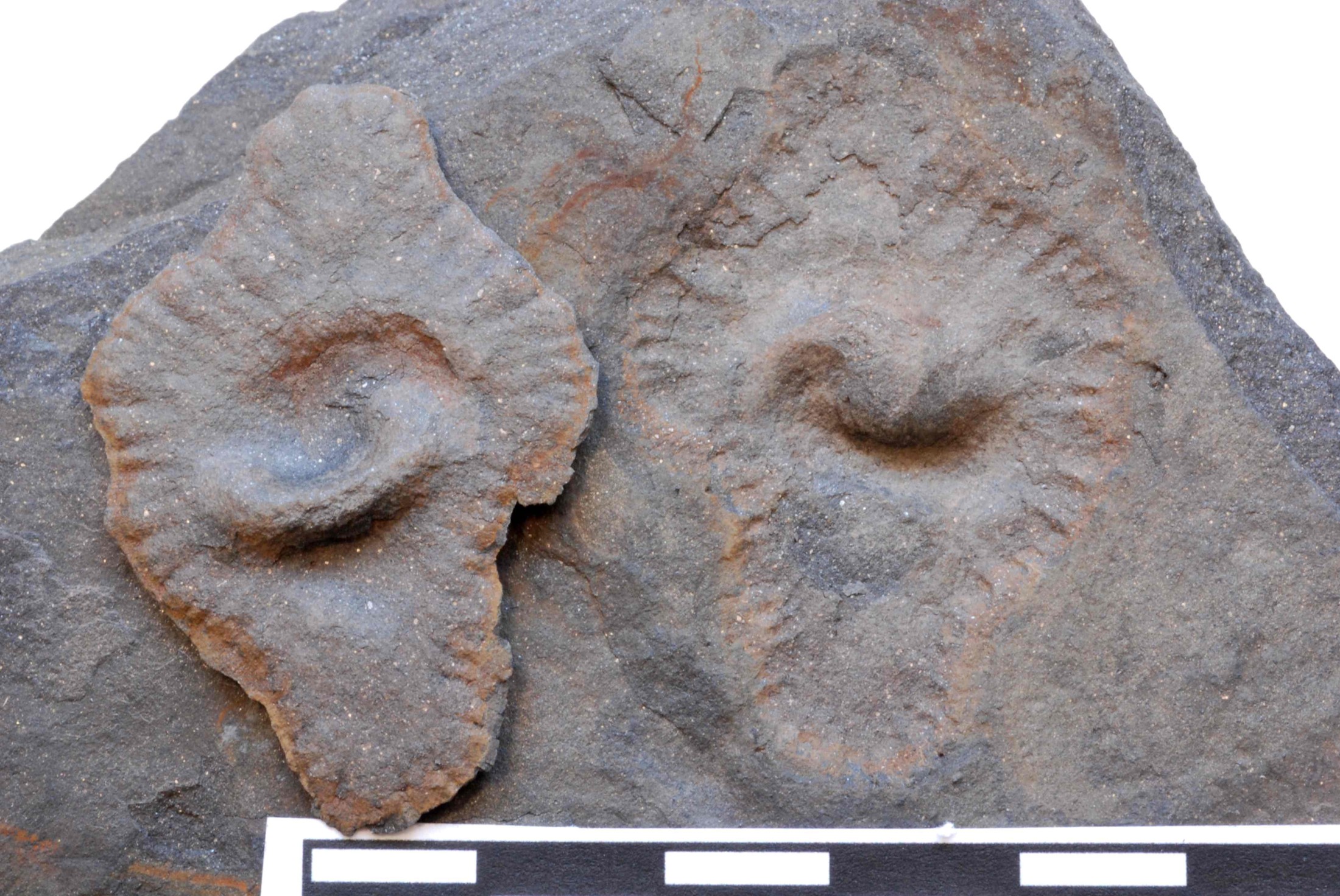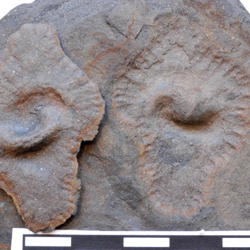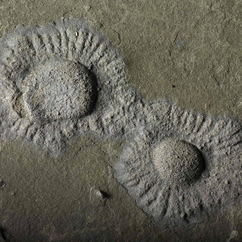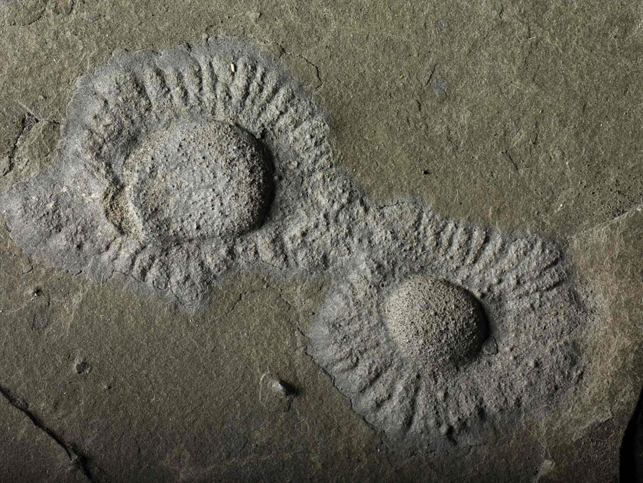Two fossils on a slab showing the typical central body and fringe; width