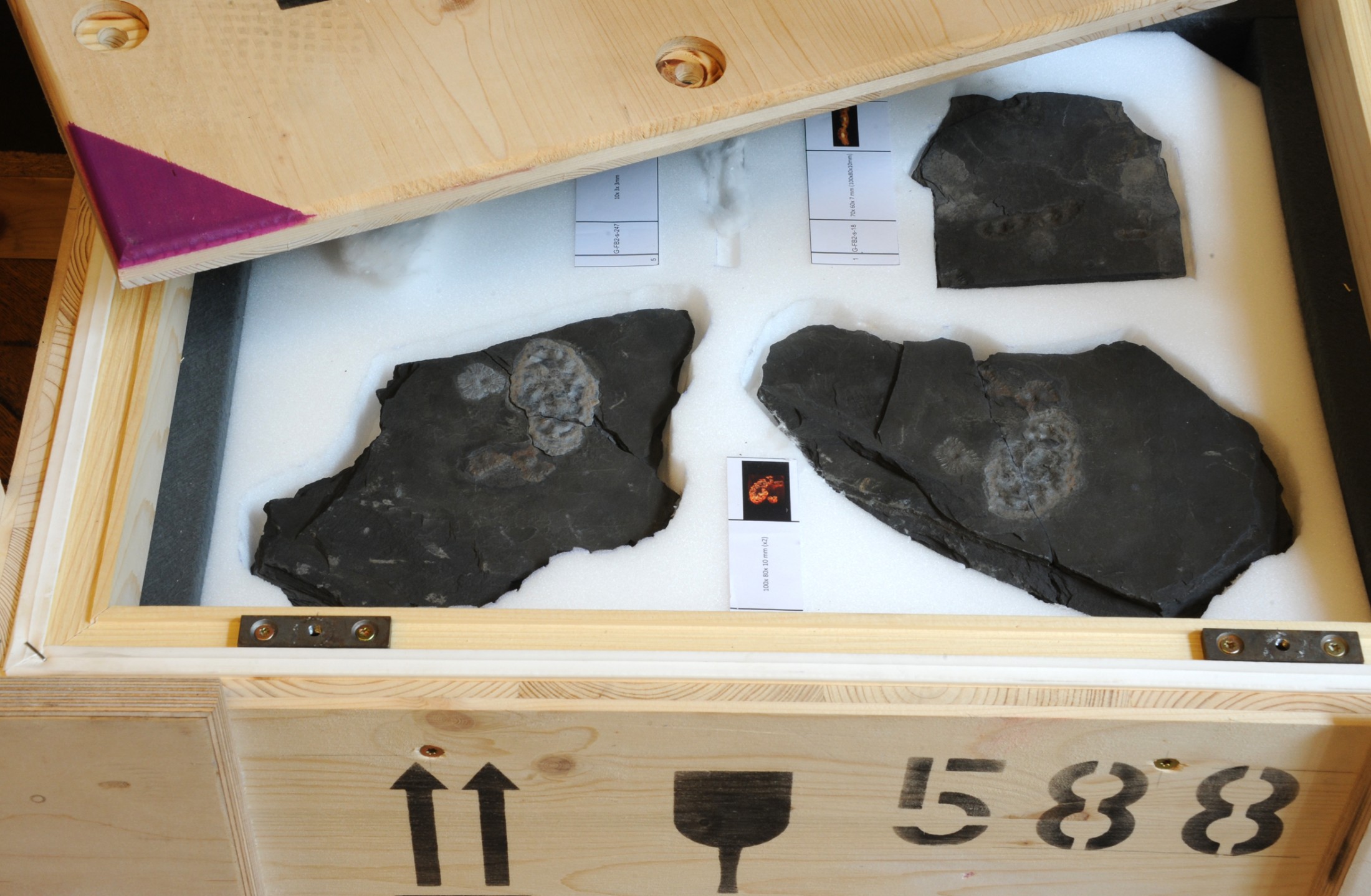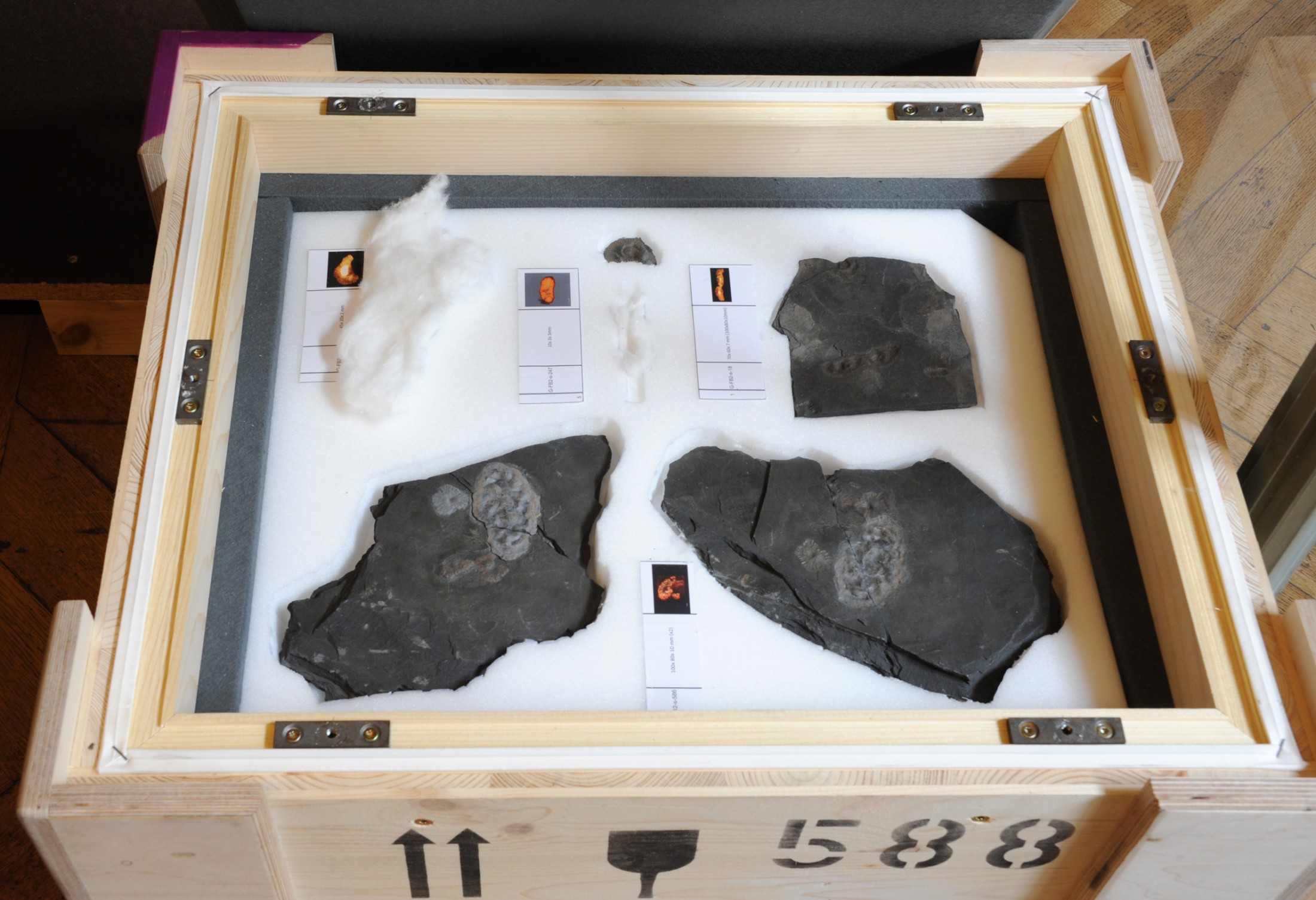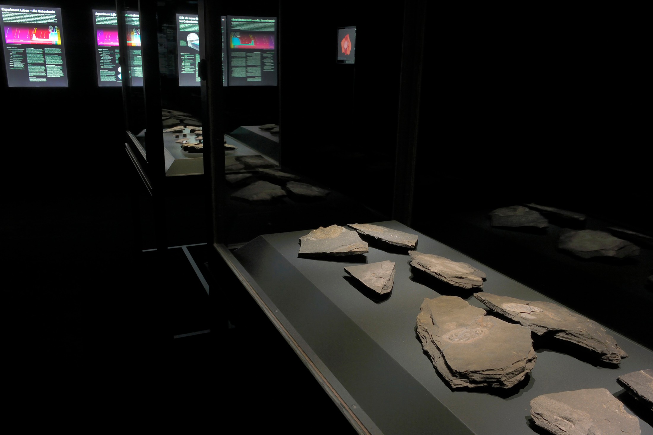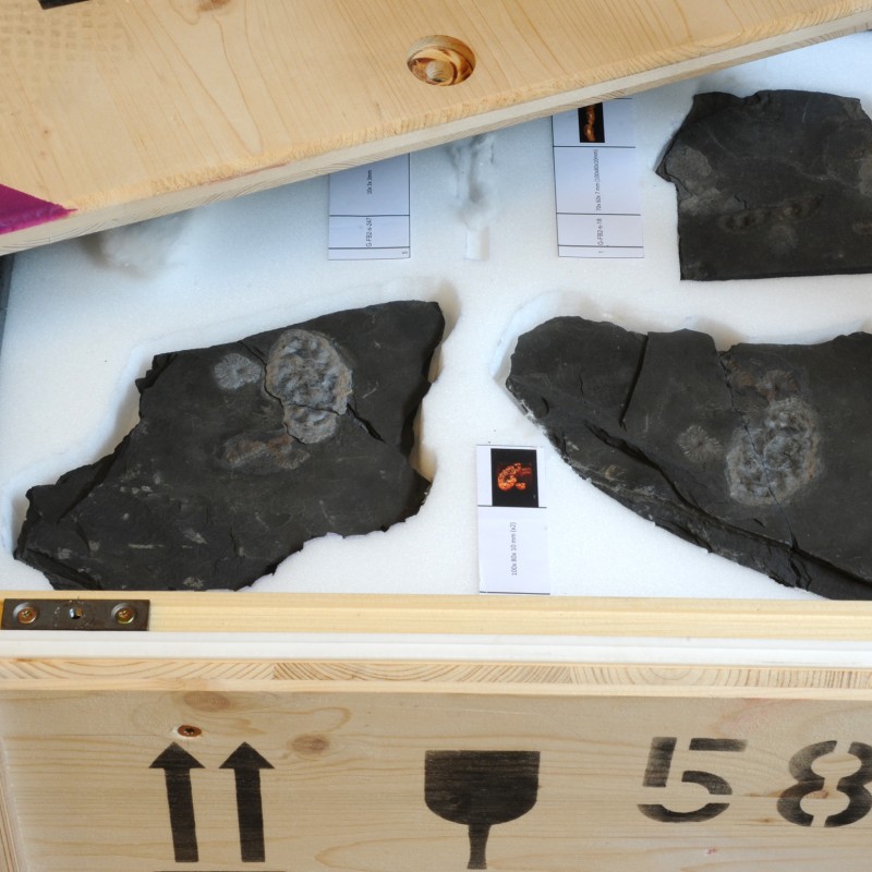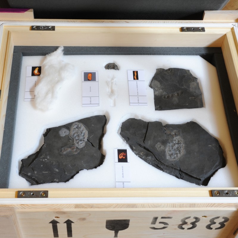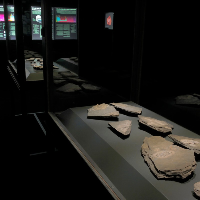 The best-preserved specimens will be presented in two display cabinets in hall 6 to document the variety of this oldest known complex ecosystem. Video clips feature virtual 3D reconstructions of several individuals. These animations are based on Micro-CT data and provide a spectacular insight into the internal organization of the organisms. Further information is provided in a 40-minute film by the University of Poitiers, featuring expert interviews and views of the fossil-locality. For the exhibition the film was translated from French into German by the Institute of Translation Science of the University of Innsbruck, under the guidance of Mag. Martina Mayer, in cooperation with the French Embassy in Vienna.