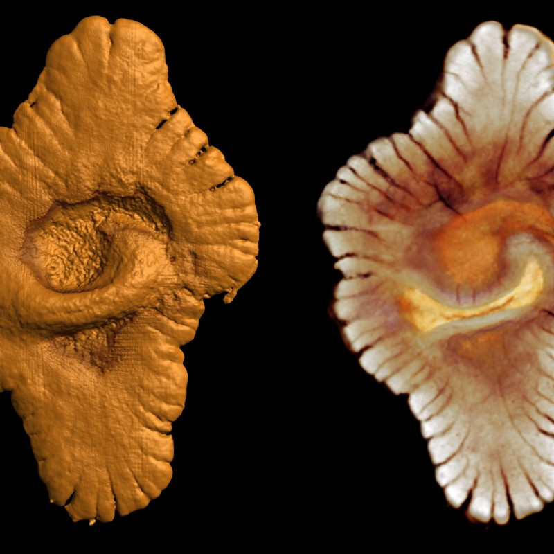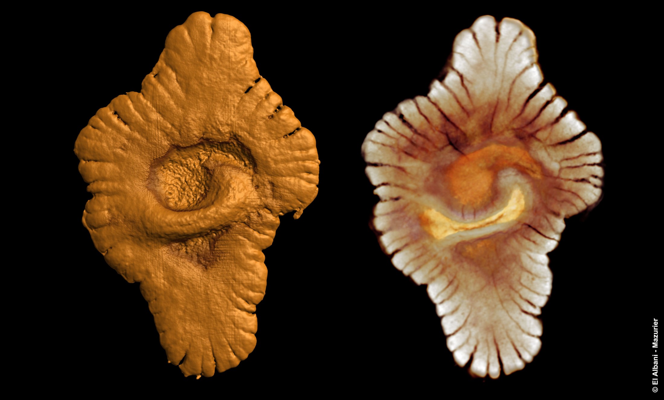 Up to the discovery of the Gabonionta, only two candidates for macroscopic multicellularity were known: Grypania spiralis, a tube-shaped, coiled, several-cm-long structure, which appeared 2.1 billion years ago in India, China and North America [3, 14], and the string-of-beads-like Horodyskia from 1.5-billion-year-old rocks of Montana and Australia.[15] Grypania is mainly interpreted as eukaryote algae [14], and Horodyskia might represent an early fungus.[15] Both organisms are morphologically not very complex and are also reminiscent of macroscopic Archaea-Bacteria communities. [3] This interpretation can be excluded for the Gabonionta based on their complex morphology. More than 450 specimens from 45 different horizons have been found so far. The up to 17-cm-sized fossils represent several distinct morphotypes. Some specimens are more or less circular in outline, others are elongate and resemble flatworms. It remains unclear if the various shapes represent distinct species or if all the fossils derive from a single variable species. Nevertheless, the morphological groups can be categorized in distinct morphotypes, pointing to the presence of numerous species. El Albani and his team analyzed the fossils in a Micro-CT to document their internal structure. These data enable a virtual 3D-reconstruction and revealed a common organization of the Gabonionta. An ellipsoid or spherical central element is typical. It was flexible and often exhibits several folds. The folding might have been caused by postmortem deformation of the gelatinous central element. This central body is surrounded by a fringe with distinct radial structure and scalloped margin. El Albani interpreted this complex organization as the geologically oldest evidence for coordinated growth and intercellular communication.