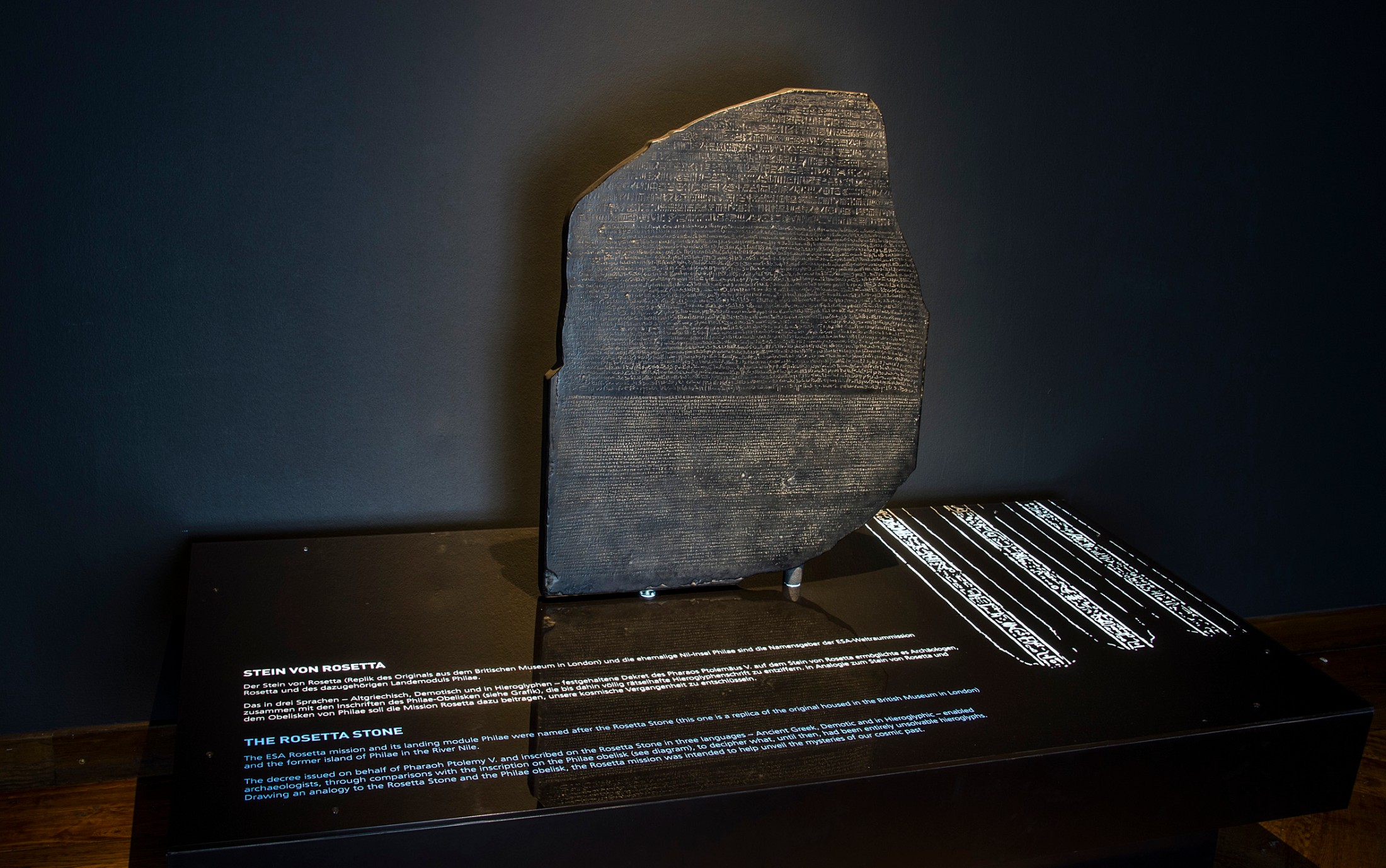 Therefore, the European Space Agency (ESA) set about creating a mission to send the first probe into space to orbit a comet on its journey through the solar system. Meanwhile, a consortium led by the DLR developed a pioneering high-tech lander to carry out scientific analysis on the surface of the comet. The probe and lander were given the names Rosetta (taken from the Rosetta Stone, which laid the foundations for deciphering Egyptian hieroglyphs) and Philae (taken from an obelisk at the Temple of Philae whose bilingual inscriptions helped Jean-François Champollion make his major breakthrough in the eventual decipherment of Egyptian hieroglyphs in 1822).