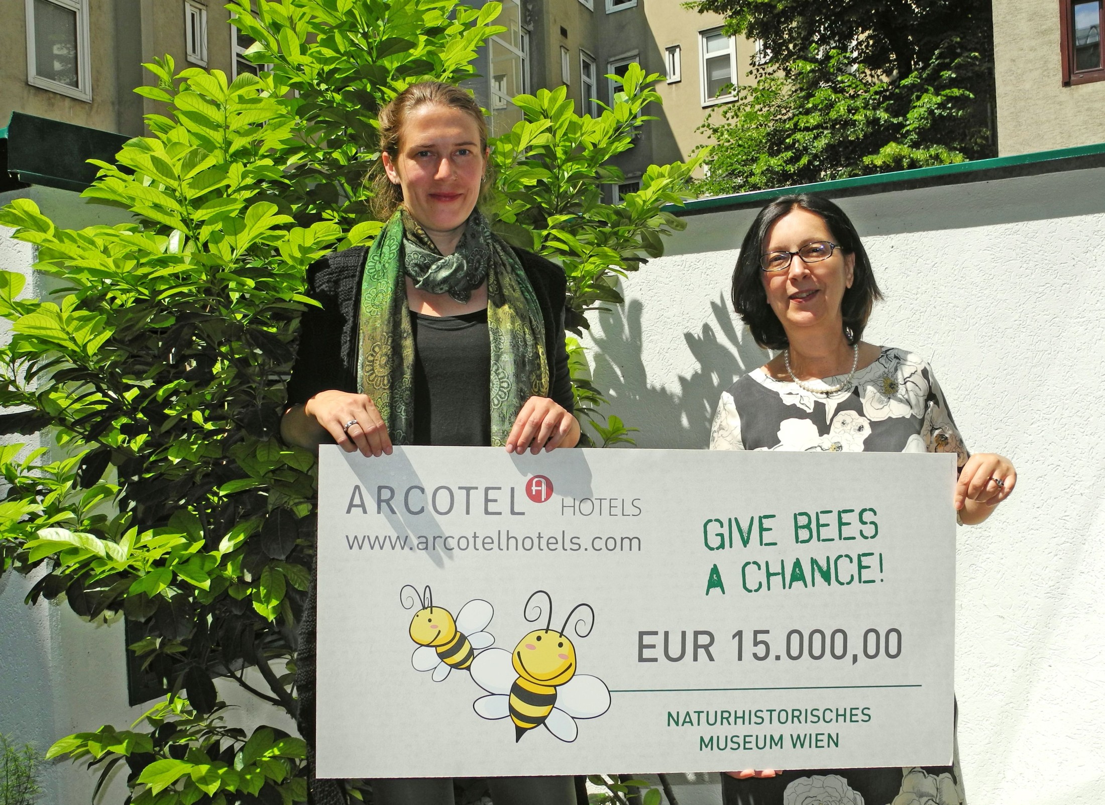 Dr. Renate Wimmer (re.) übergab den Scheck an Dr. Dominique Zimmermann vom Naturhistorischen Museum Wien im ARCOTEL Wimberger.