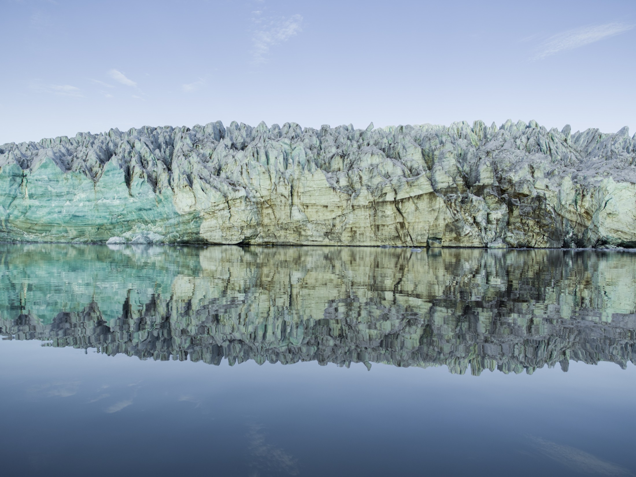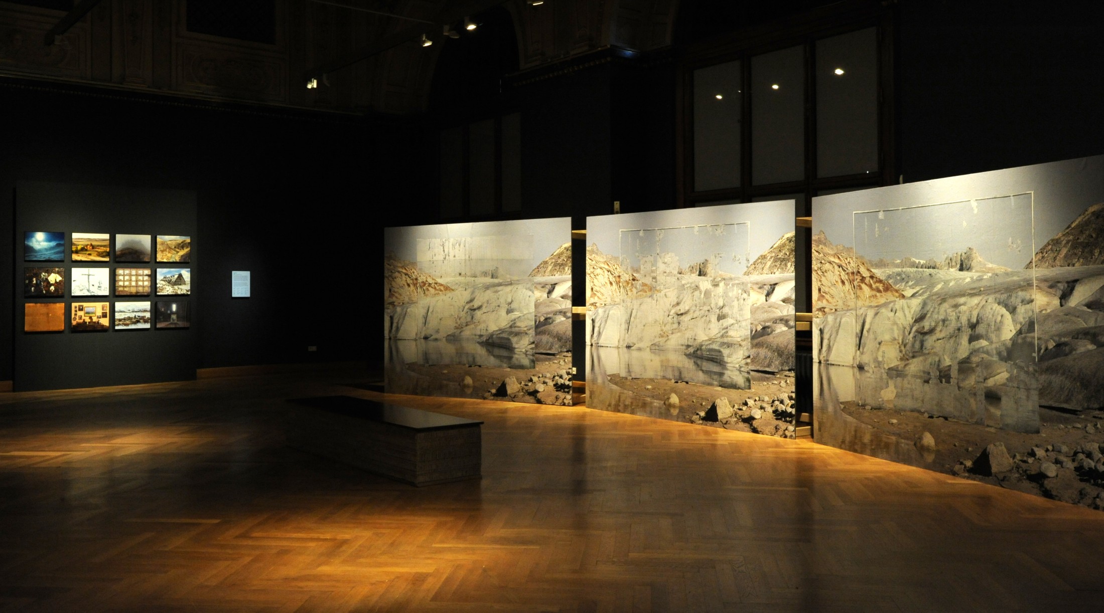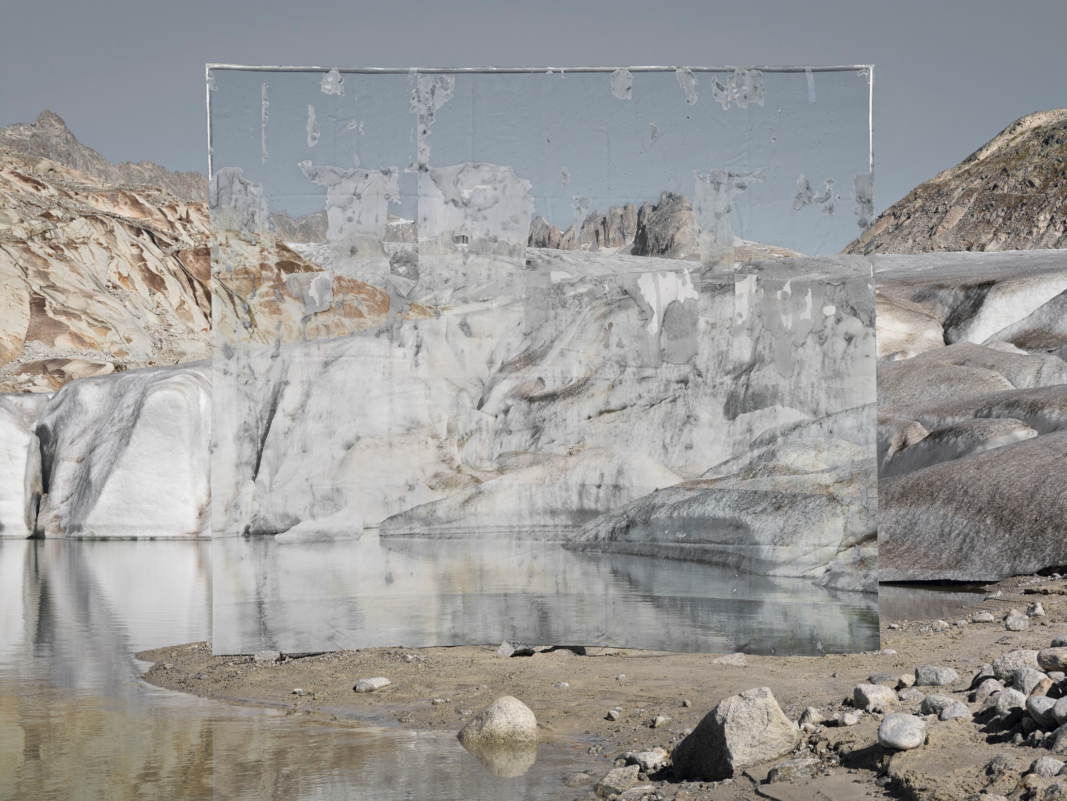 Noémie Goudal challenges the notion of stability. Glaciers can look like mountains, but the so-called rivers of ice move and undergo constant transformations. In order to mirror the shifting glacial landscape and make the changing environment tangible, Goudal constructed a large-scale photographic installation printed on biodegradable paper that disintegrates when wet. As the image dissolves, the artificial landscape can be viewed against its natural form.