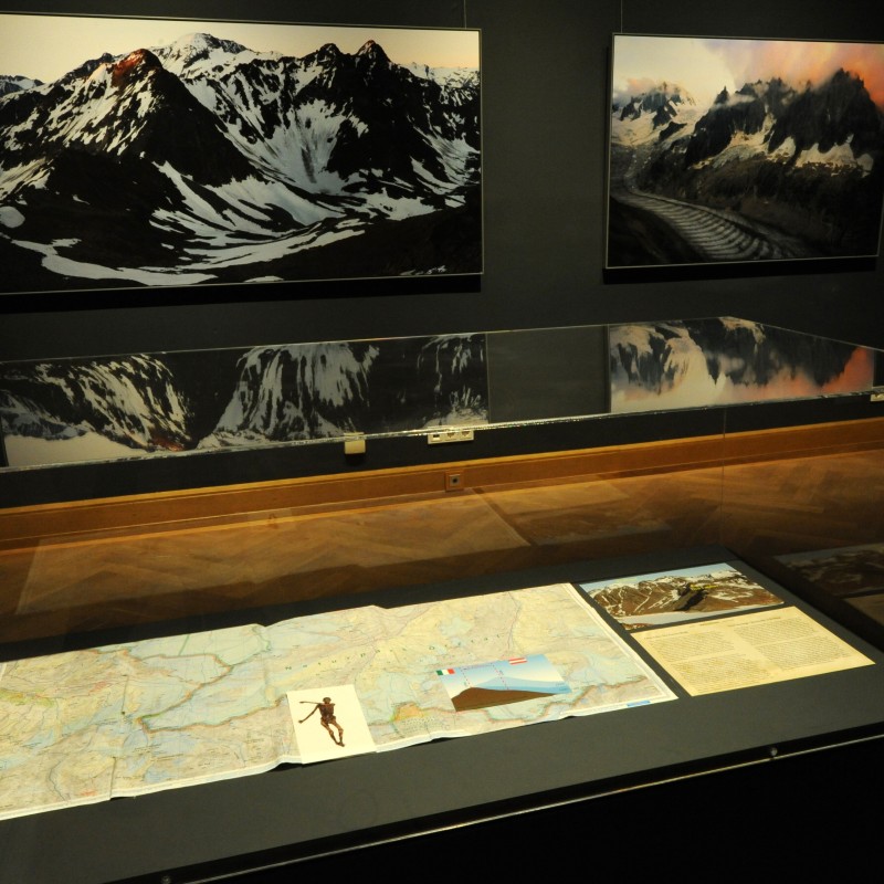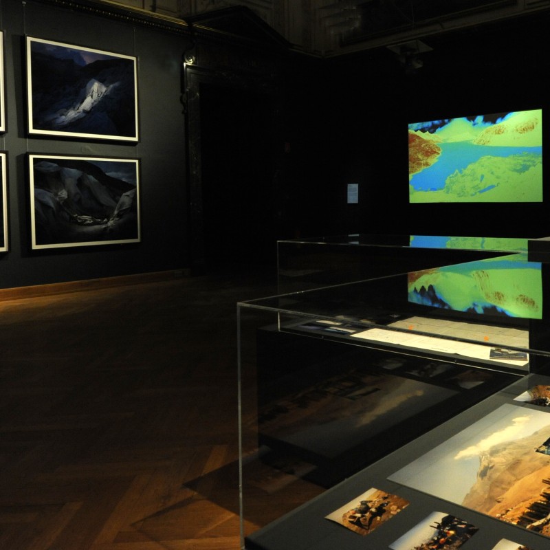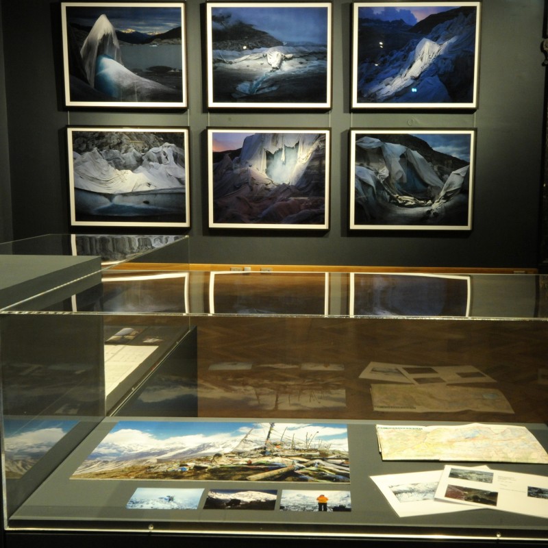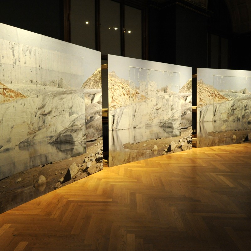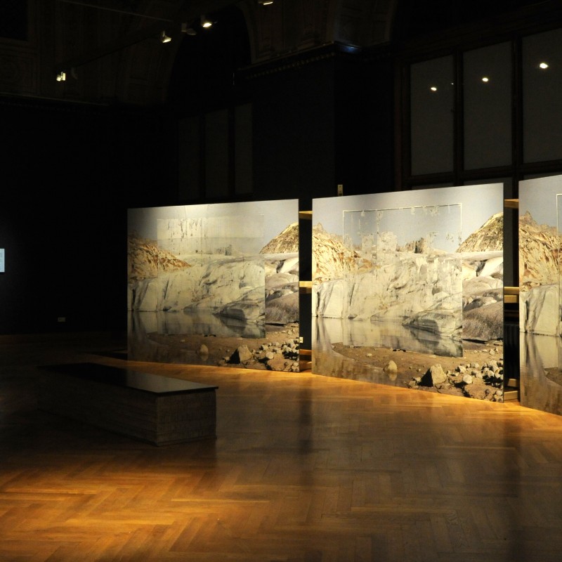 Noémie Goudal challenges the notion of stability. Glaciers can look like mountains, but the so-called rivers of ice move and undergo constant transformations. In order to mirror the shifting glacial landscape and make the changing environment tangible, Goudal constructed a large-scale photographic installation printed on biodegradable paper that disintegrates when wet. As the image dissolves, the artificial landscape can be viewed against its natural form.
