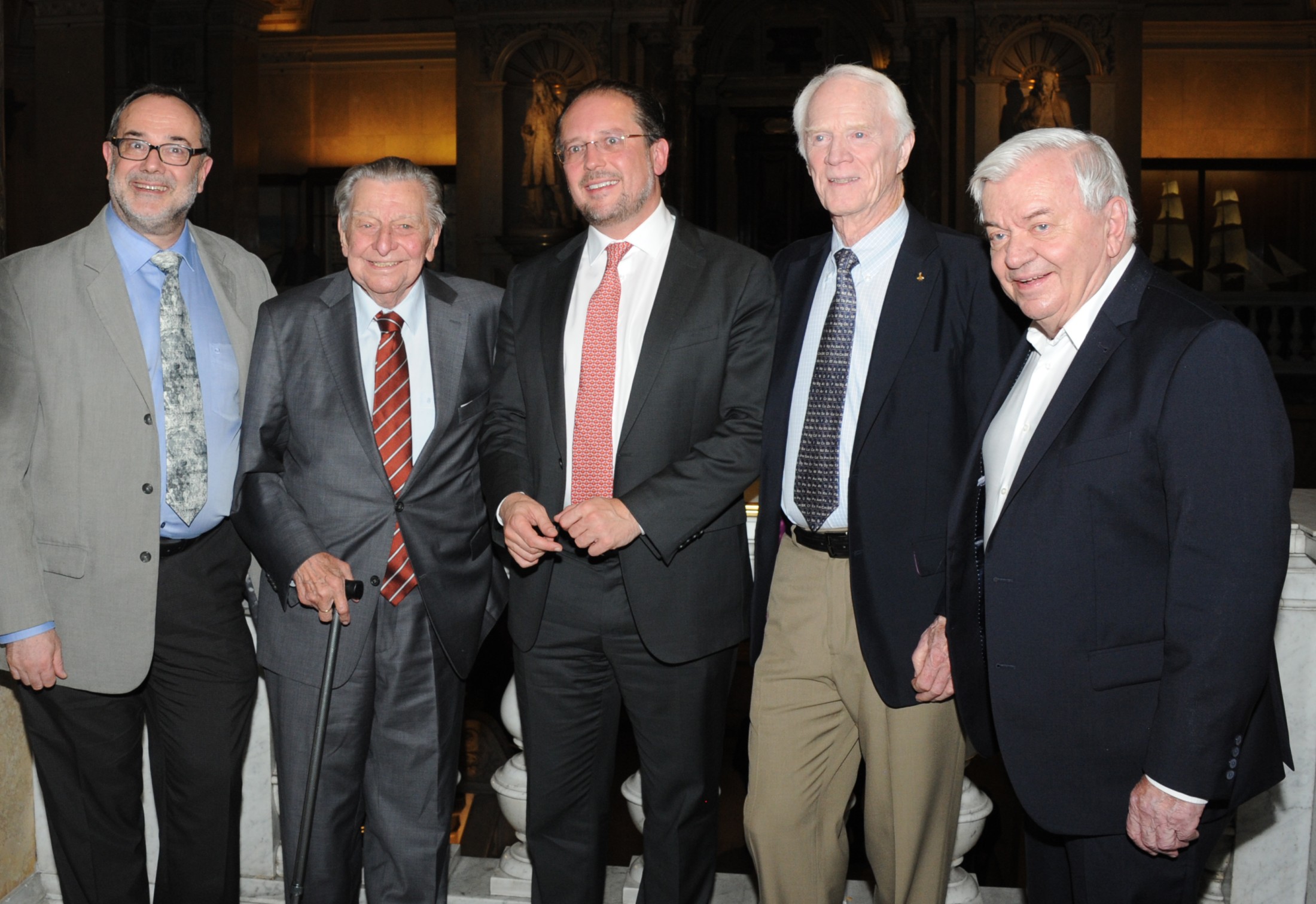 Im Bild v.l.n.r.: NHM Wien-Generaldirektor Univ. Prof. Dr. Christian Köberl, Dr. Hugo Portisch, Bundesminister Mag. Alexander Schallenberg (BM für EU, Kunst, Kultur und Medien), Rusty Schweickart (Lunar Module Pilot, Apollo 9) und Peter Nidetzky.