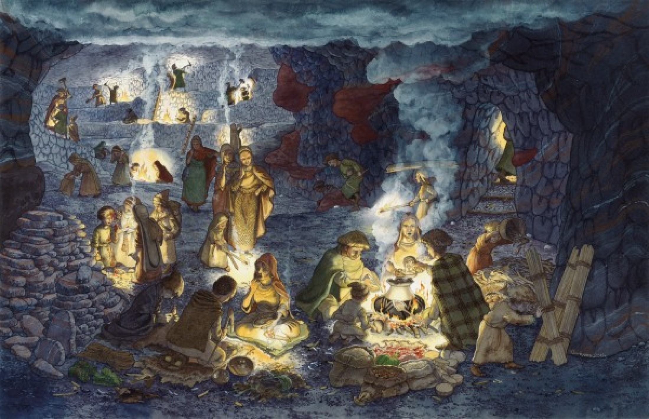 Cross-cut through Hallstatt salt mountain with schematic representation of early Iron Age mining system. The Iron mining hall is 300 m long and 20 m high and represents the largest prehistoric mining gallery.
