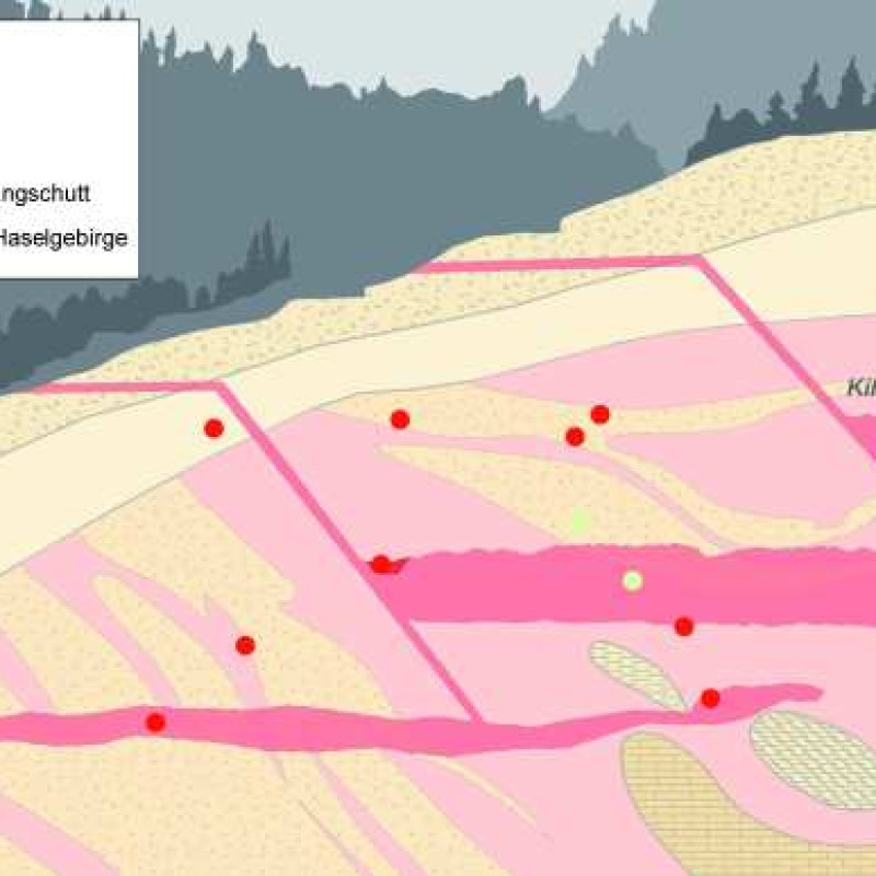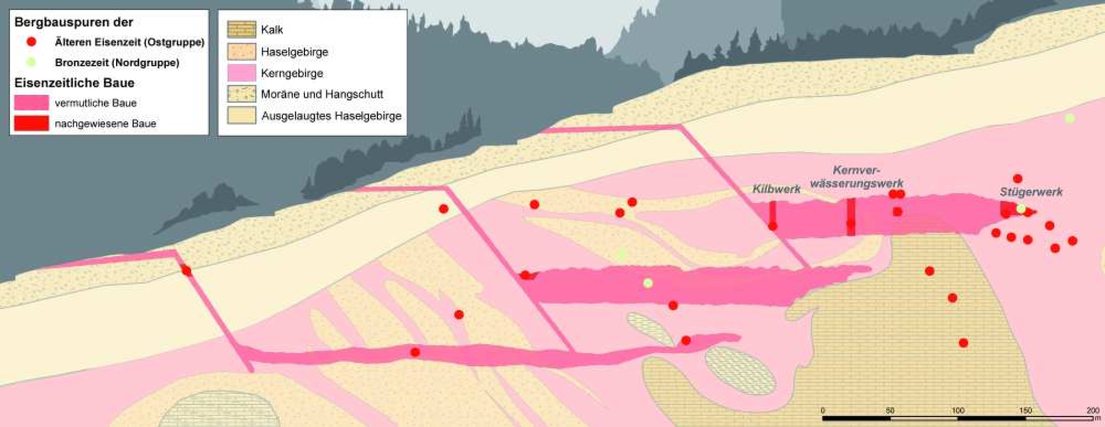 Querschnitt des Hallstätter Salzbergs mit schematischer Darstellung des früheisenzeitlichen Bergbausystems. Die Halle ist