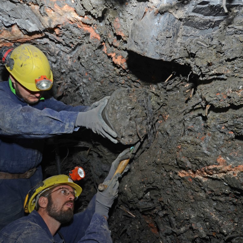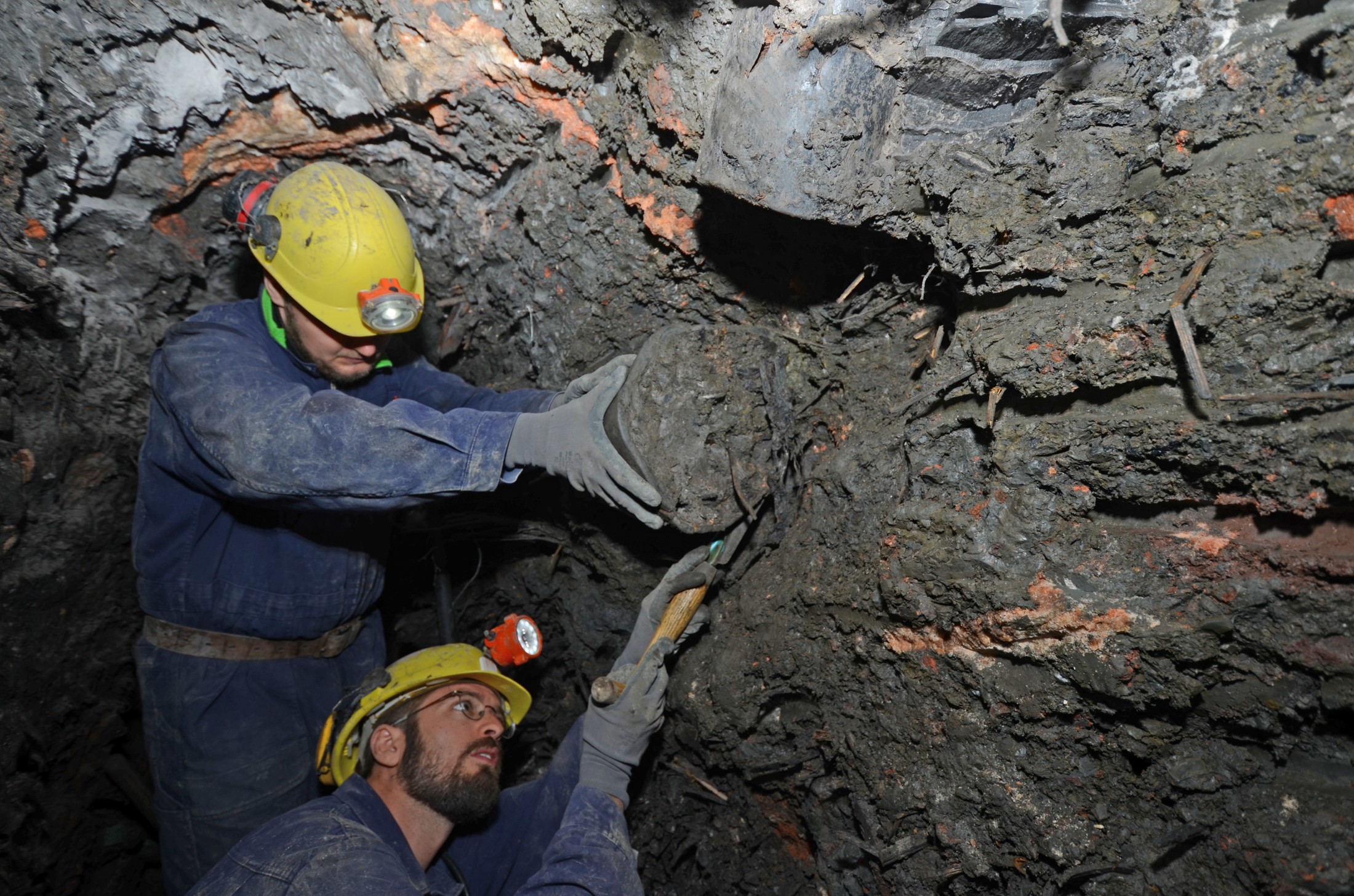 Archäologische Ausgrabungen in einer bronzezeitlichen Abbaukammer. Ein über 3000 Jahre alter Holzeimer wird ausgegraben.