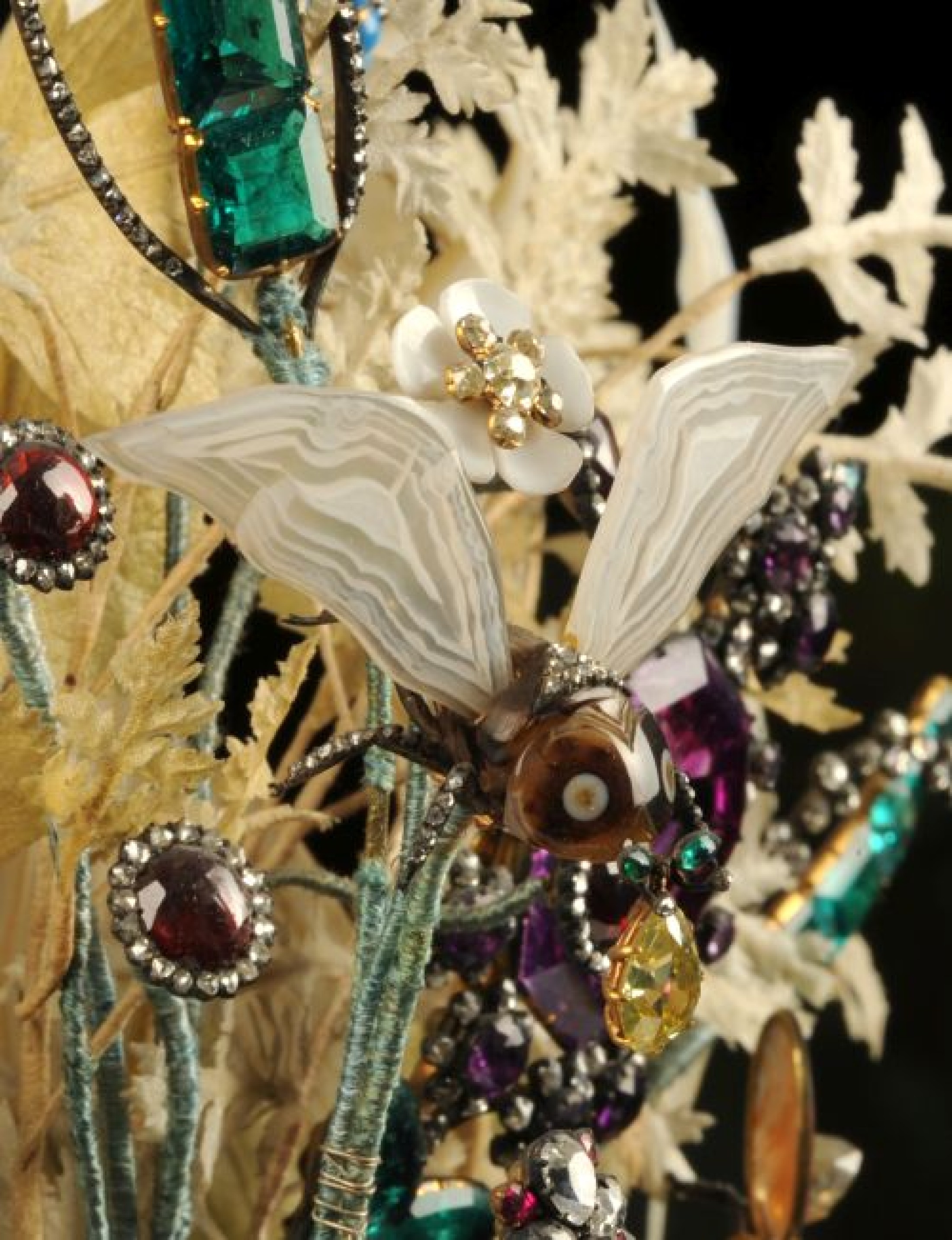 A particularly enchanting animal object is located in the centre of the uppermost part of the bouquet: it represents a bee whose wings are made of white agate. The head is made of brown eye agate, in front of which green stalk eyes made of small emeralds are attached. In its mouth, the insect has a drop of honey in the shape of a yellow diamond.