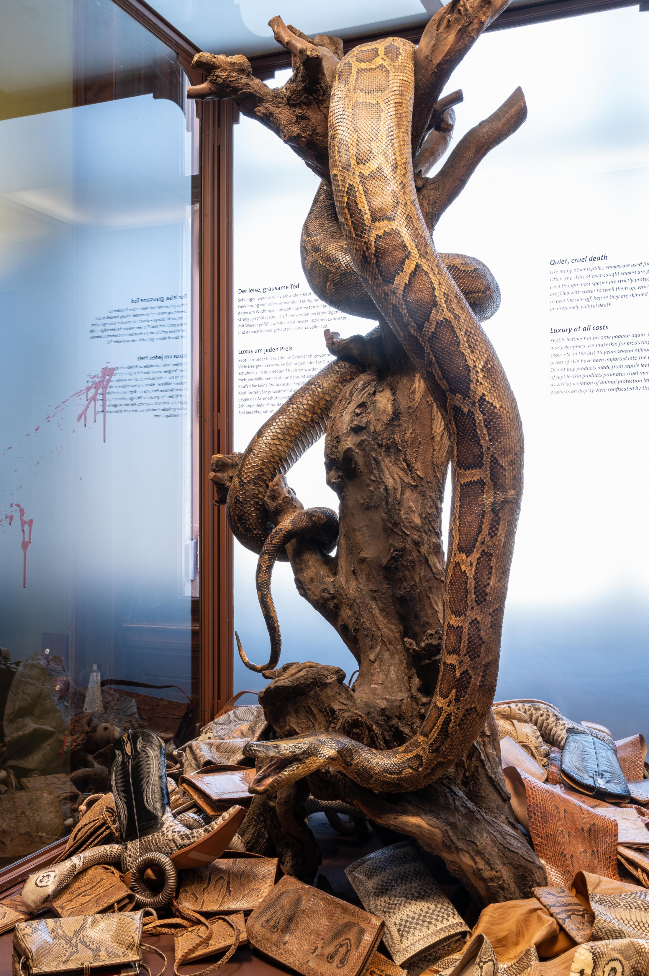 Die Vitrine zum Thema "Artenschutz" im Saal 27 zeigt einen fünf Meter lange Dunklen Tigerpython (Python bivittatus) und unzählige Produkte aus Schlangenleder. Die Vitrine zeigt grausame Tötungsmethoden und Verstöße gegen das Artenschutzgesetz auf, die in einigen Teilen der Welt noch immer an der Tagesordnung stehen.
