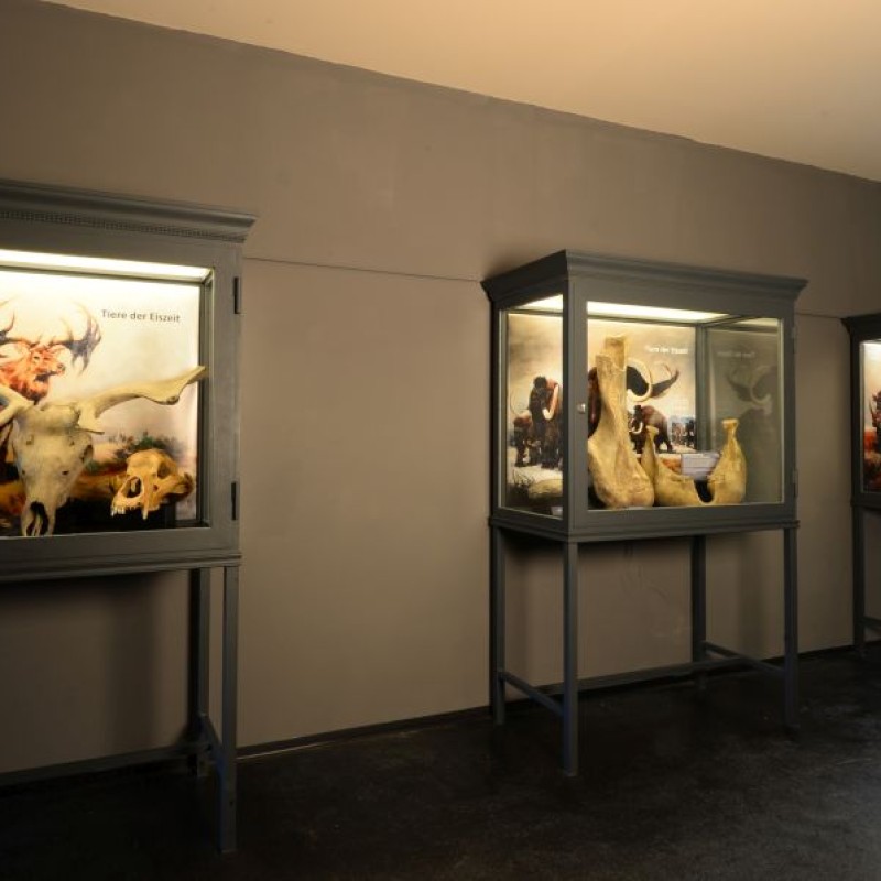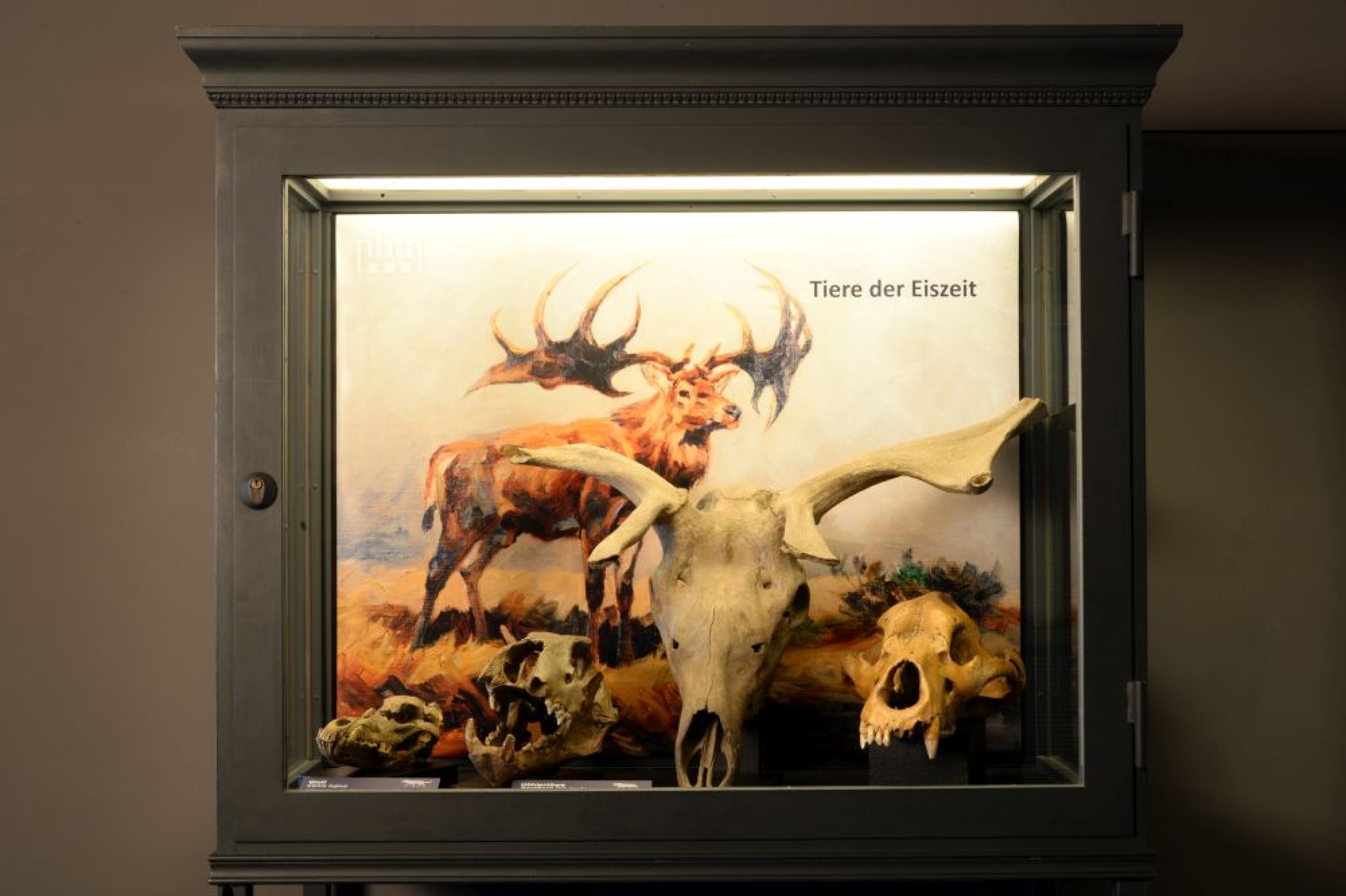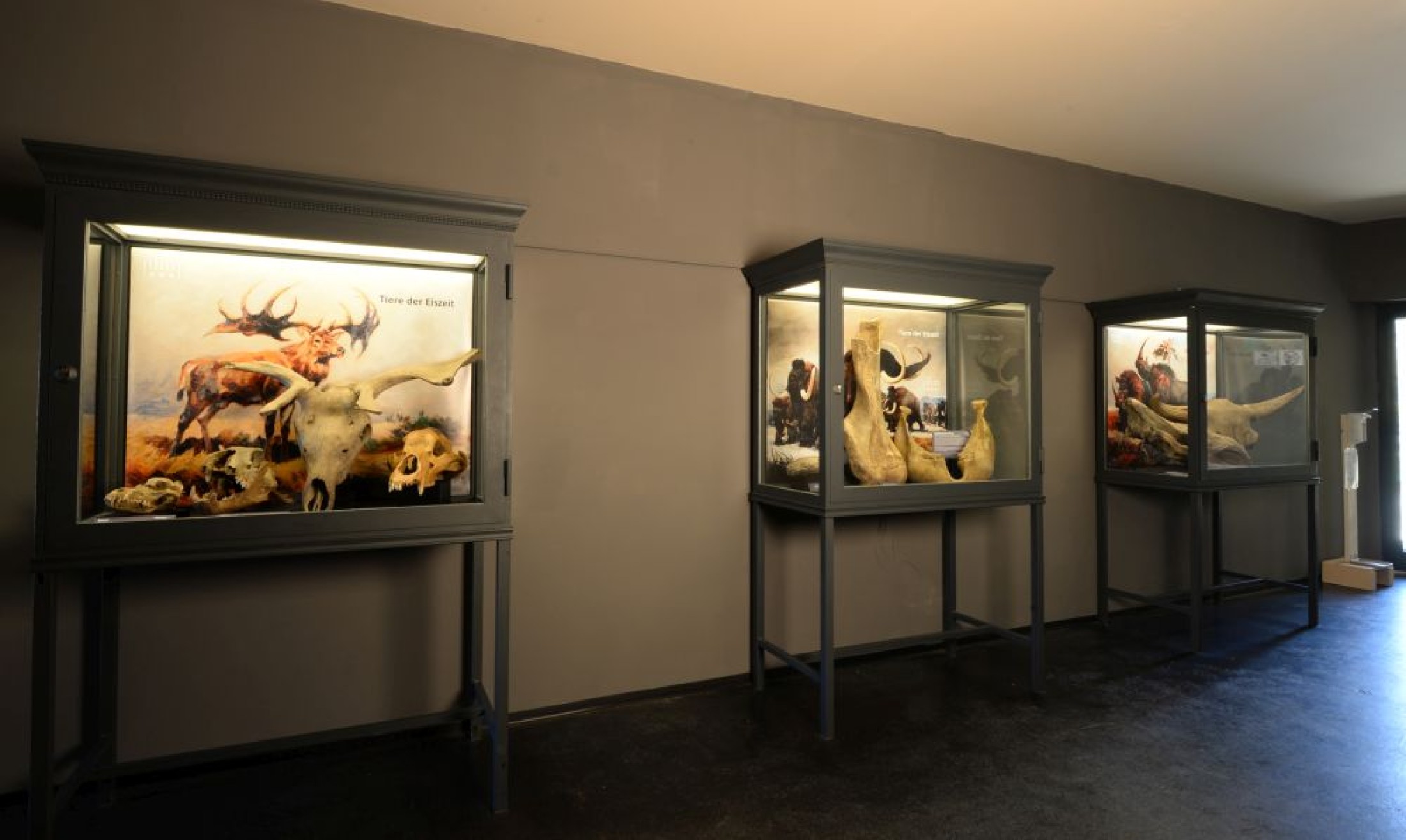 three display cases, including the cave lion, cave bear, steppe bison, giant deer and woolly rhinoceros.