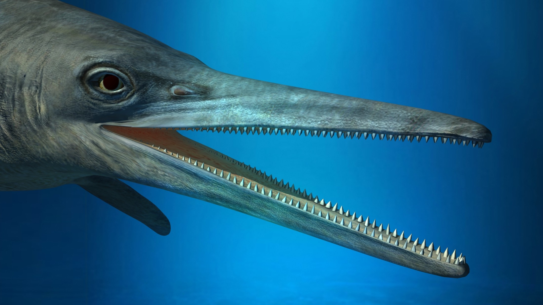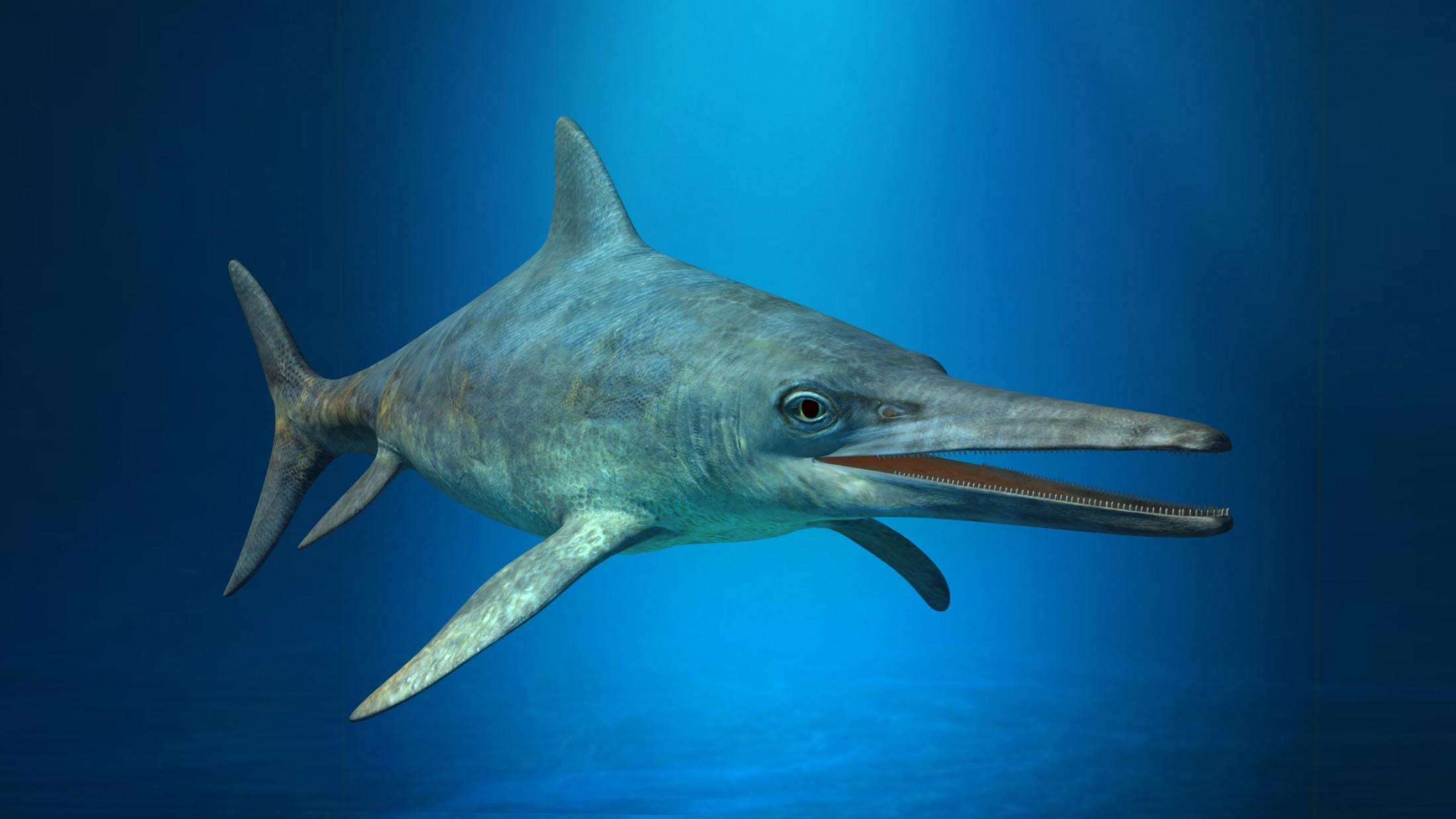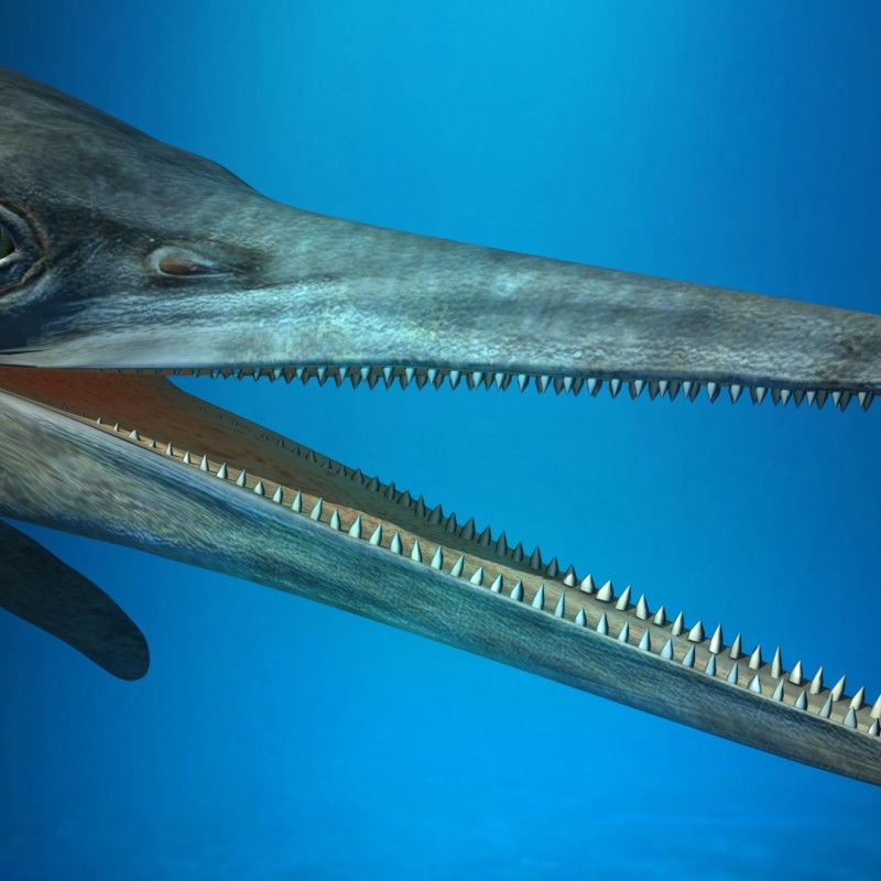 These detailed investigations furnished surprising insights. More than ten ichthyosaur teeth with a length of up to three centimetres were found inside the larger piece. The researchers were also able to examine the anatomy of the snout with this method. On the basis of the micro-CT data, they created three-dimensional digital models which served as the basis for the reconstructions of the animal. In this way, and with the help of the 7reasons company, a previously unknown ichthyosaur was digitally “brought to life”.