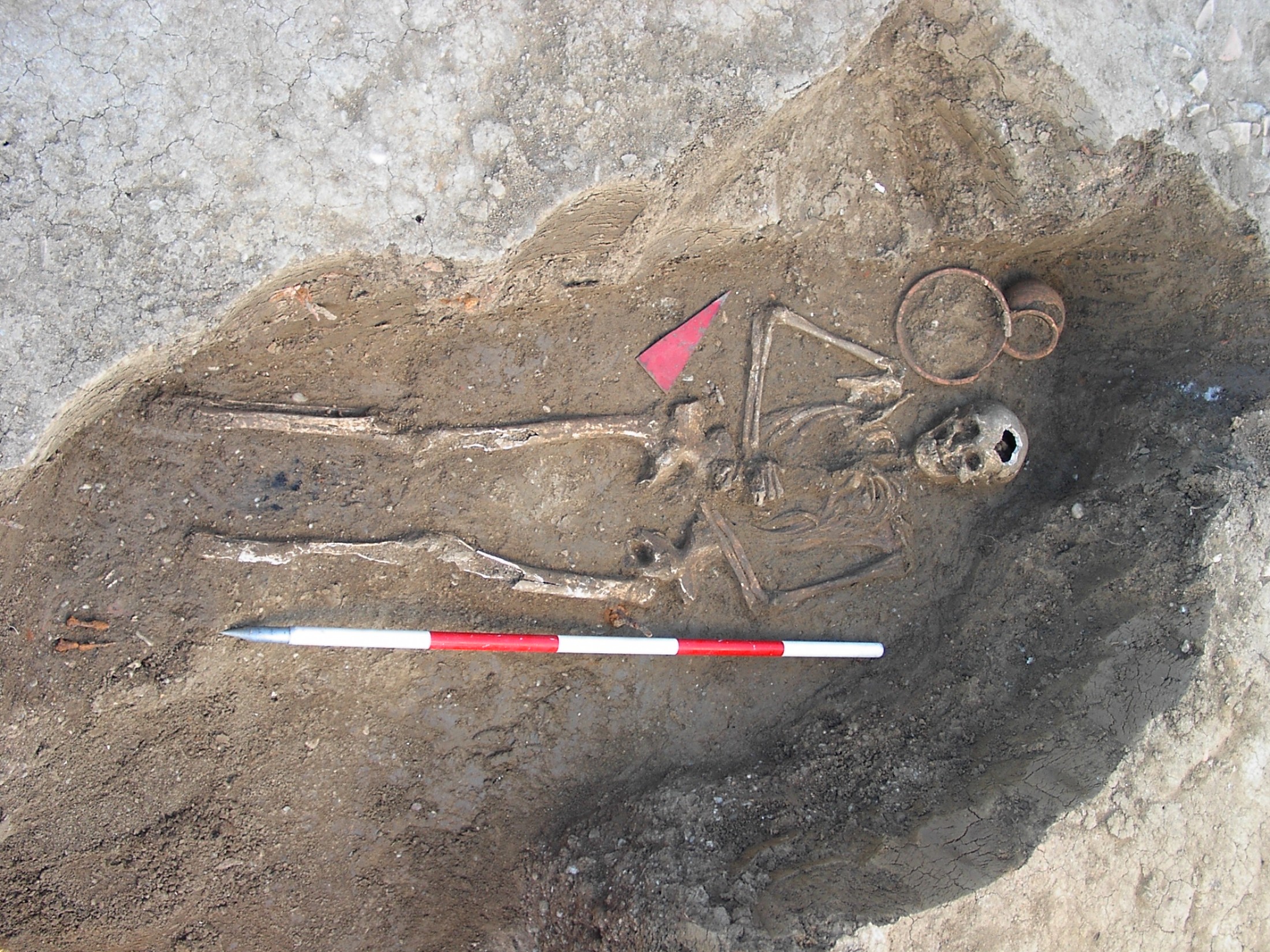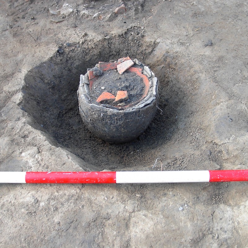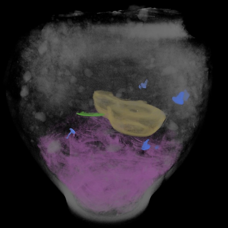 Nachbearbeiteter CT-Scan der Urne 32/2005 aus dem Gräberfeld Kristein-Ost mit Leichenbrandfragmenten im unteren Bereich und mehreren Beigaben, darunter ein Öllämpchen.