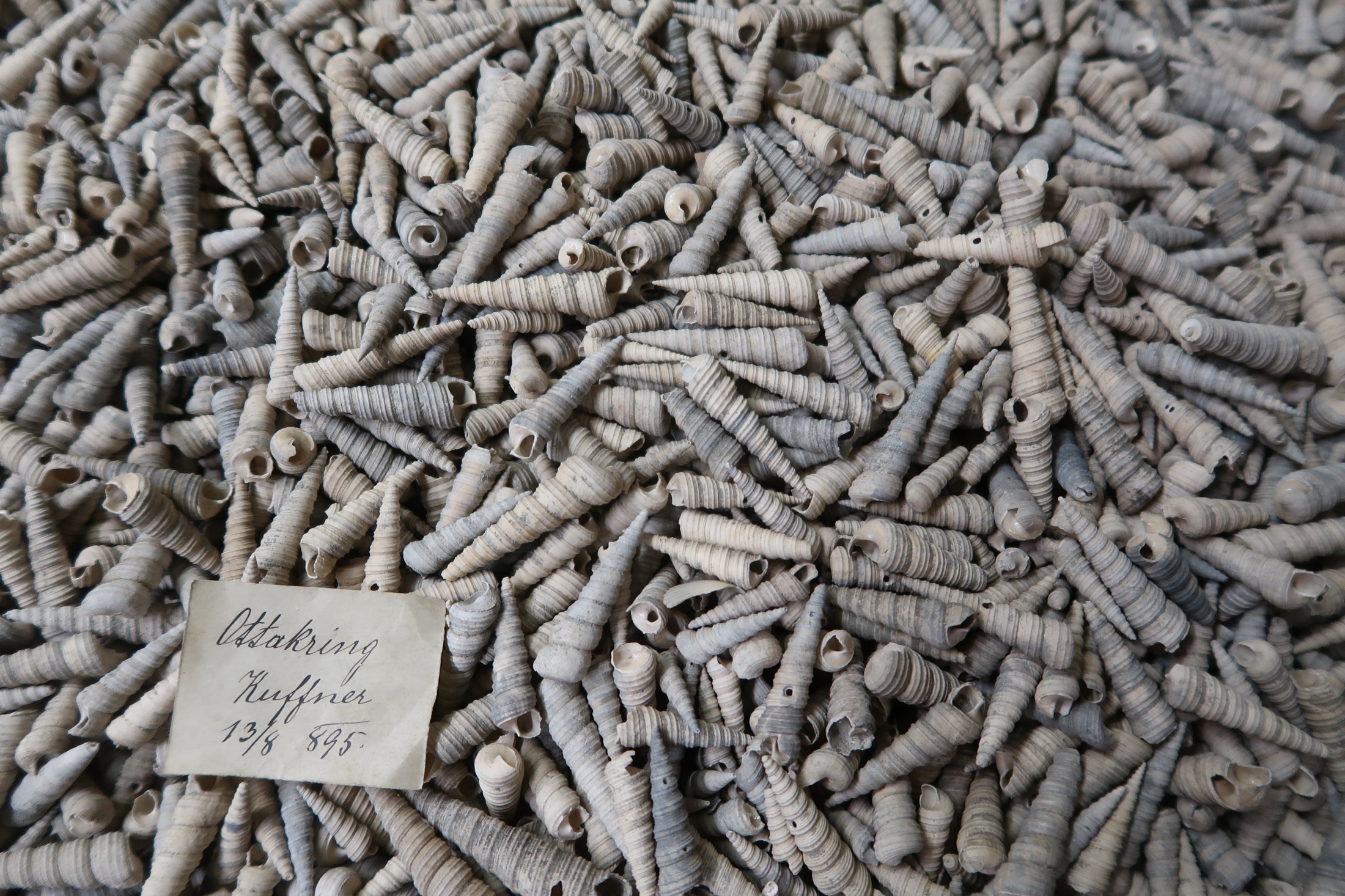 Tray with hundreds of shells of tower snails from Ottakring in the Natural
