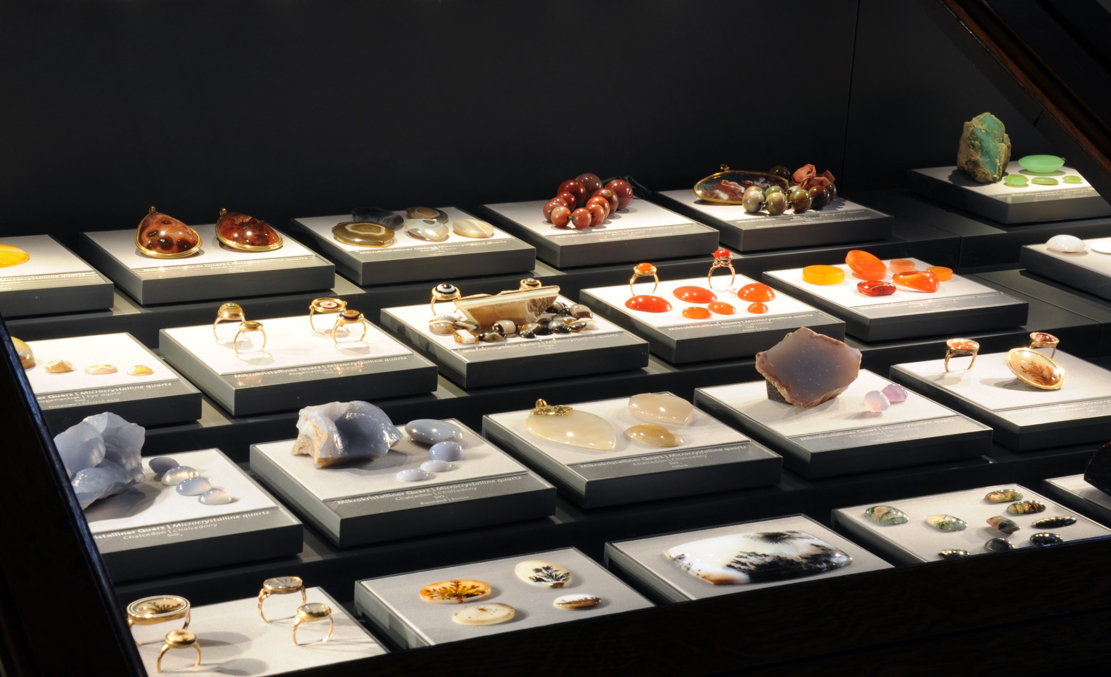 Ausschnitt aus der Systematischen Edelsteinsammlung im NHM Wien (Achat, Karneol,