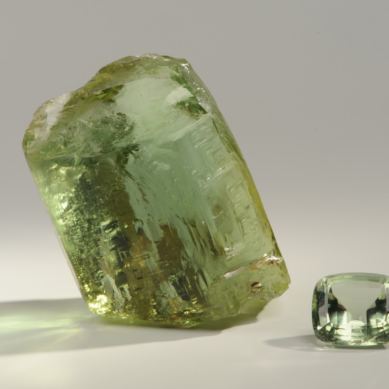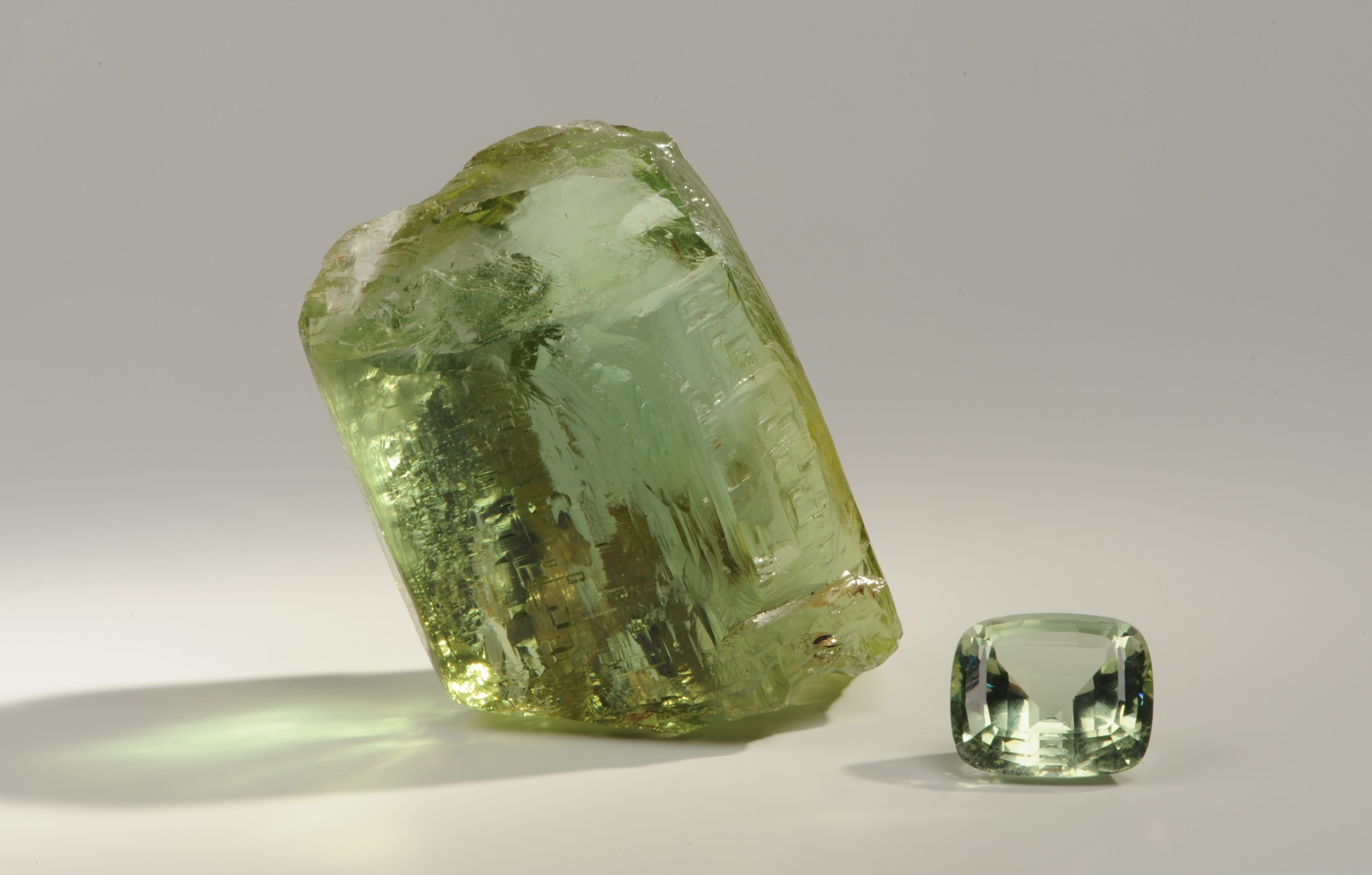 Ein Rohkristall und ein facettierter Stein mit 75 ct.