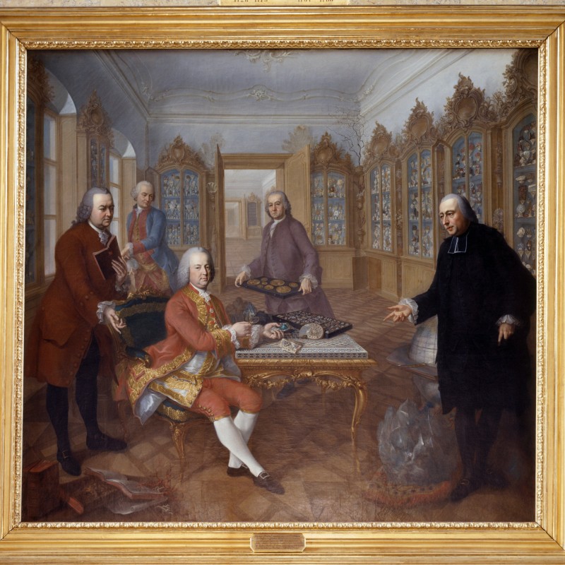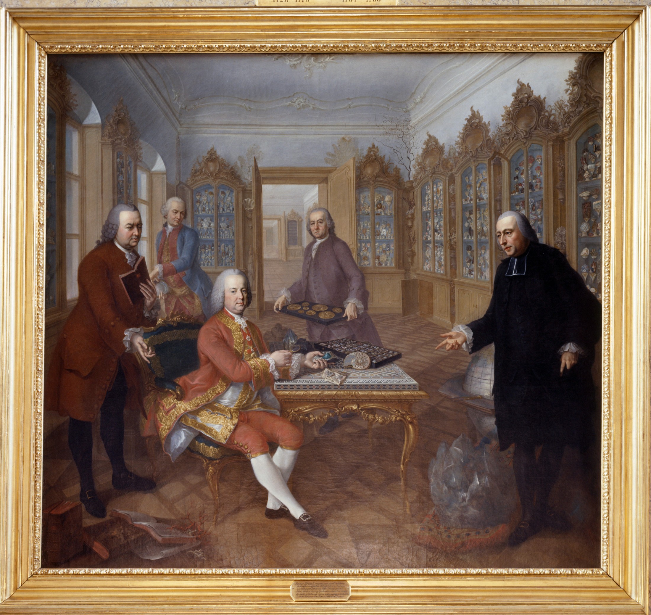 von Baillou, Valentin Duval und Abbe Johann Marcy) inmitten seiner Naturaliensammlung.