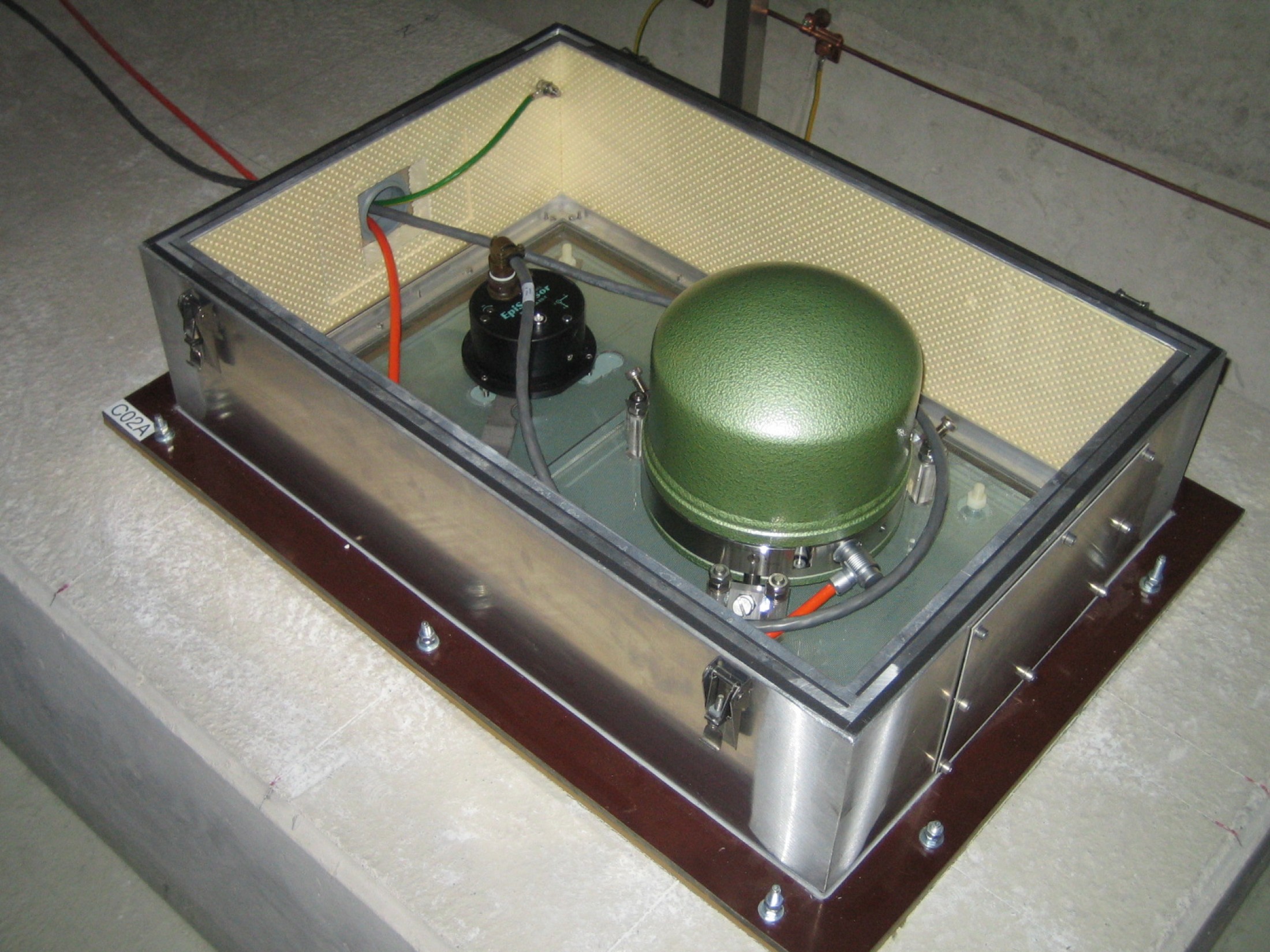 Ein Breitbandseismometer (grün) mit einem Bewegungssensor für starke Bodenbewegungen