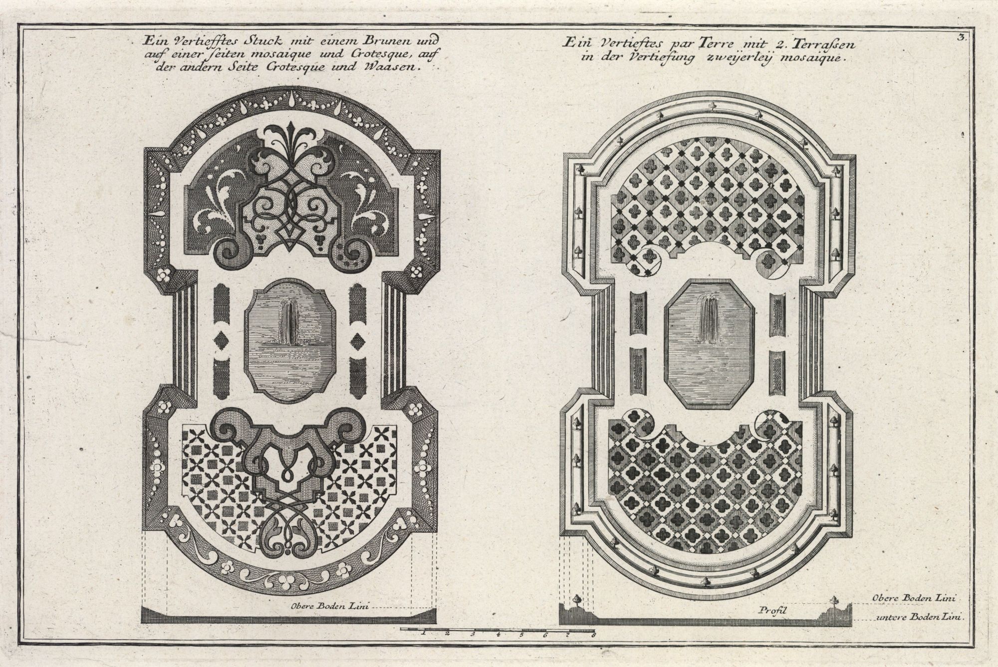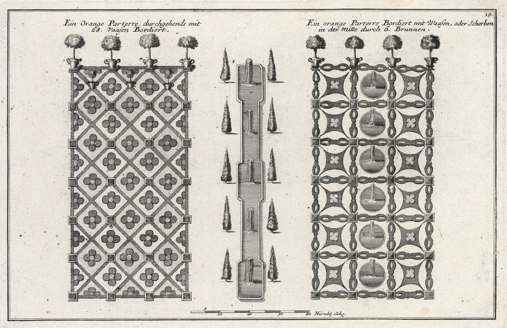 (z.B. K.k. Lustgarten von Carl Wilde, 1830 oder Vorlagen für ornamental Gärten von Johann Andreas Pfeffel, um 1750), Bau-