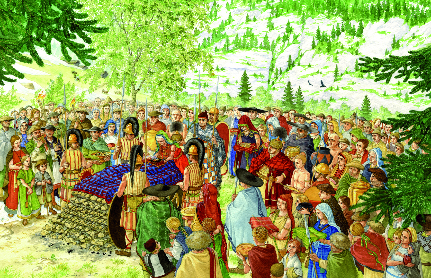 Weit bis in die Altsteinzeit reichen die Belege für verschiedenste Totenrituale, Bestattungssitten und den Glauben an das Weiterleben in einer anderen, jenseitigen Welt. Verschieden und individuell wie die Menschen zu ihren Lebzeiten sind auch ihre Gräber. Kein Grab gleicht exakt dem anderen. Und trotzdem beschreiben alle Bestattungen in ihrer Vielfalt eine gemeinsame Kultur, mit gemeinsamen Wertvorstellungen. Die Umsetzung alter und neuer Grabungsbefunde, verbunden mit neuen Erkenntnissen der Textil-, Färbe-, Leder- und Trachtforschung sowie Überlegungen zur Bevölkerung im eisenzeitlichen Hallstatt, gestatten diese künstlerische Impression einer möglichen Bestattungszeremonie im Hochtal.Bestattungssitten