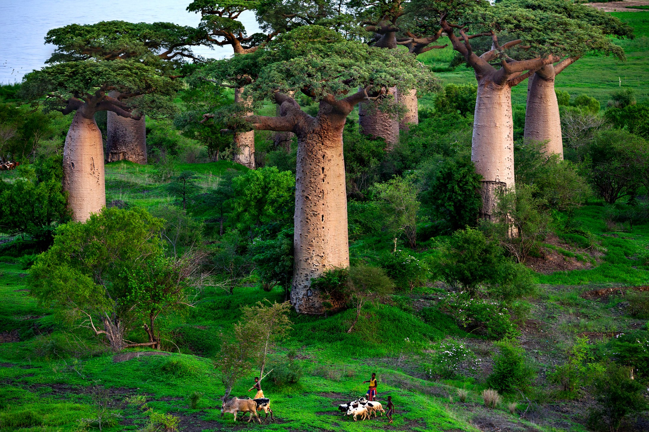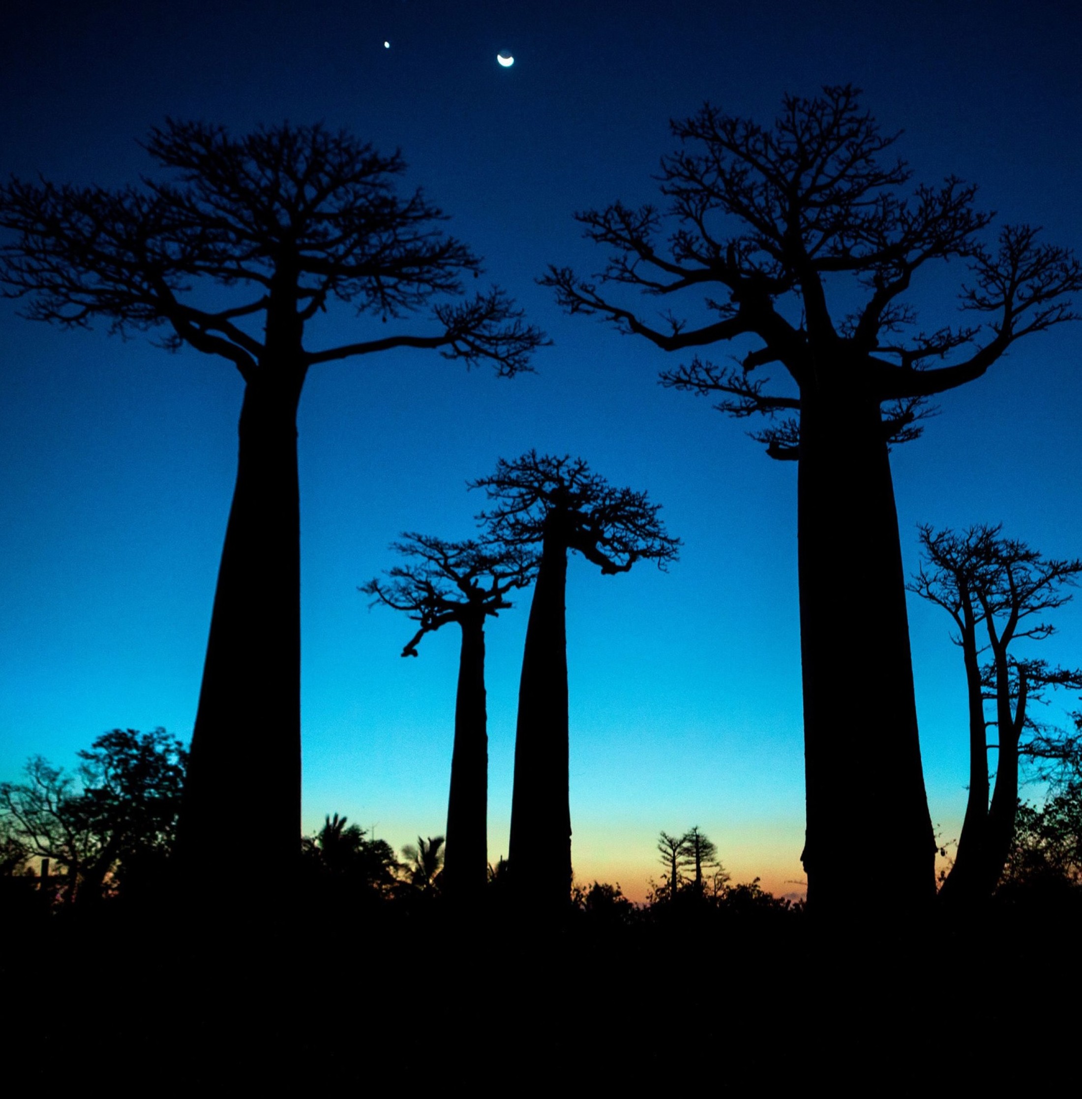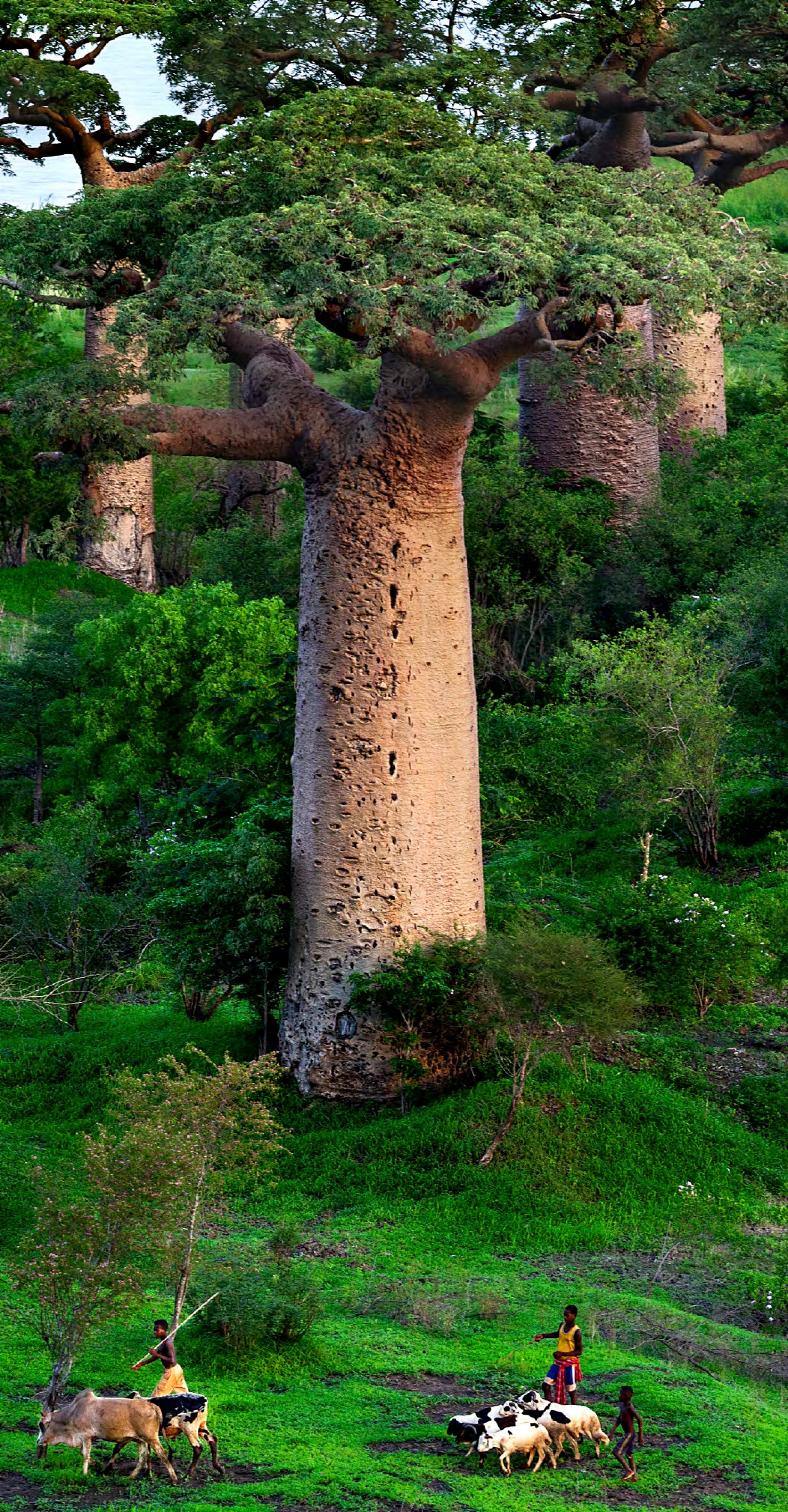 Der Baobab ist der ungewöhnlichste Baum Madagaskars. Er wird bis zu elf Meter dick und 30 Meter hoch. Sein Inneres besteht aus Fasern, die besonders viel Wasser speichern können. Während der langen Trockenzeiten verliert er seine Blätter und lebt dann von den Wasserreserven. Seine Blüten öffnen sich nur nachts. Von den acht Arten der Affenbrotbäume, die weltweit existieren, sind sieben auf Madagaskar heimisch. Sechs davon sind auf der Insel endemisch – das heißt, sie kommen nirgendwo sonst vor. Mehrere Baobab-Arten sind stark gefährdet.