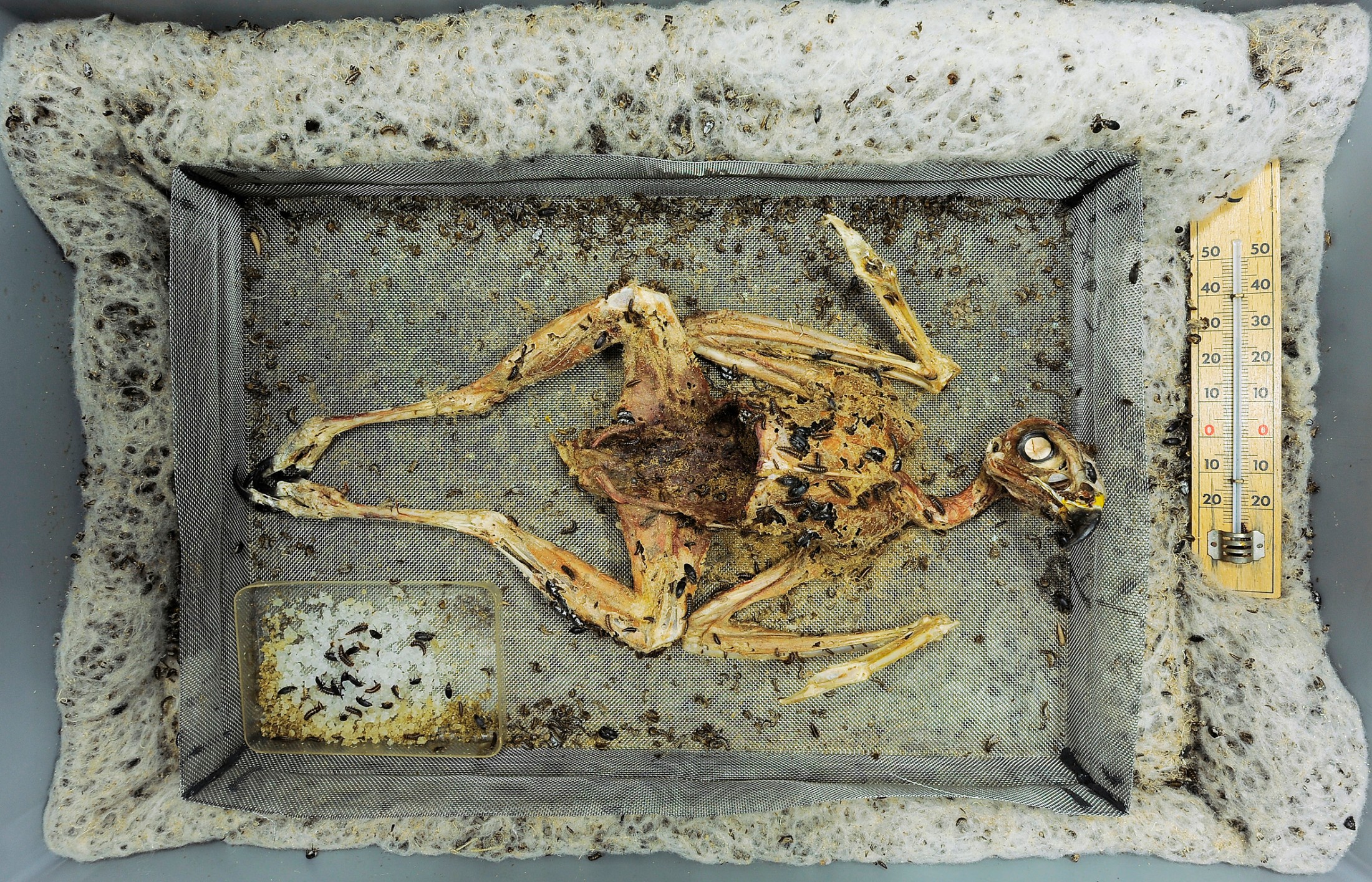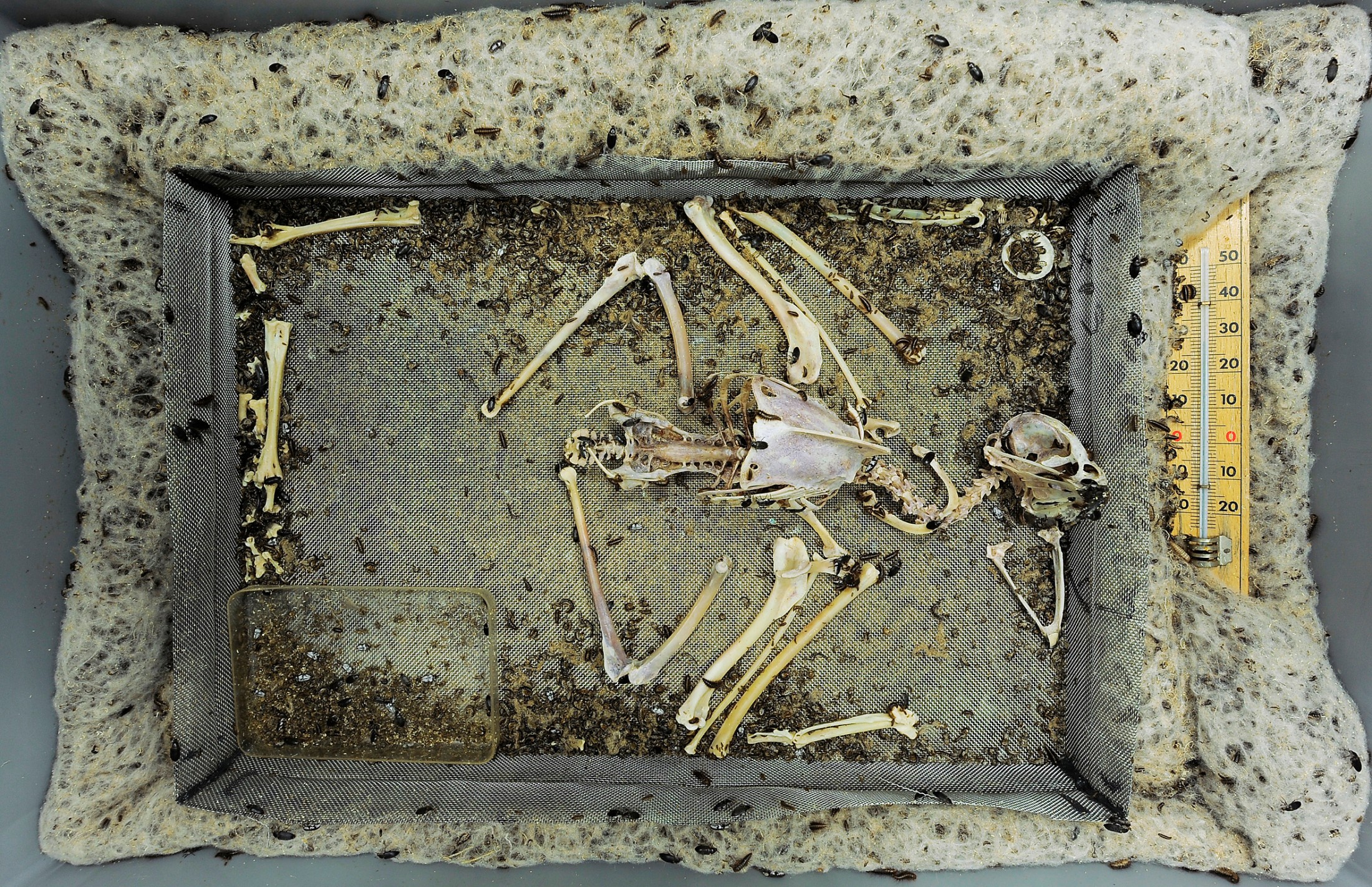 Speckkäferlarven befreien ein Mäusebussard-Skelett von Geweberesten (vorher)