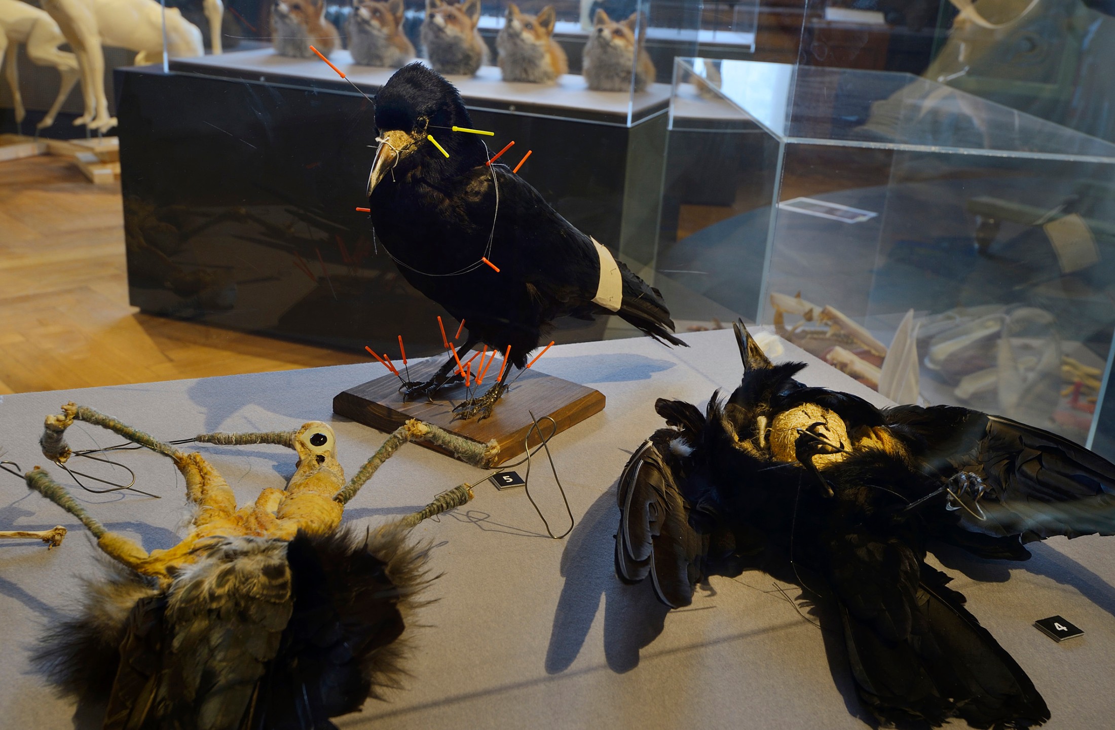 The different steps in preparing a crow: from removing the skin to supporting the body with wire, applying muscle-like wrapping and sewing the finished object, which is protected by bandages and needles during the drying process.