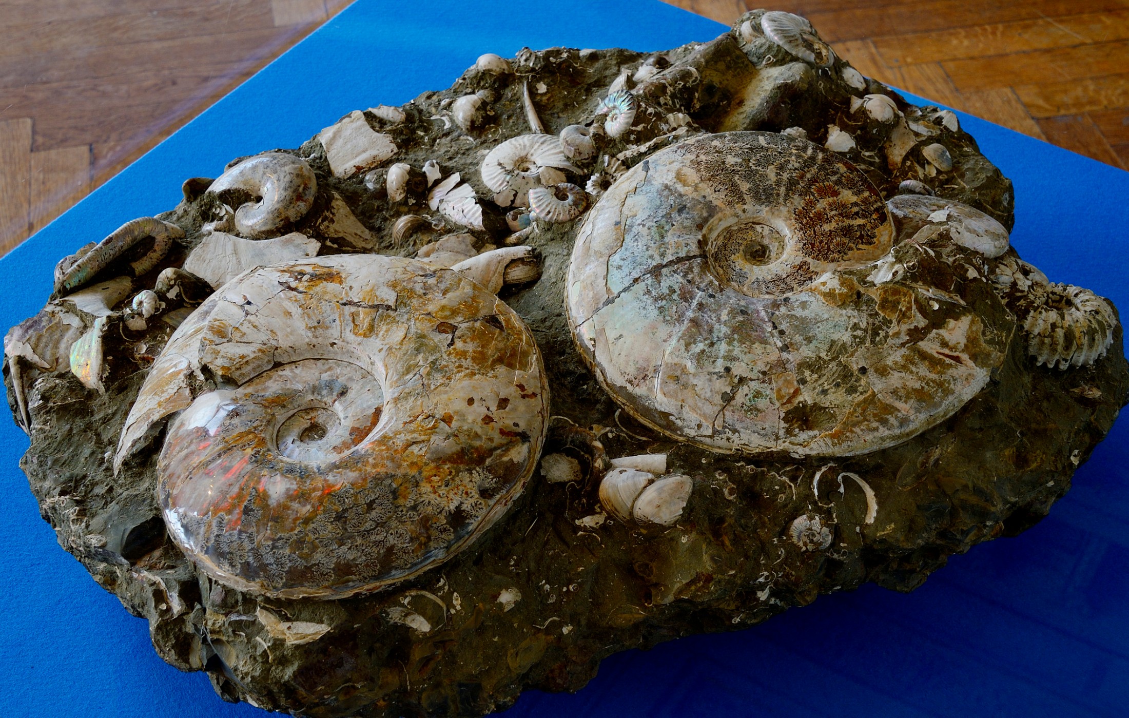 Paläontologische Präparation: Sedimentblock mit Ammoniten (Madagaskar, 110 Mio. Jahre)