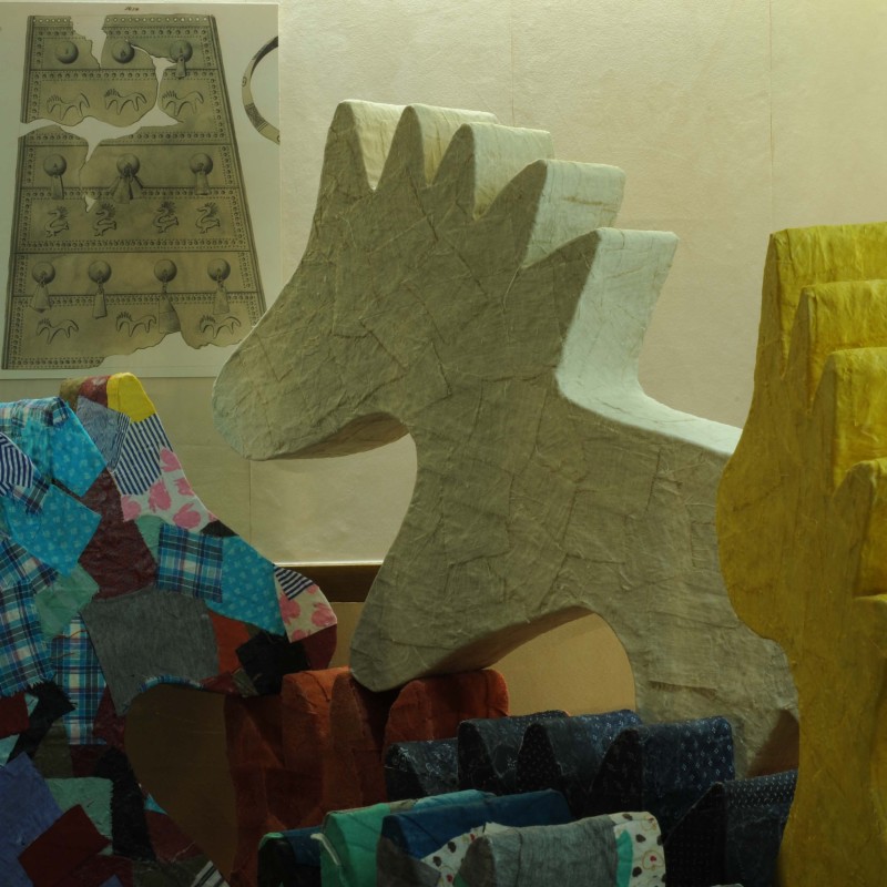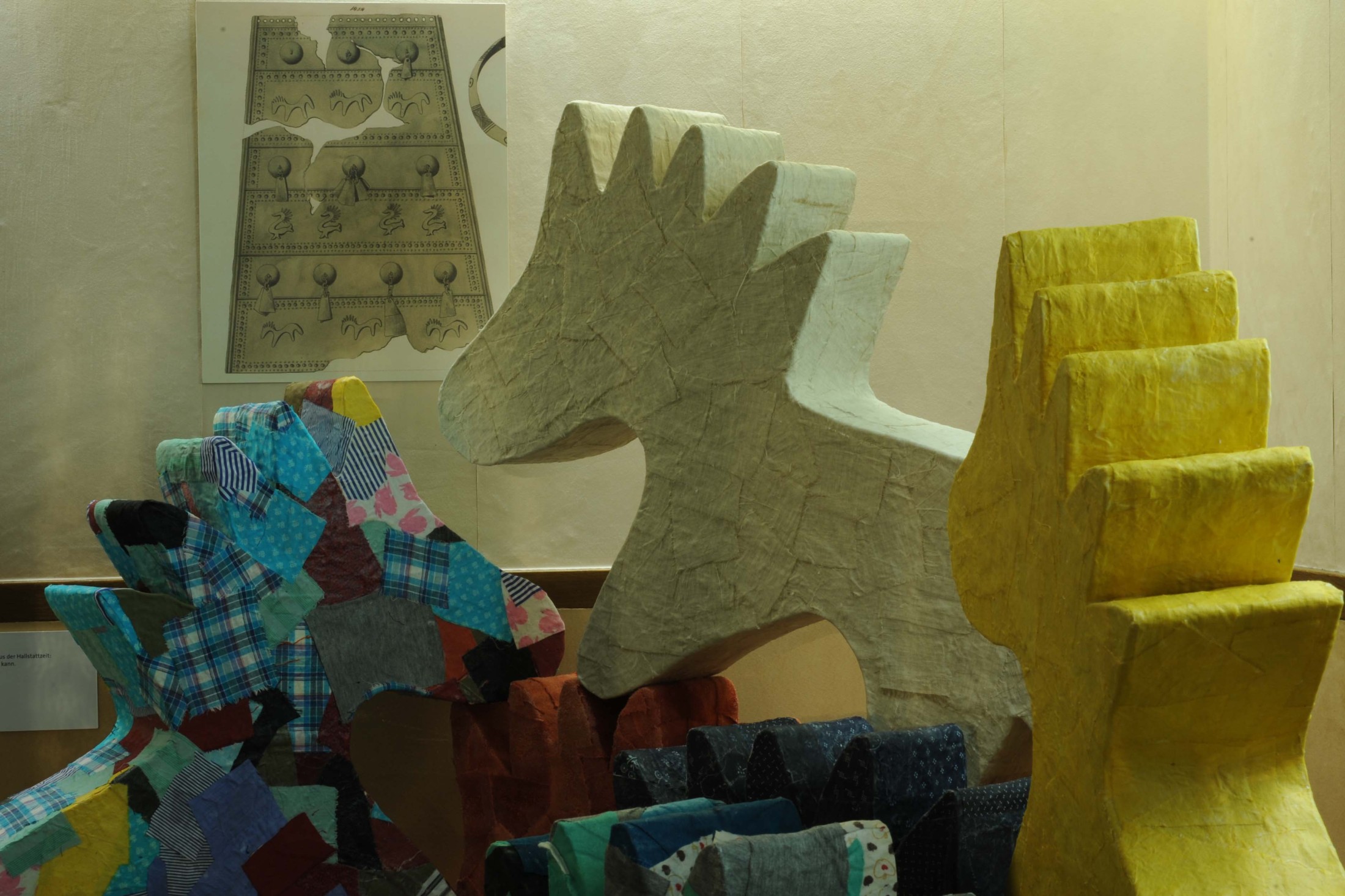 KunstprojekteStudentinnen der Universität für angewandte Kunst Wien präsentieren Arbeiten, die inspiriert von den prähistorischen Färbe- und Webtechniken im Dialog mit der Wissenschaft entstanden sind. In der Hallstattzeit wurden verschiedene Ornamente und Symbole verwendet (z. B. Dreieck, Ente, Pferd), es gibt sie vielfältig auf verschiedenen Medien (auf Keramik, Metallgegenständen?). Die Künstler haben teilweise diese Symbole aufgegriffen und zu modernen Kunstobjekten umgedeutet.