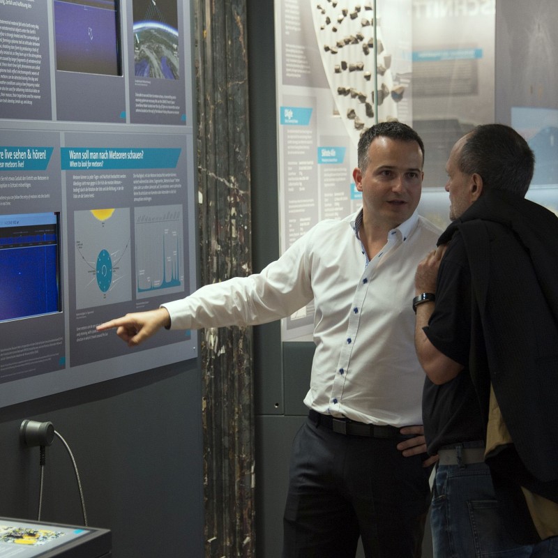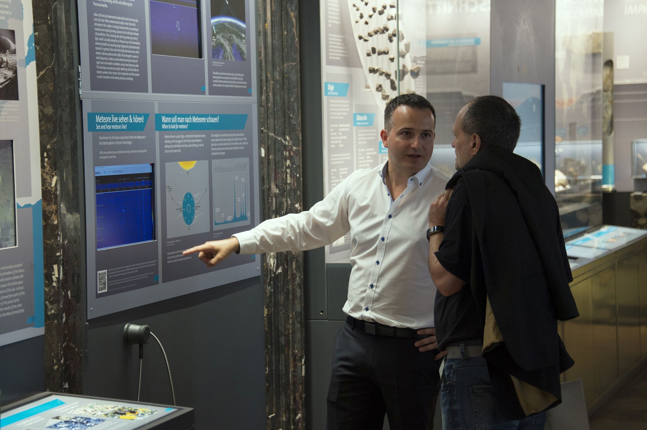 NHM Wien-Meteoritenforscher Ludovic Ferriere (li.) erklärt die Meteor-Radarstation