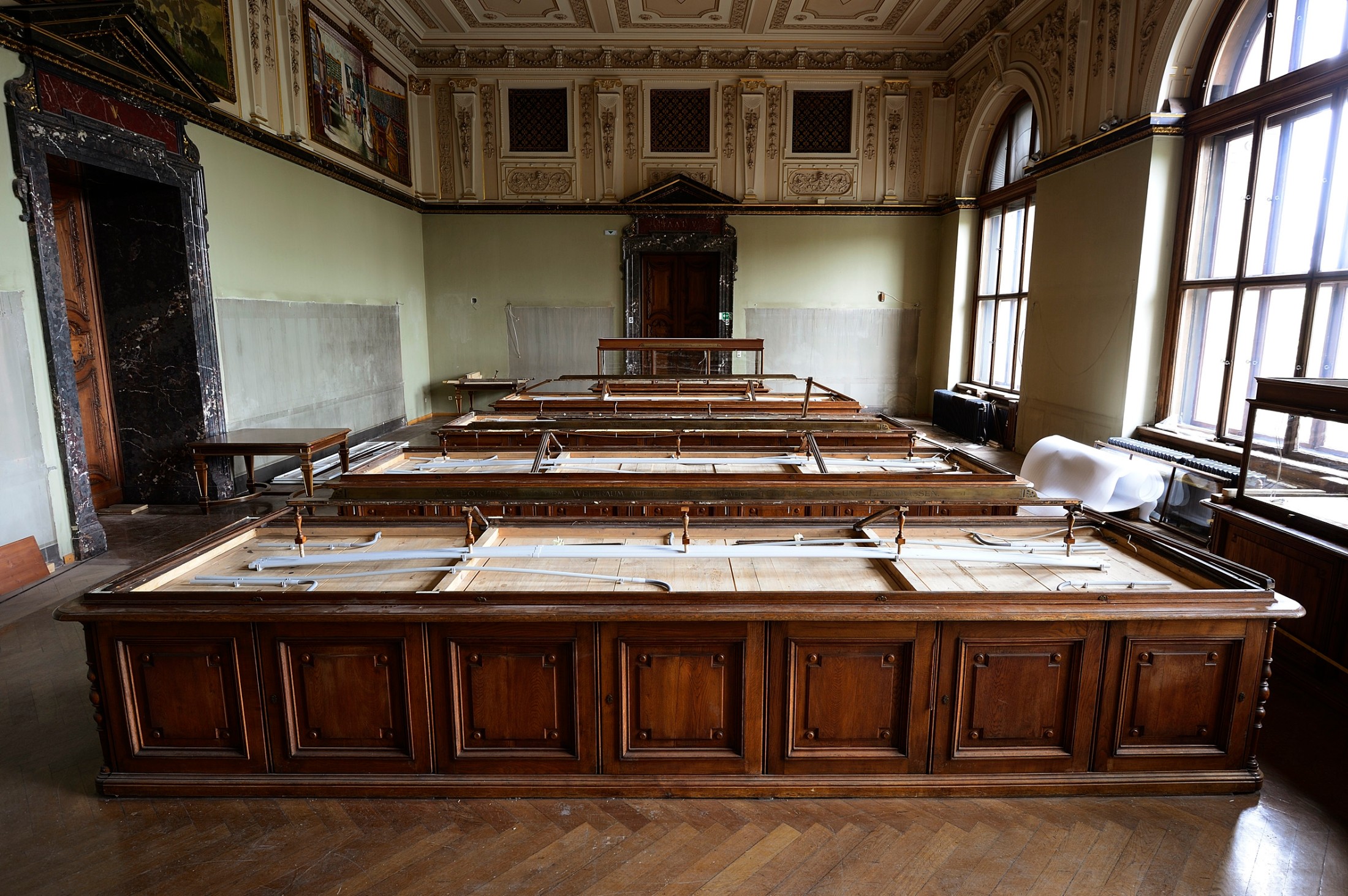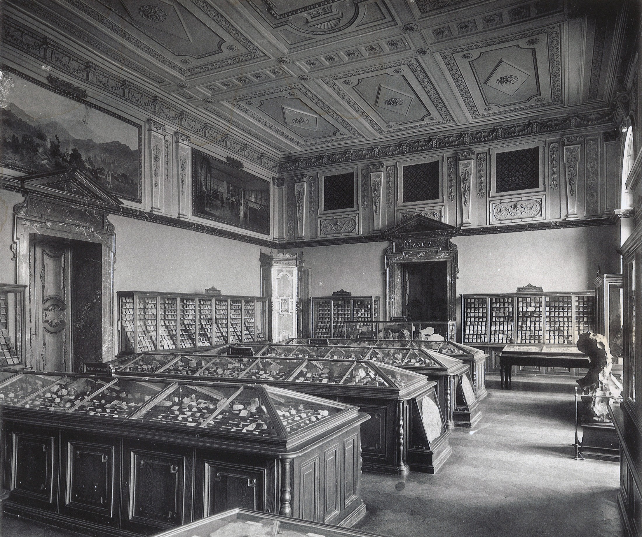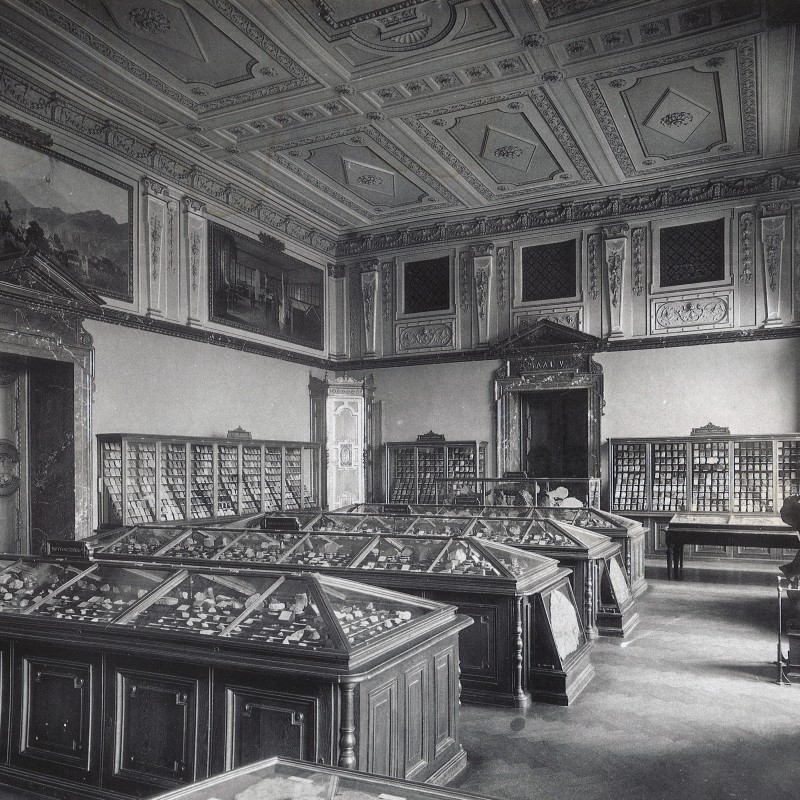 des Meteoritensaals, der aus Pultvitrinen mit Glasaufsätzen besteht. Alle bisherigen Wandvitrinen werden durch neue Medienstationen