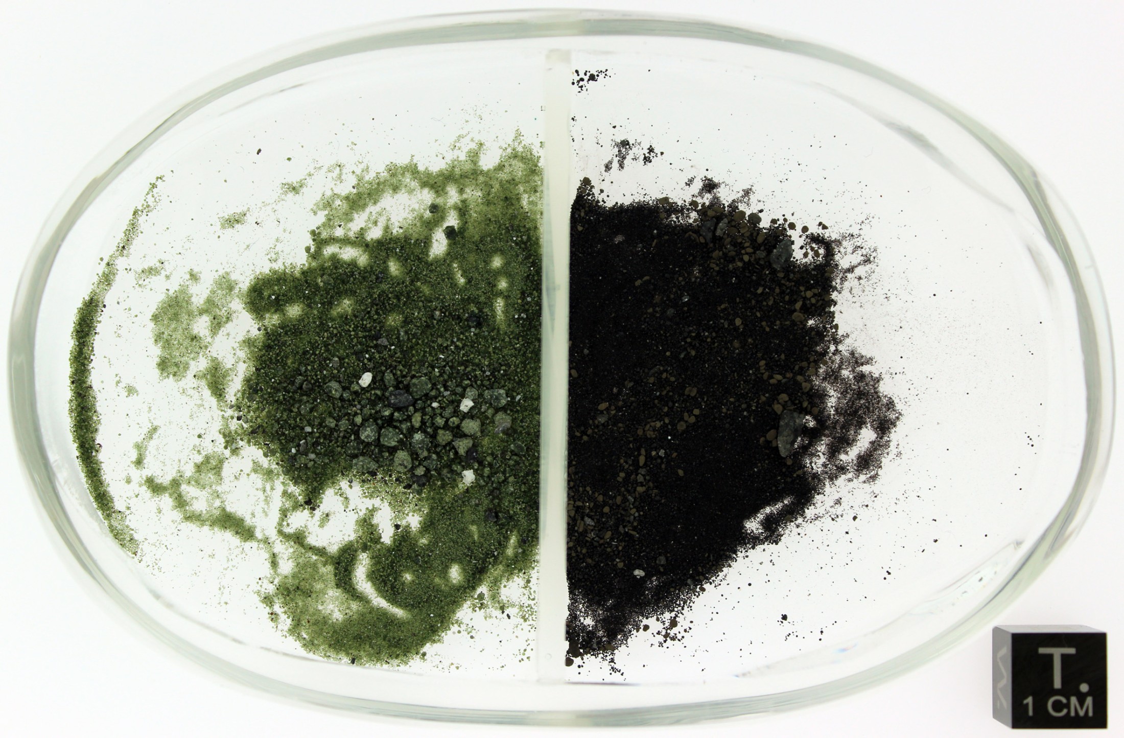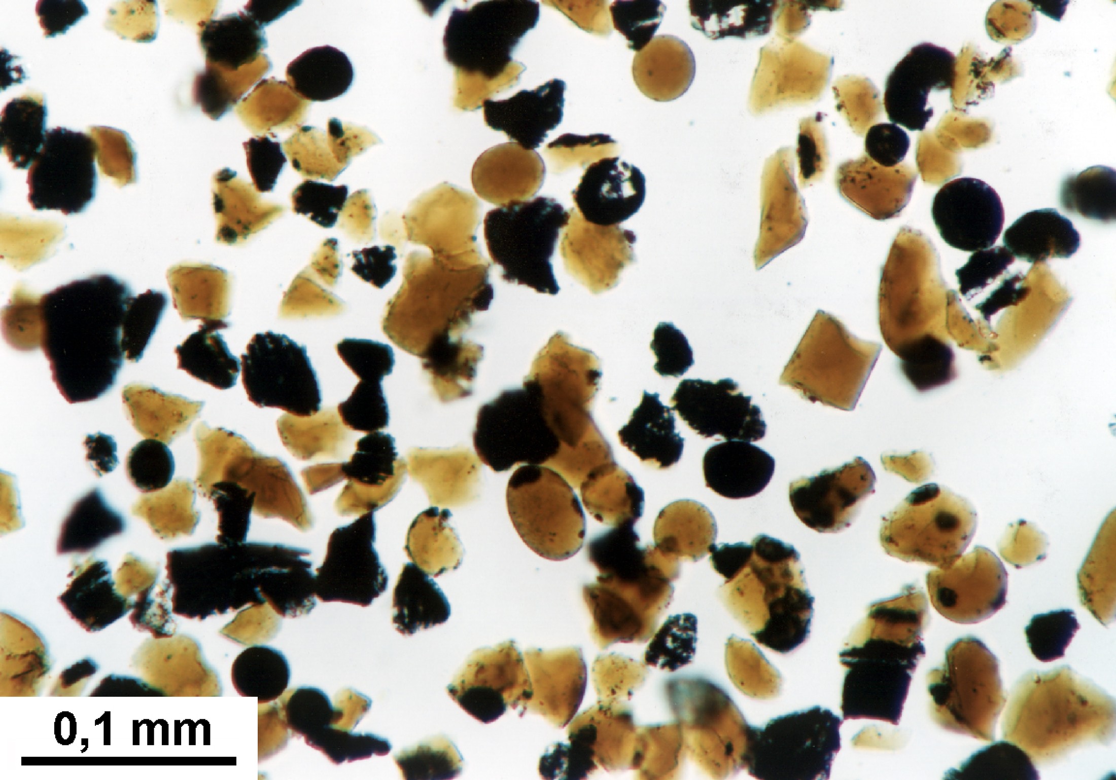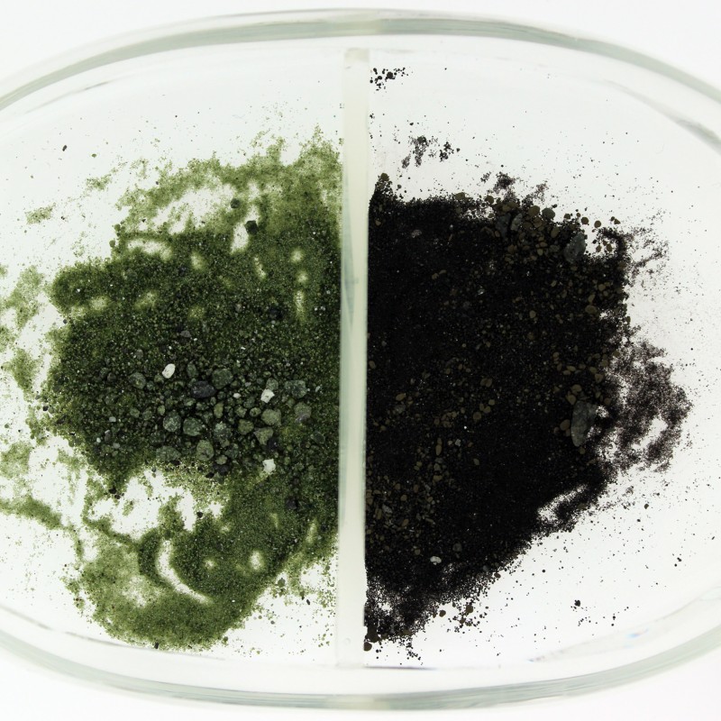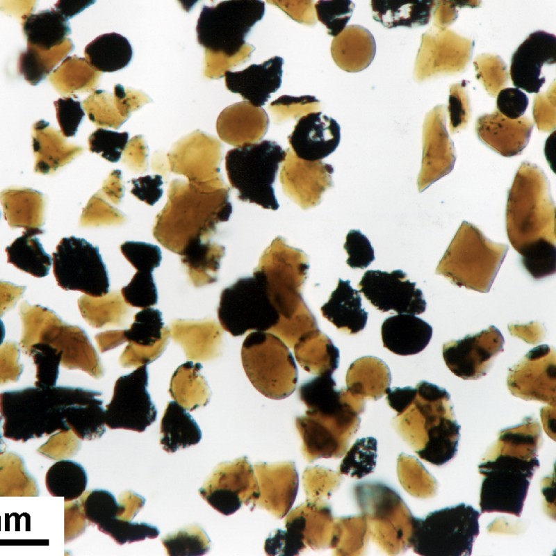 Lunare Bodenprobe mit orange/braunem vulkanischen Glaskügelchen (< 0,1 mm Durchmesser) und winzigen Gesteinsfragmenten. Aufgesammelt während der Apollo 17 Mission im Bereich des Shorty Kraters.