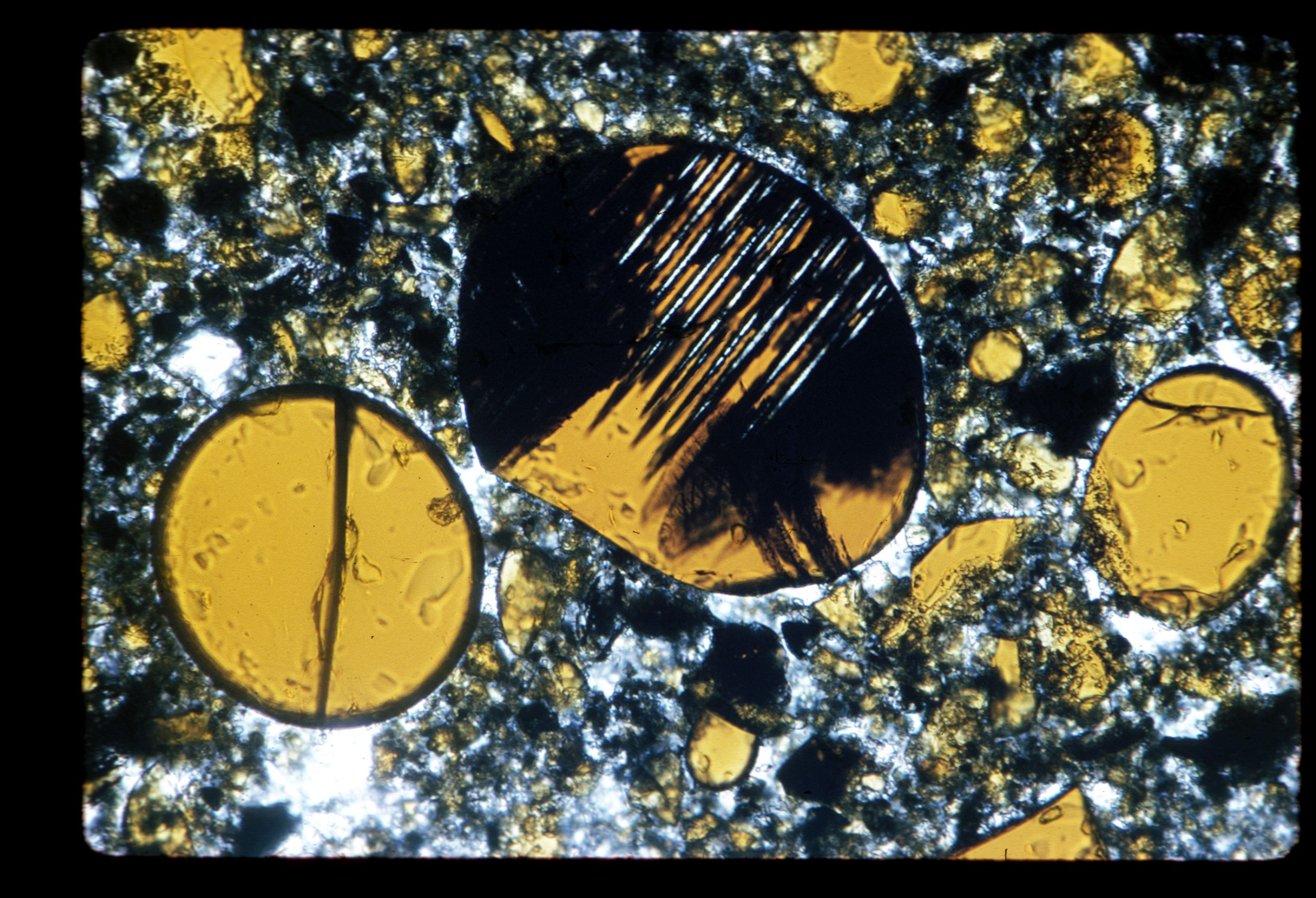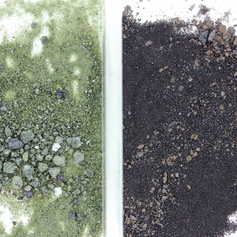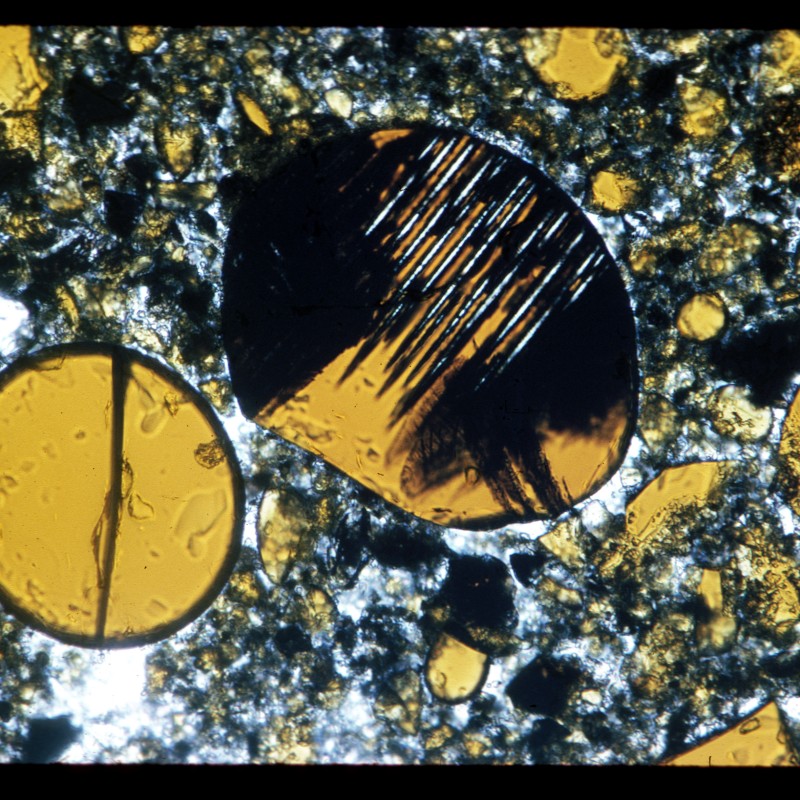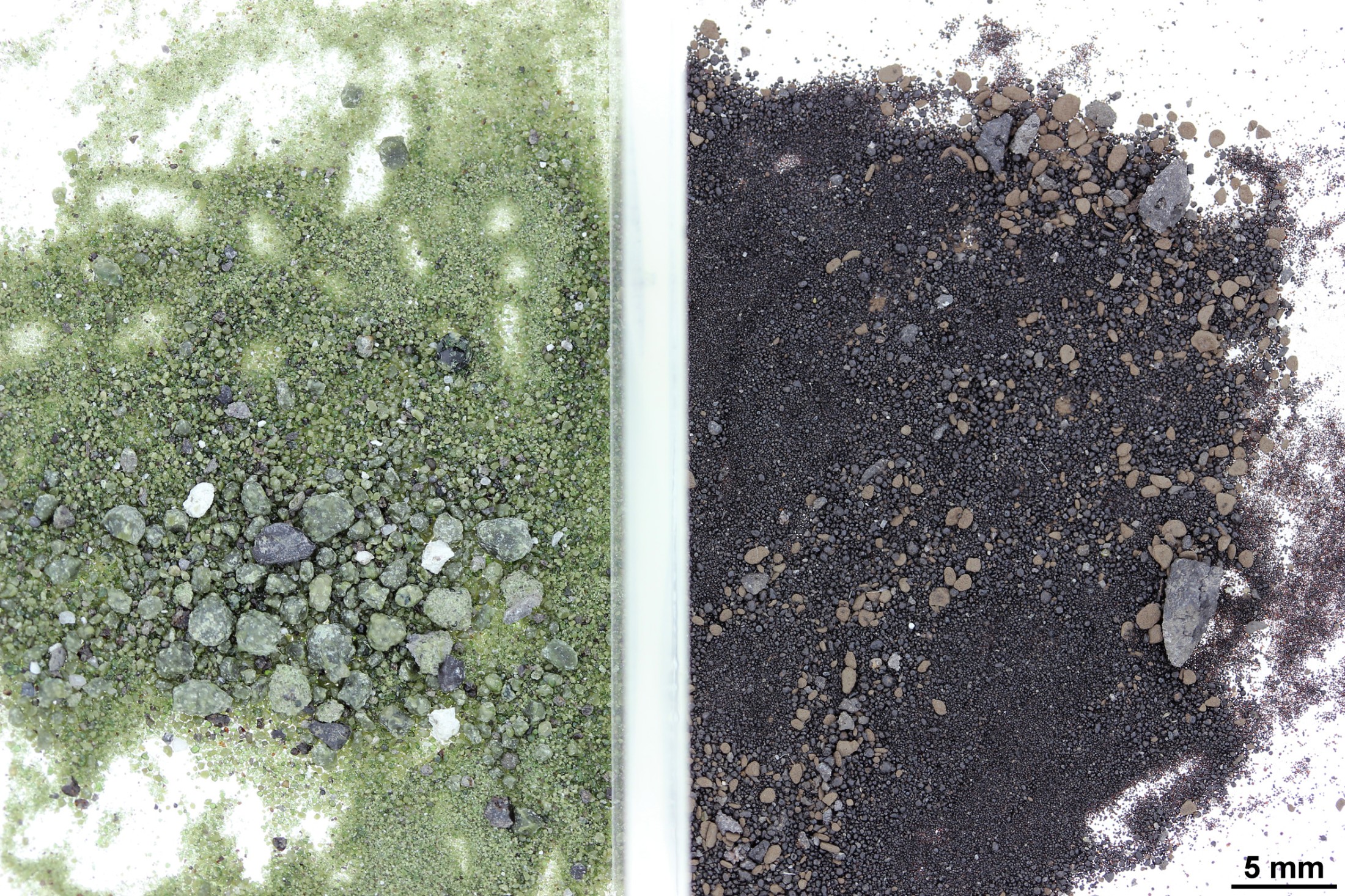 Lunare Bodenprobe mit orange/braunem vulkanischen Glaskügelchen (< 0,1 mm Durchmesser) und winzigen Gesteinsfragmenten. Aufgesammelt während der Apollo 17 Mission im Bereich des Shorty Kraters.