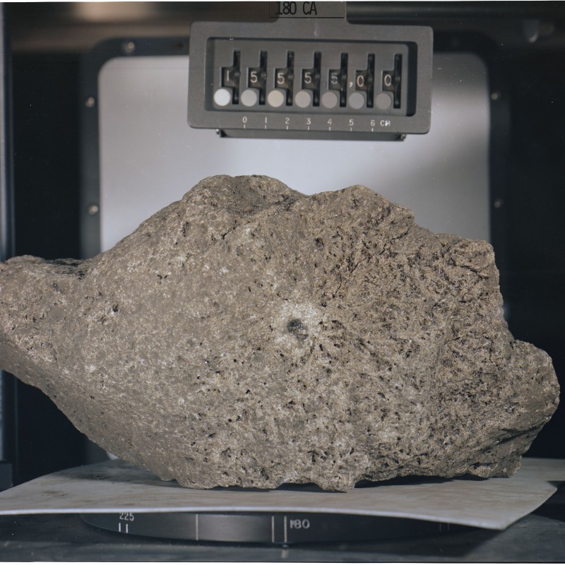 Mare-Basalt #15555, aufgesammelt vom Astronauten David Scott während der Apollo 15-Mission. Der ca. 9 kg schwere Basaltbrocken stellt eine der größten je vom Mond zurück gebrachten Gesteinsproben dar.