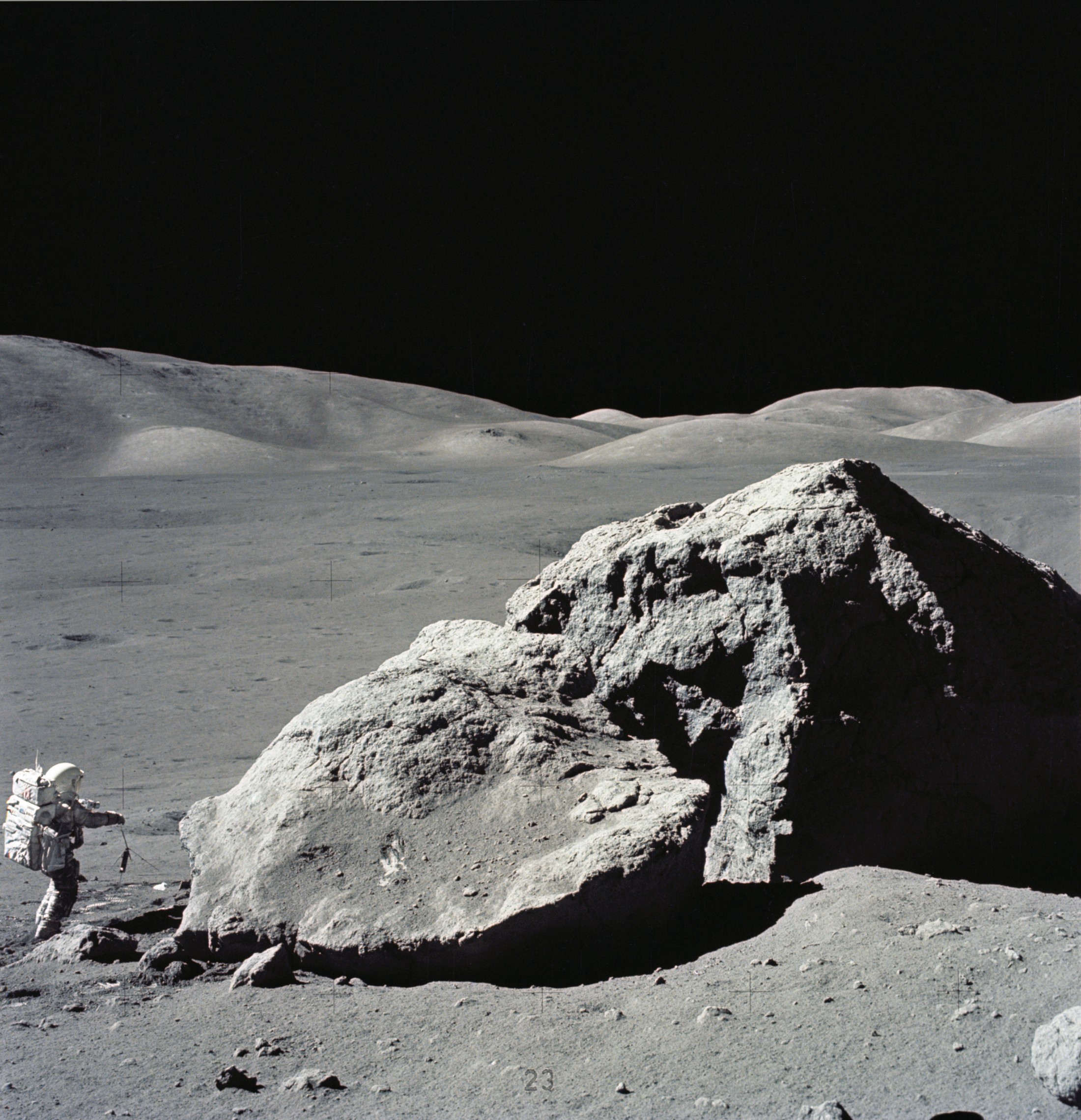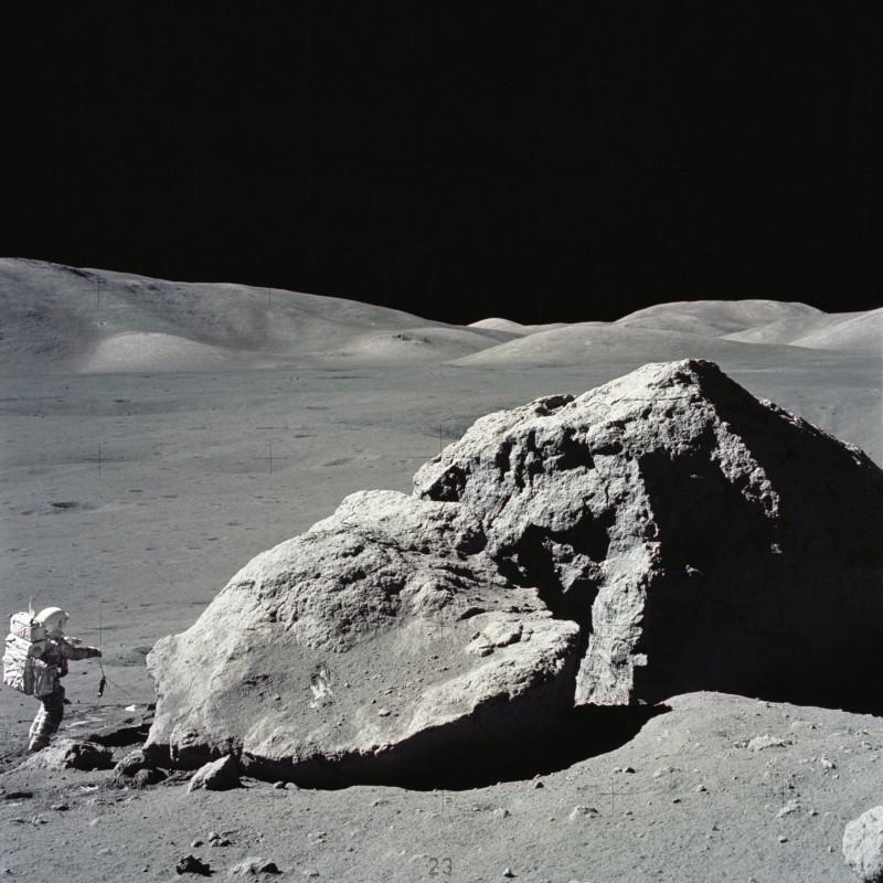 Apollo 17: Der Wissenschafts-Astronaut Harrison H. Schmitt neben einem riesigen Felsbrocken nahe der Landestelle in der Taurus-Littrow-Region.