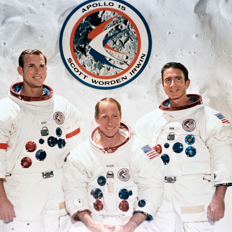 Die Besatzung der Apollo 15-Mission bestehend aus David R. Scott (links), Alfred M. Worden (Mitte) und James B. Irwin.