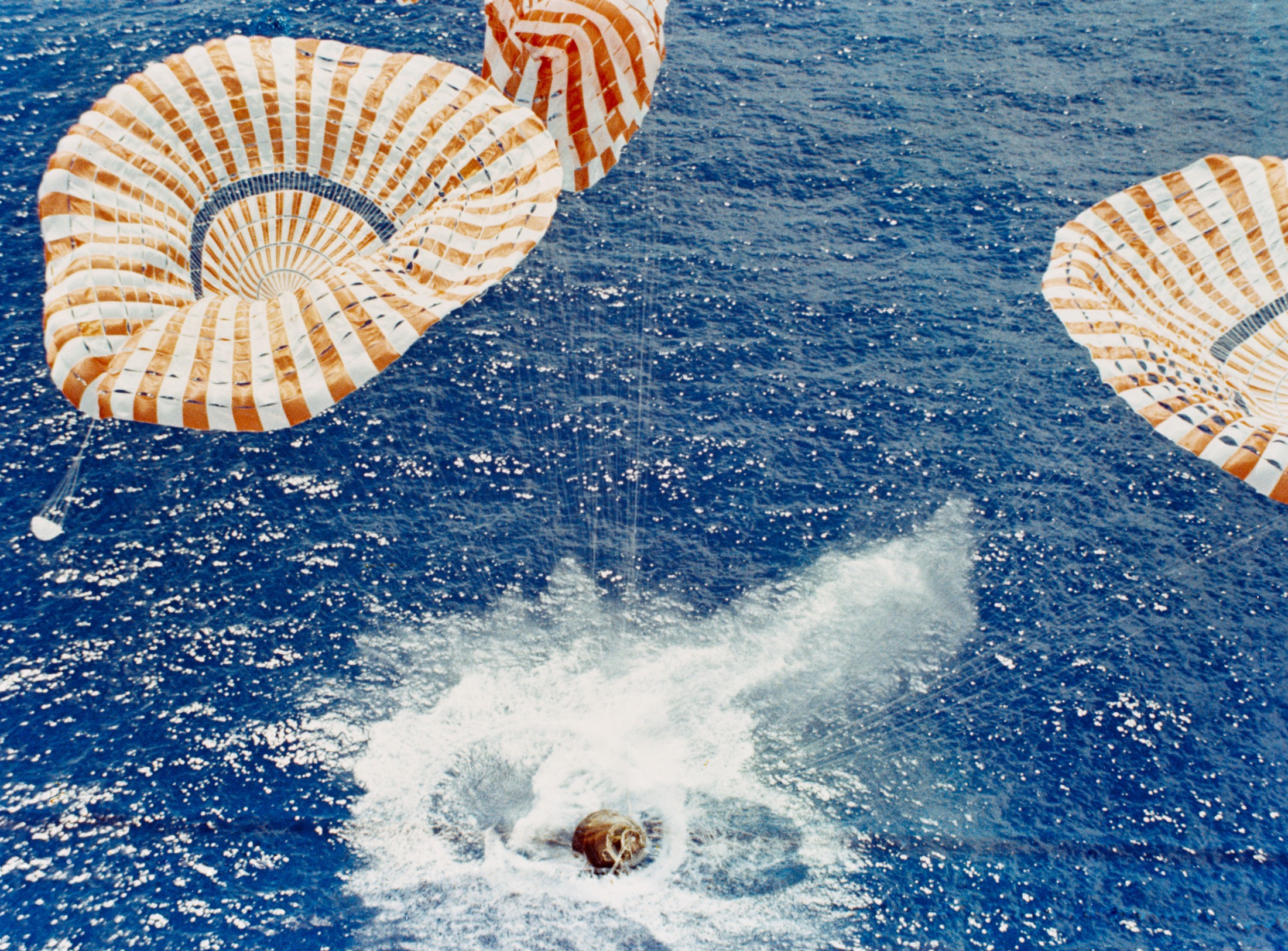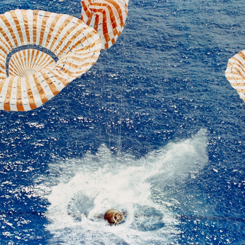 Apollo 15: Wasserung der Kapsel mit den drei Astronauten im Pazifik am 7. August 1971.