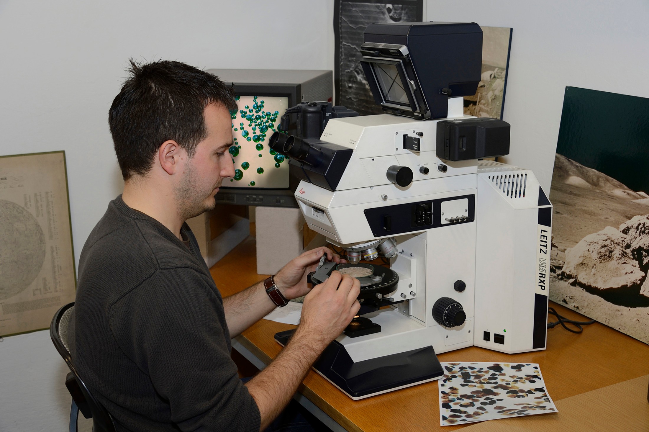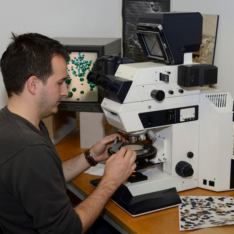 Dr. Ludovic Ferrière, Kurator der Gesteinssammlung und Co-Kurator der Meteoritensammlung im NHM, untersucht die Mondgesteinsproben mit dem Mikroskop und bereitet die Proben für die Ausstellung vor.