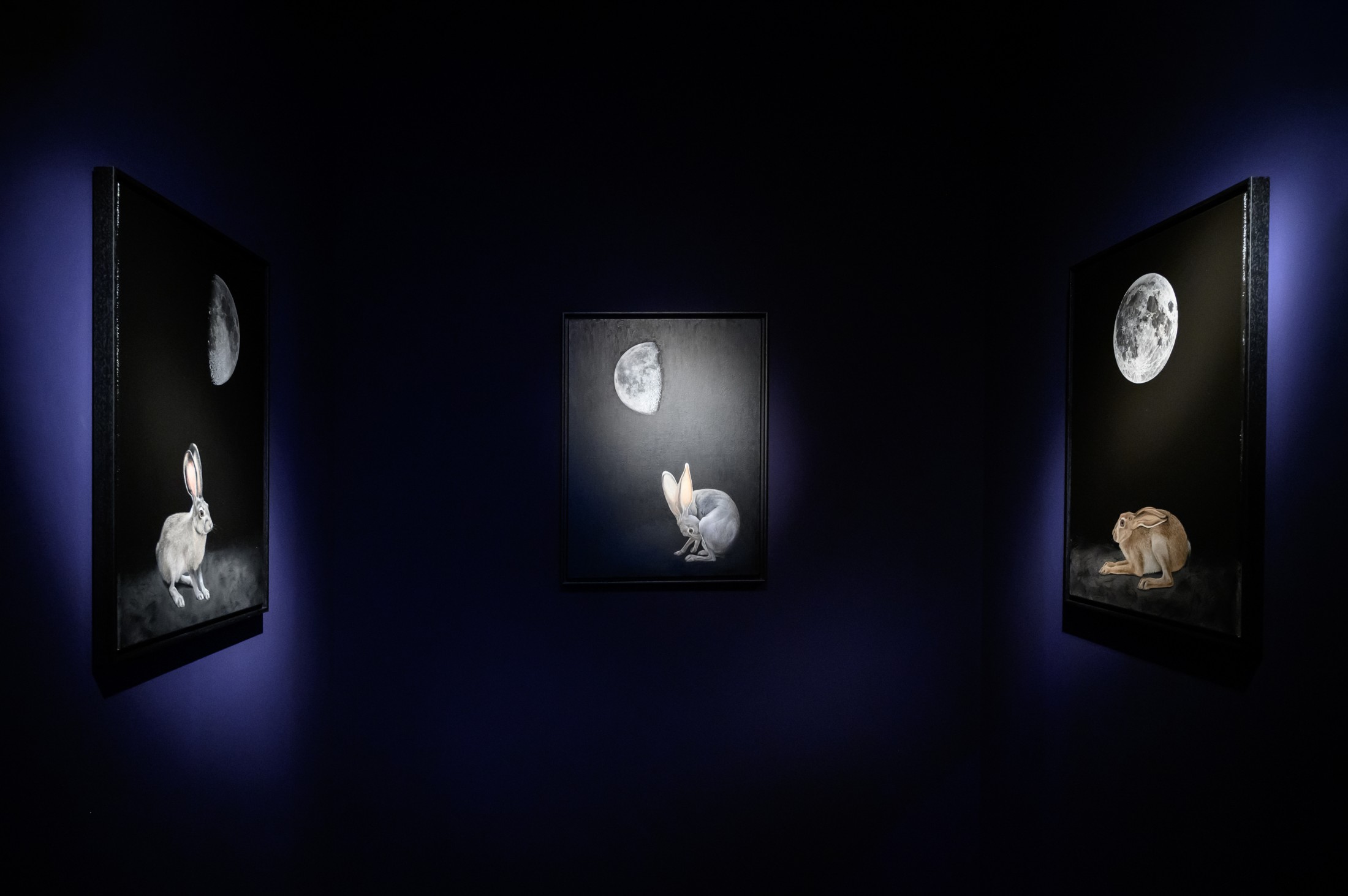 „Sister Hares and Their Moon“, Dona Jalufka, 2016-2019, Öl auf Leinwand, 60 x 80 cm
