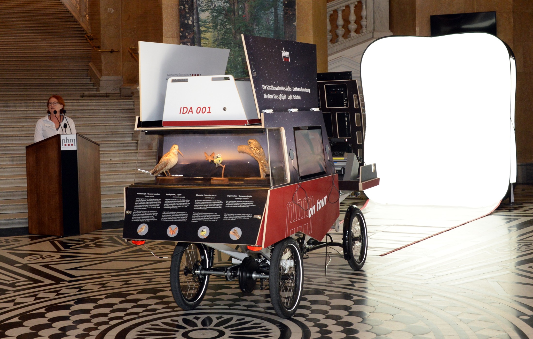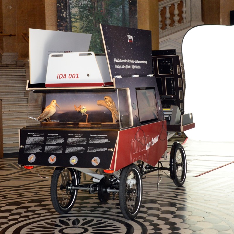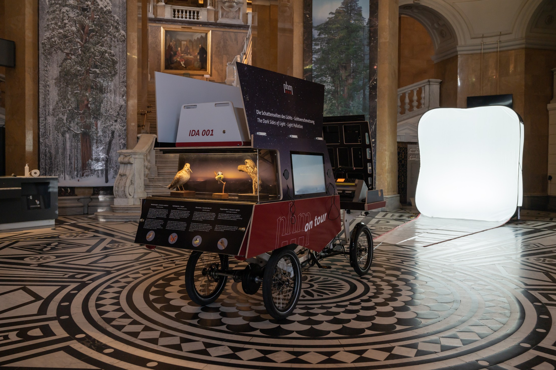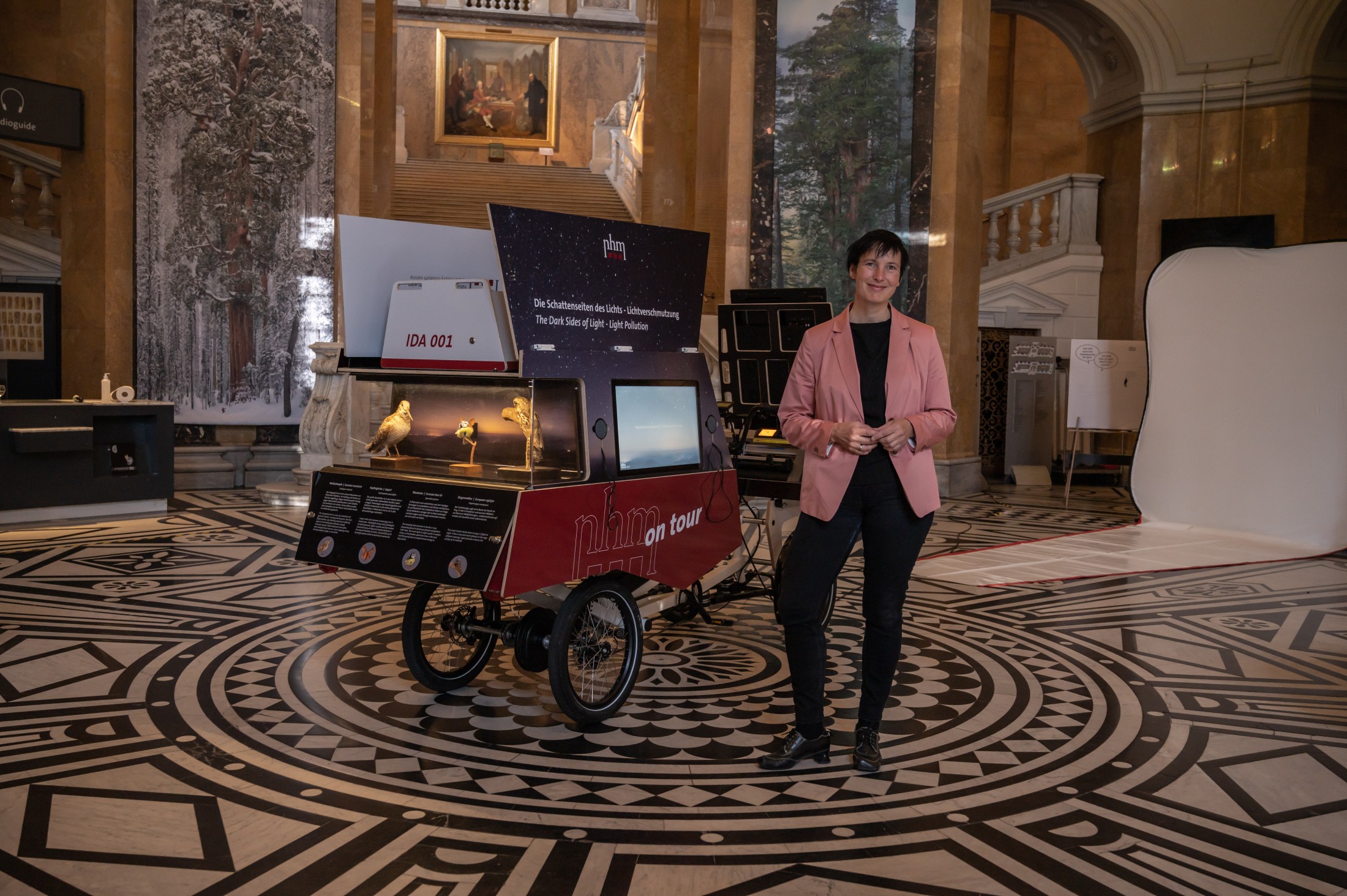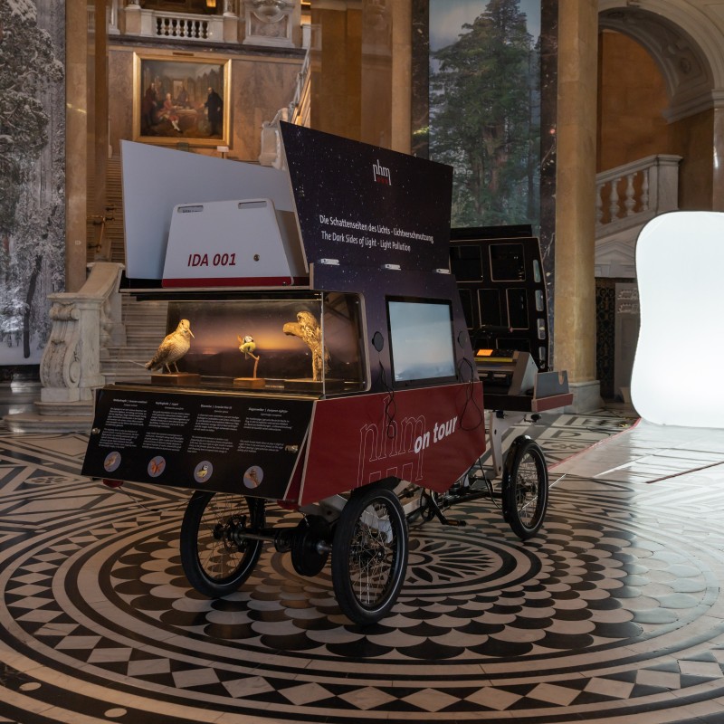 Die Fahrrad-Boten des Wissens, also die Museumspädagog*innen des NHM Wien, werden einerseits über die Auswirkungen von Kunstlicht auf Menschen und Natur informieren und andererseits zur kritischen Auseinandersetzung mit der eigenen Rolle sowie zu gesellschaftlichen Debatten anregen. An Exponaten zeigt das Museum Insekten und Vögel, die nachweislich von Lichtverschmutzung betroffen sind.