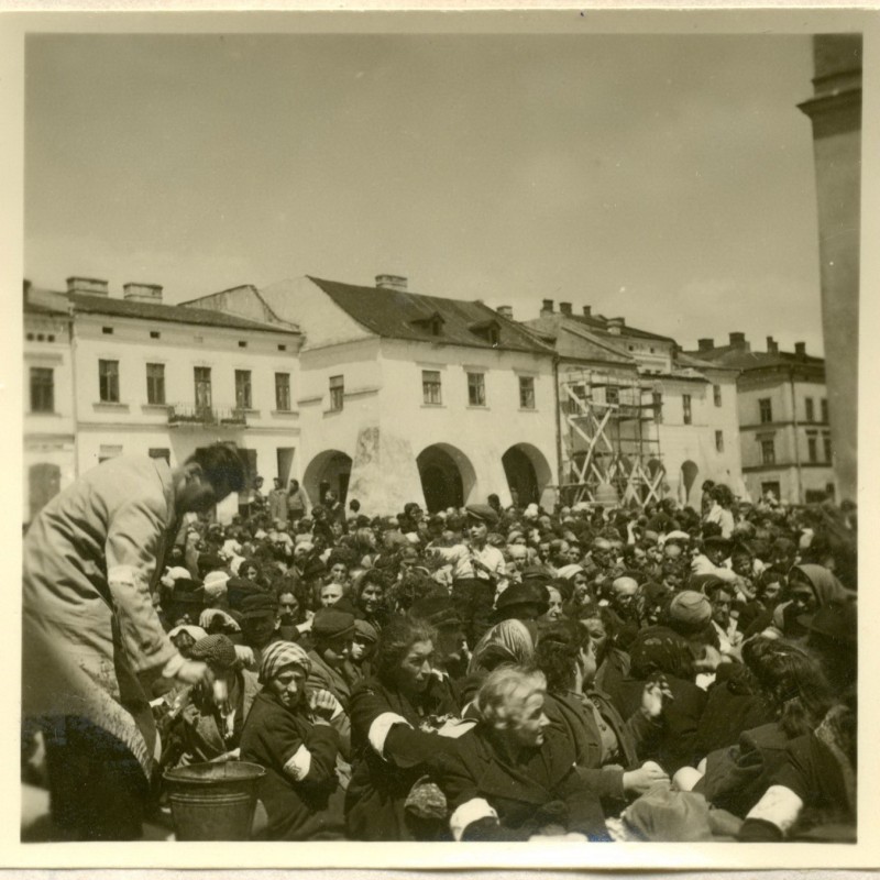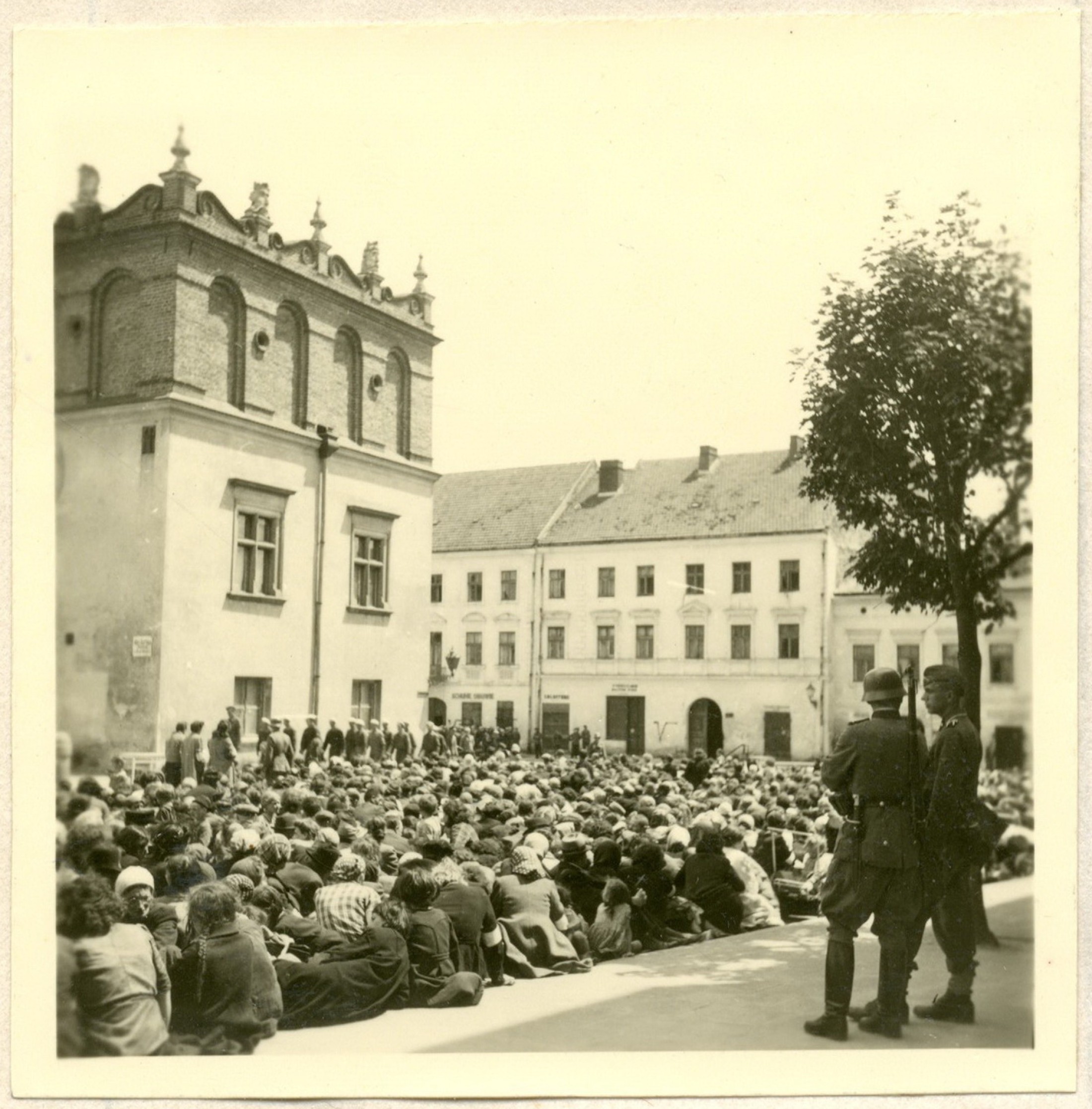 Zusammengetriebene Juden auf dem Tarnówer Marktplatz im Juni 1942