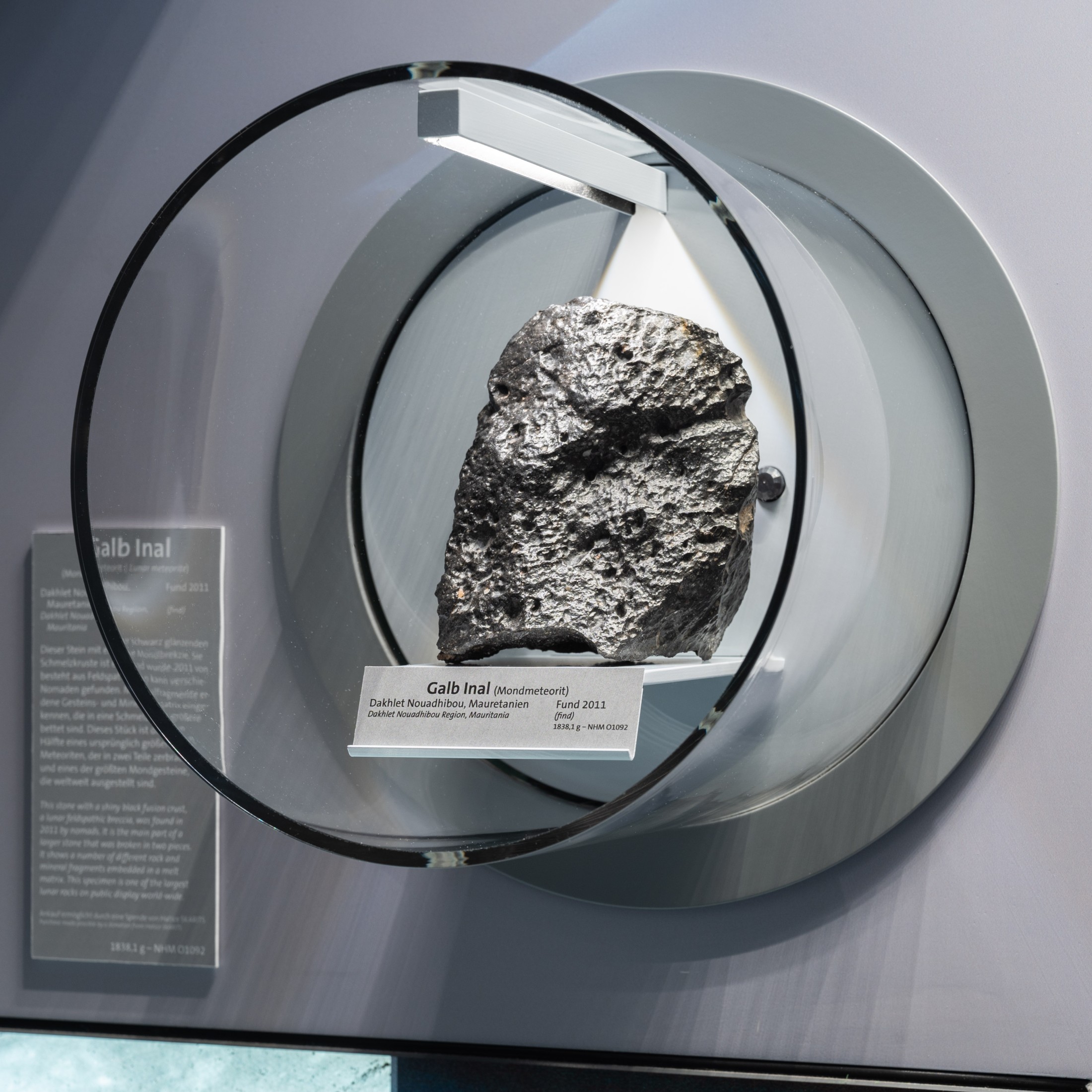 im Meteoritensaal des NHM Wien zu sehen. Mit einem Gewicht von fast 2 kg ist der Meteorit eines der größten Mondgesteine,